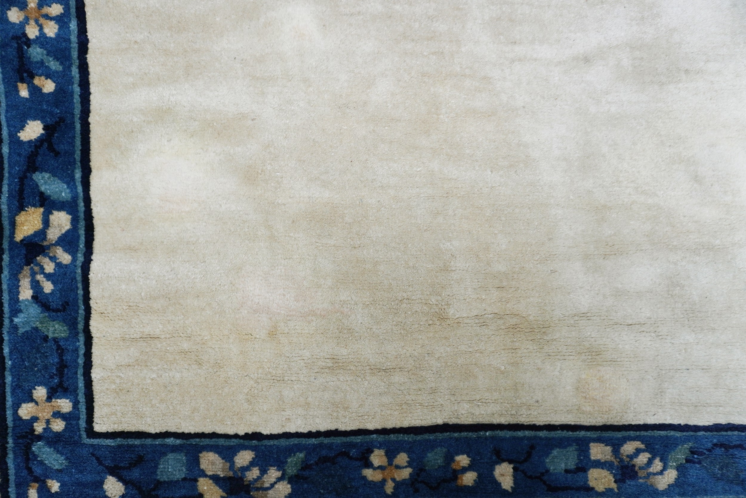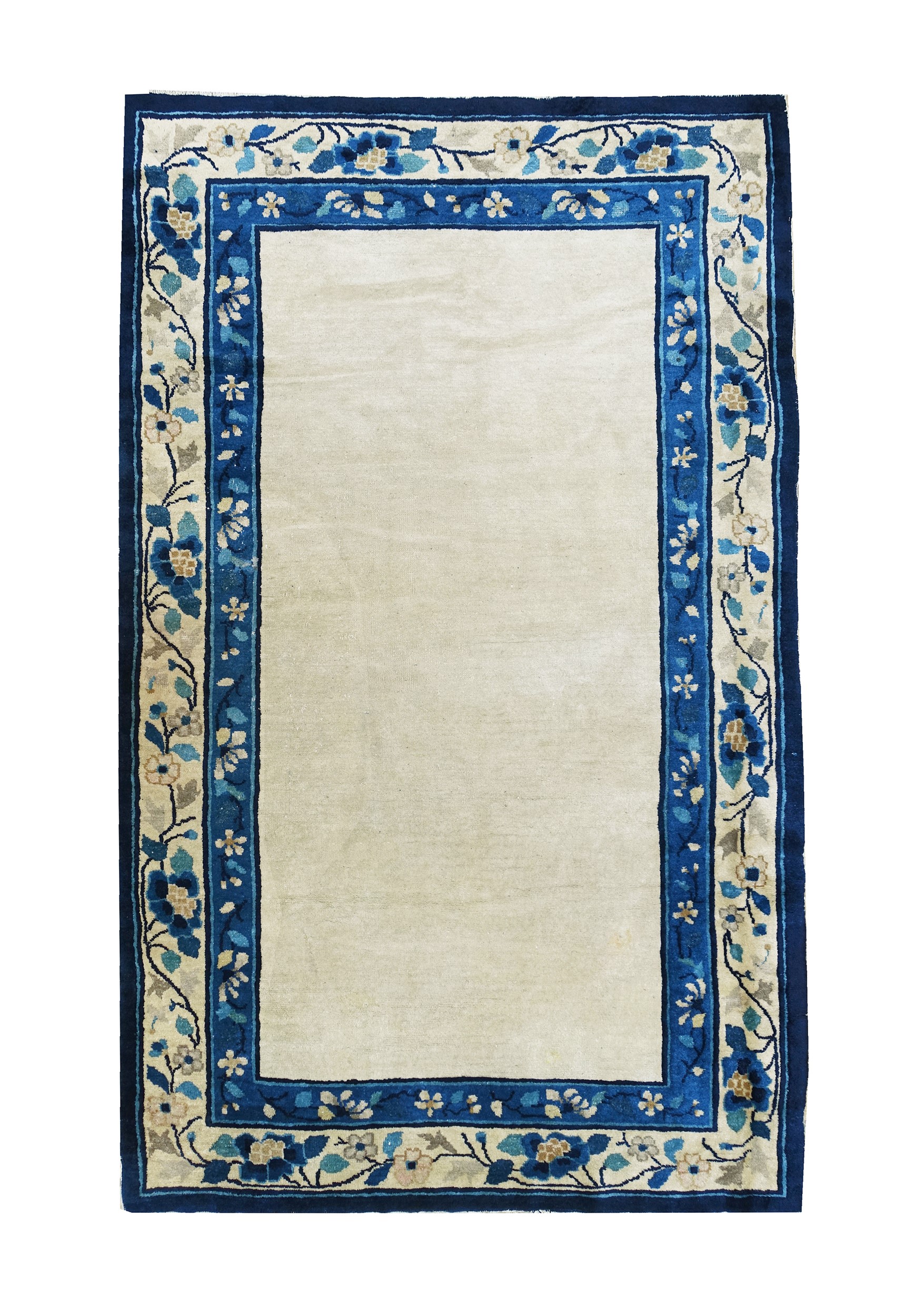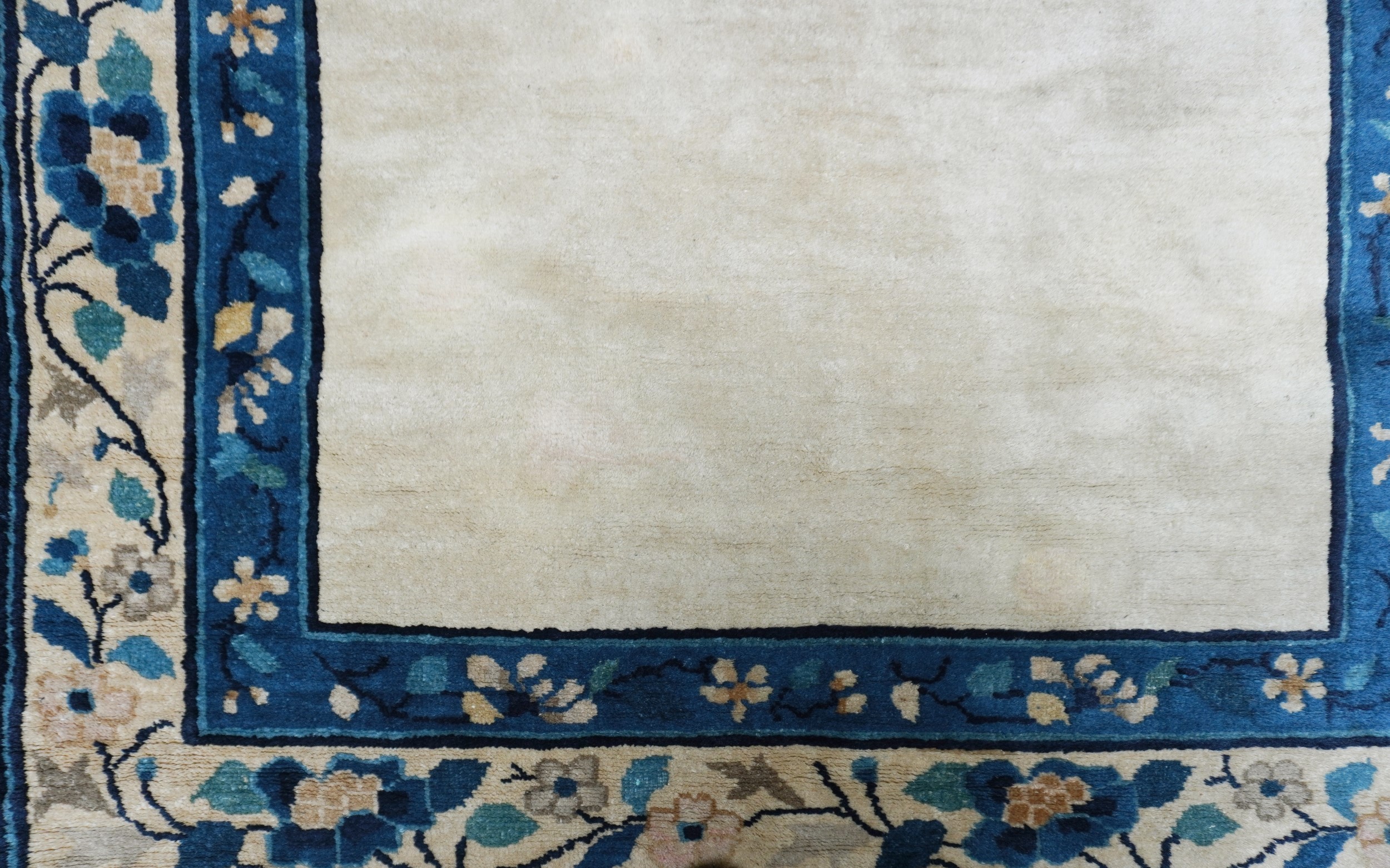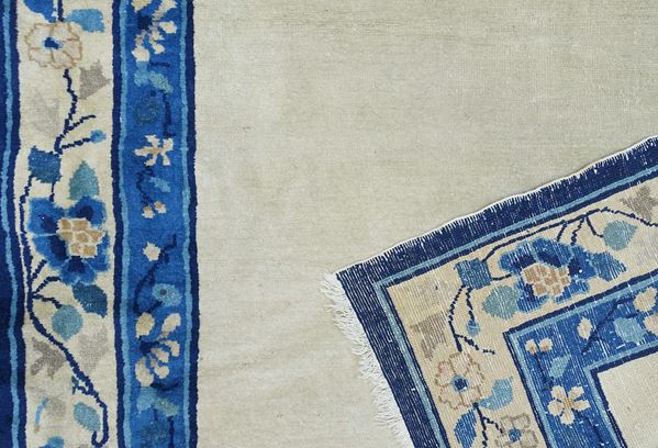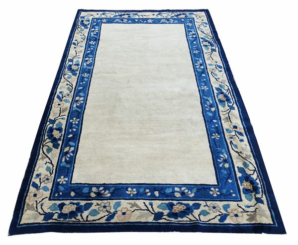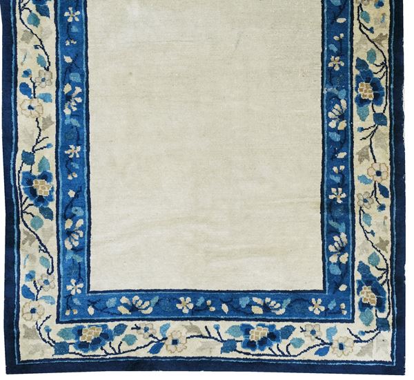 A Peking rug with rare open field design in monocrome beige-ivory wools background. The border frame shows stylized floral ornamenations in different shades of blue.