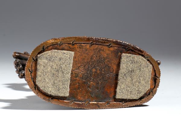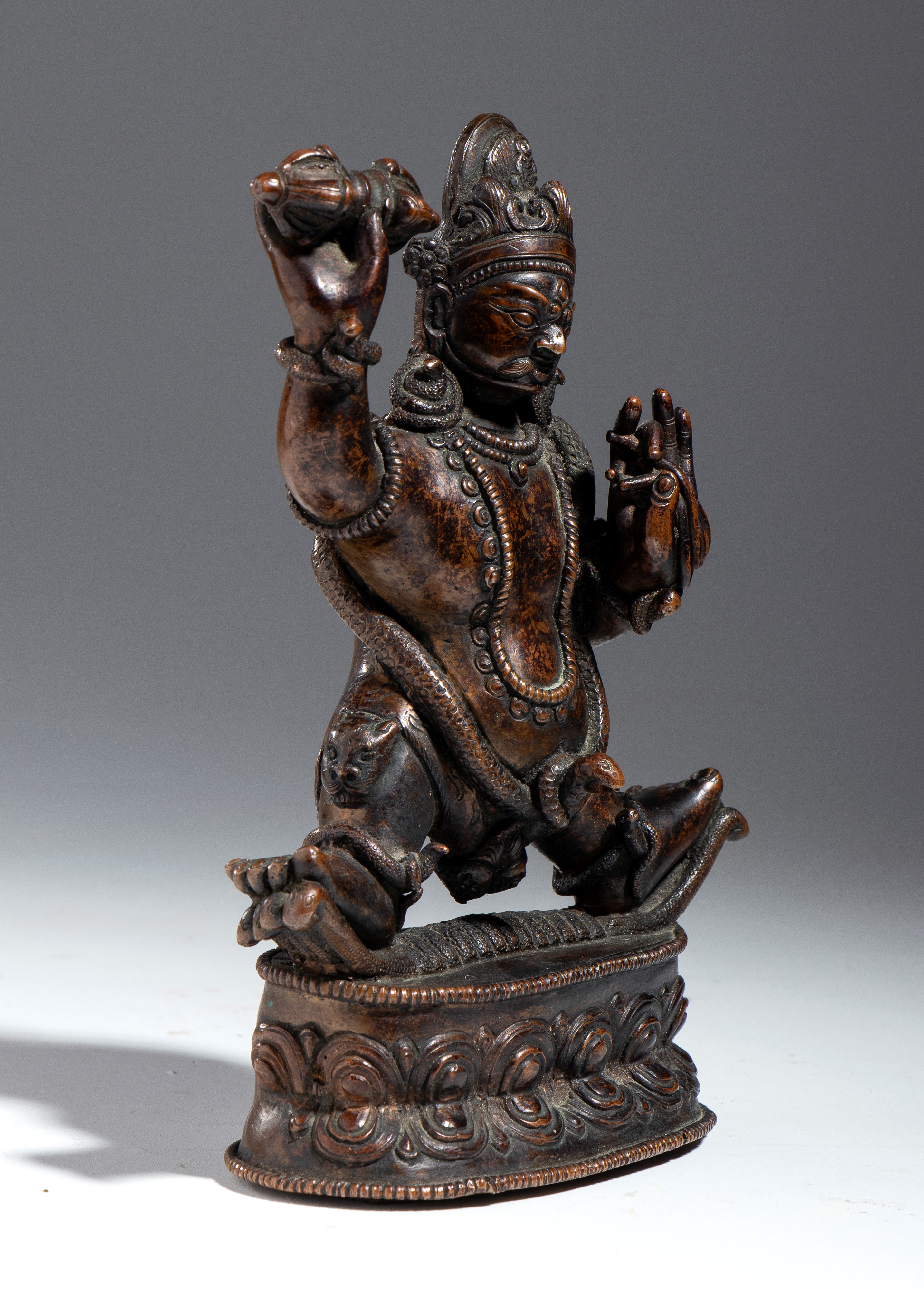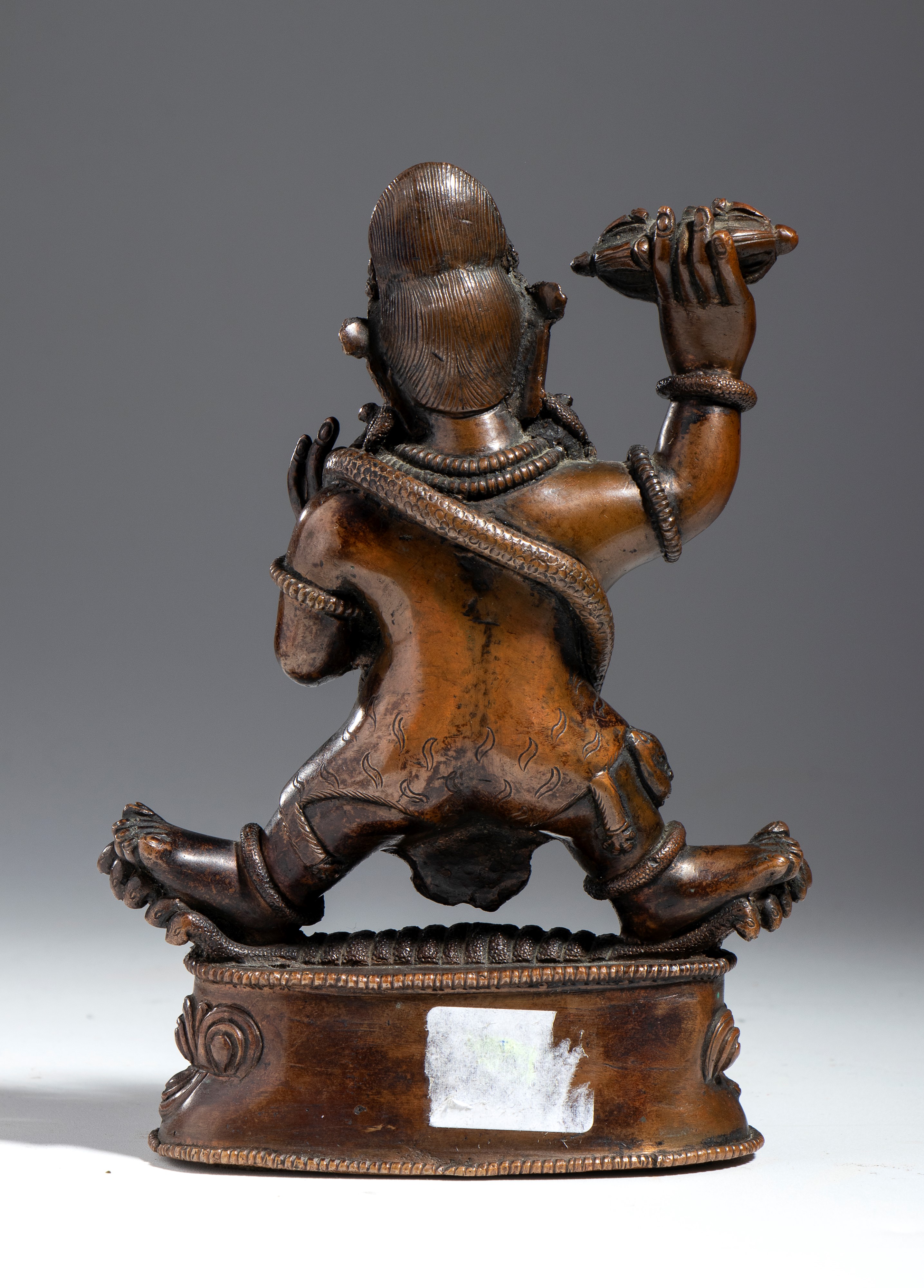 Standing on a double lotus base, his legs in the pratyalidha position, he holds a vajra in his right hand and a noose (pasa) in his left. His chest is adorned with a snake necklace, and his semi-angry face features silver inlays. An inscription is engraved on the back of the base.