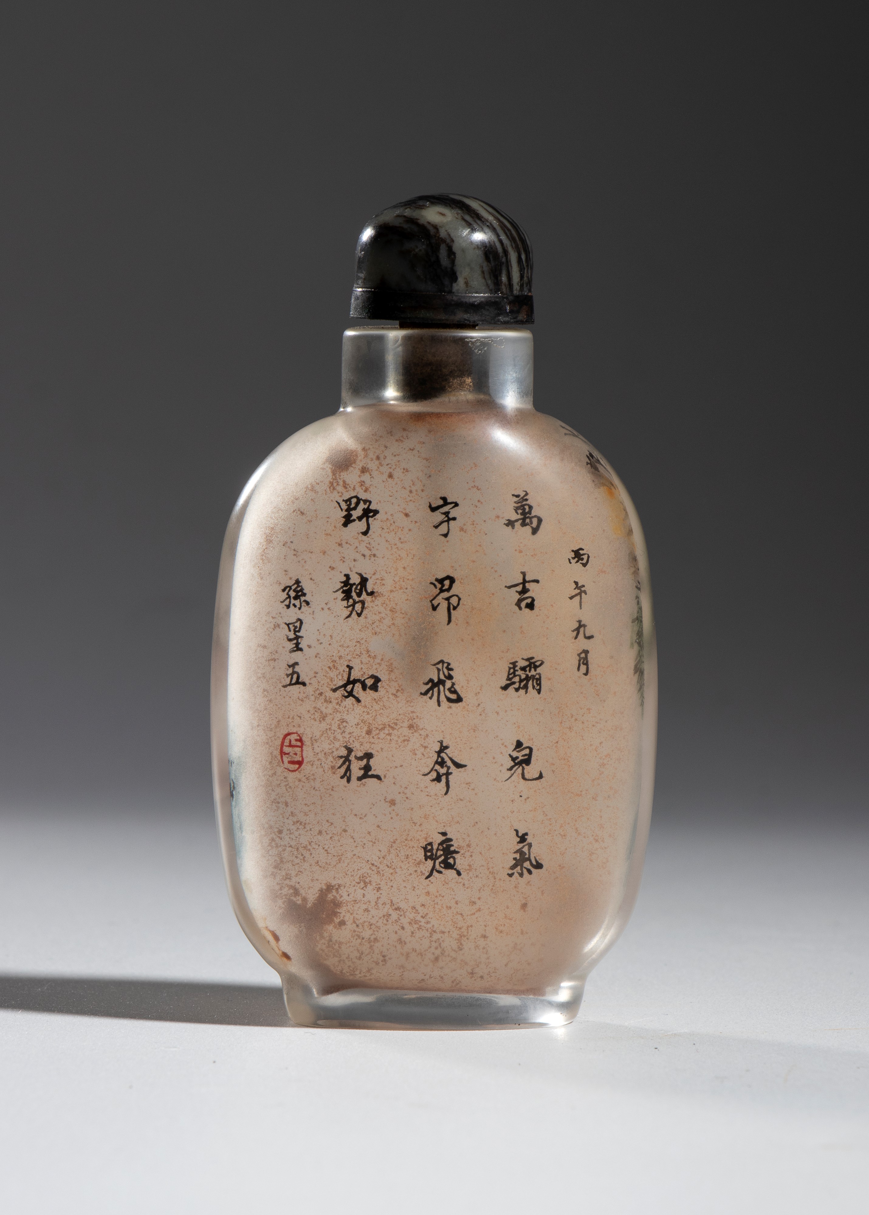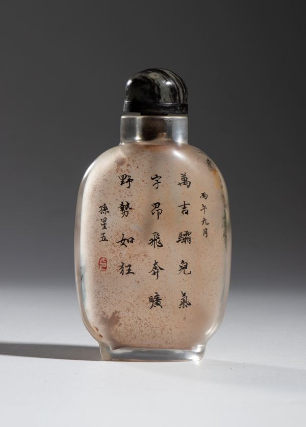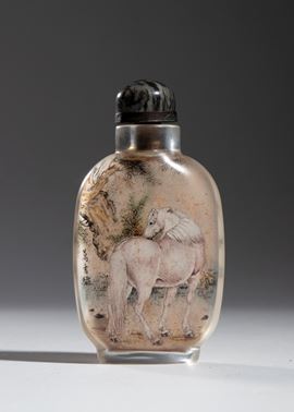 Glass snuffbox painted inside depicting a refined horse with calligraphy on the back.