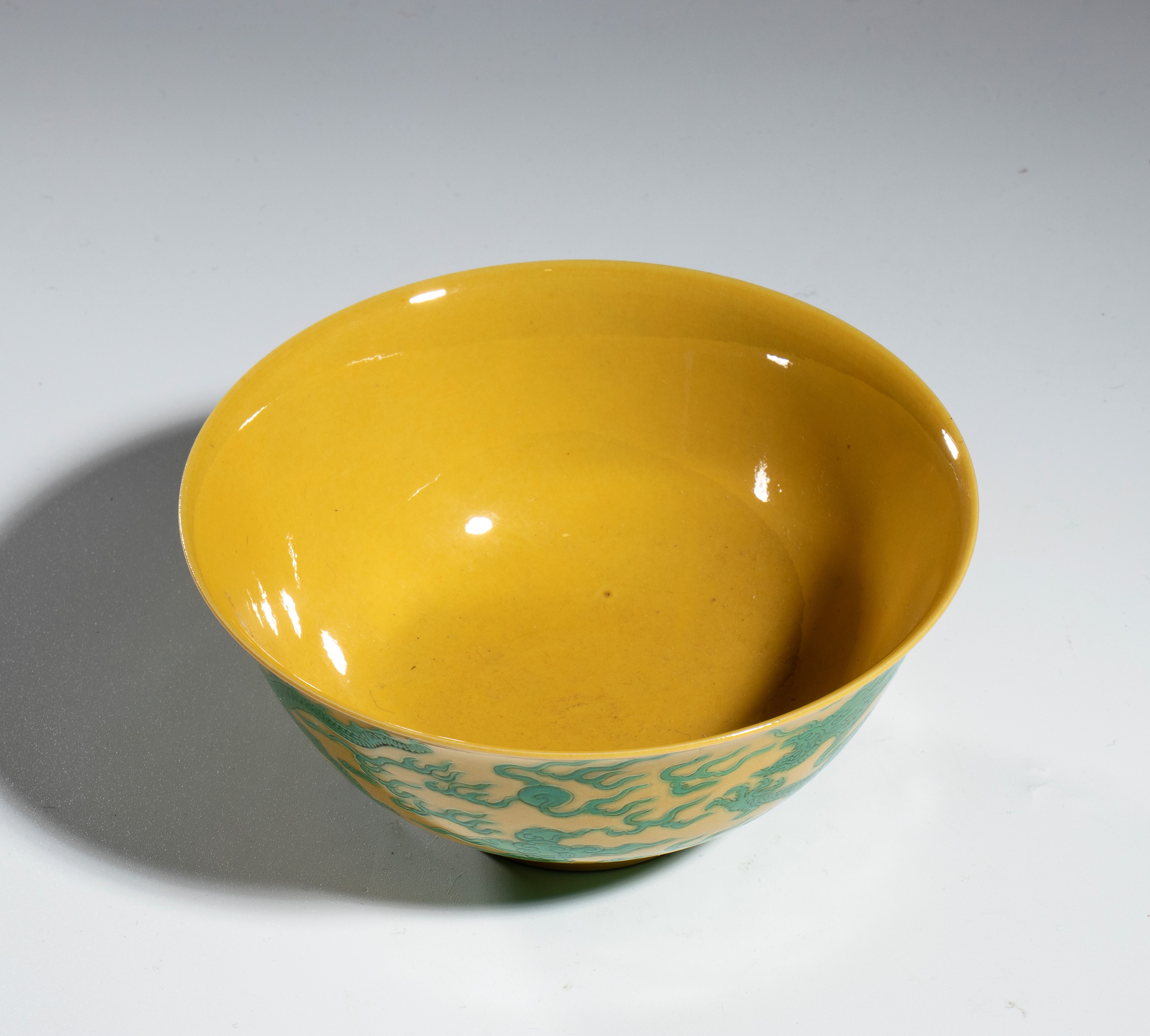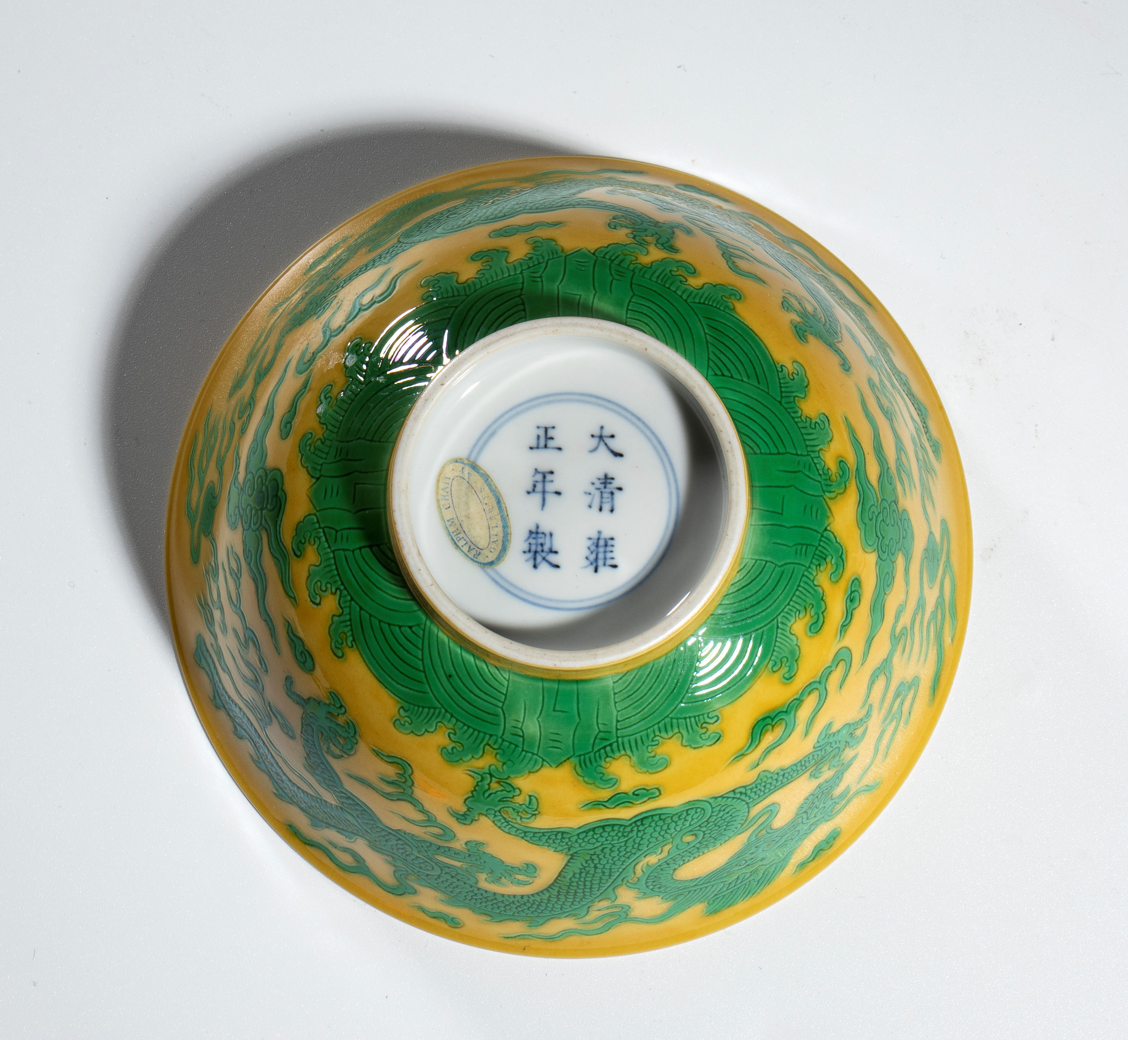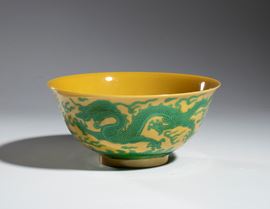 Green glazed dragon bowl with yellow ground and six-character Yongshenga mark of the period.