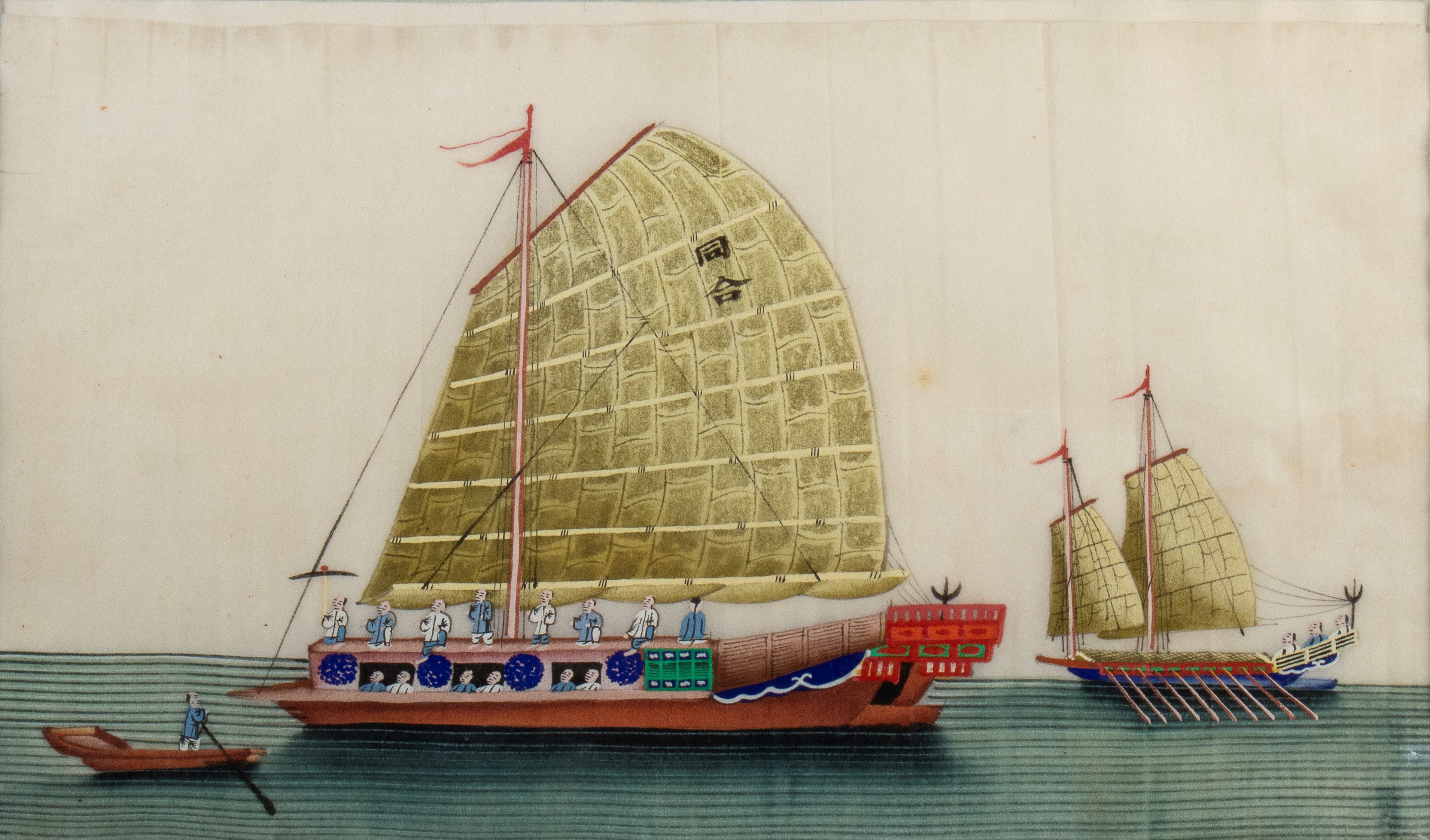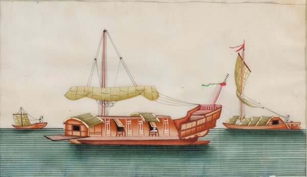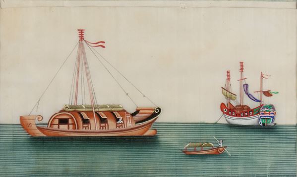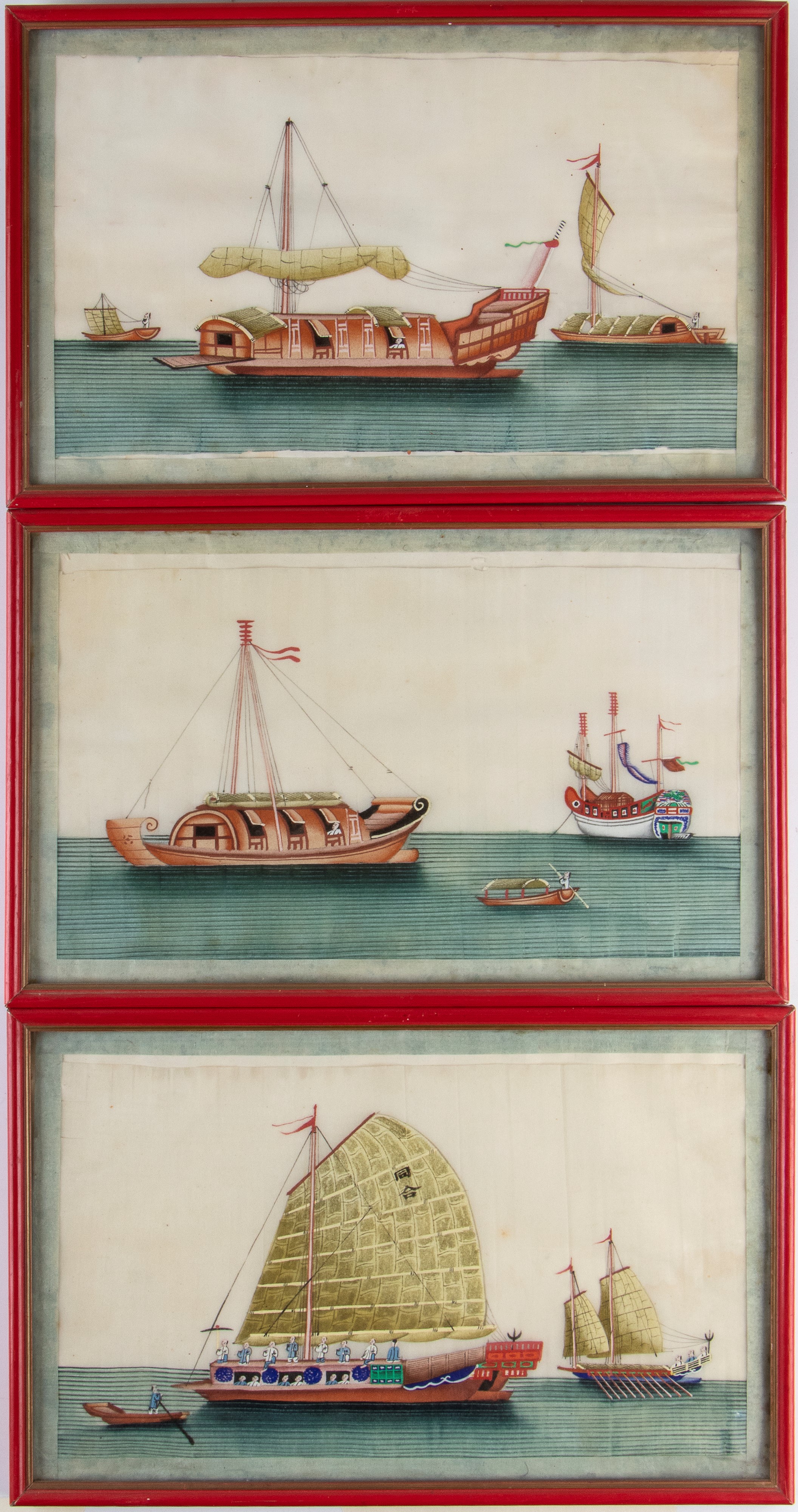 Group of three paintings on carved rice paper of boats and junks.