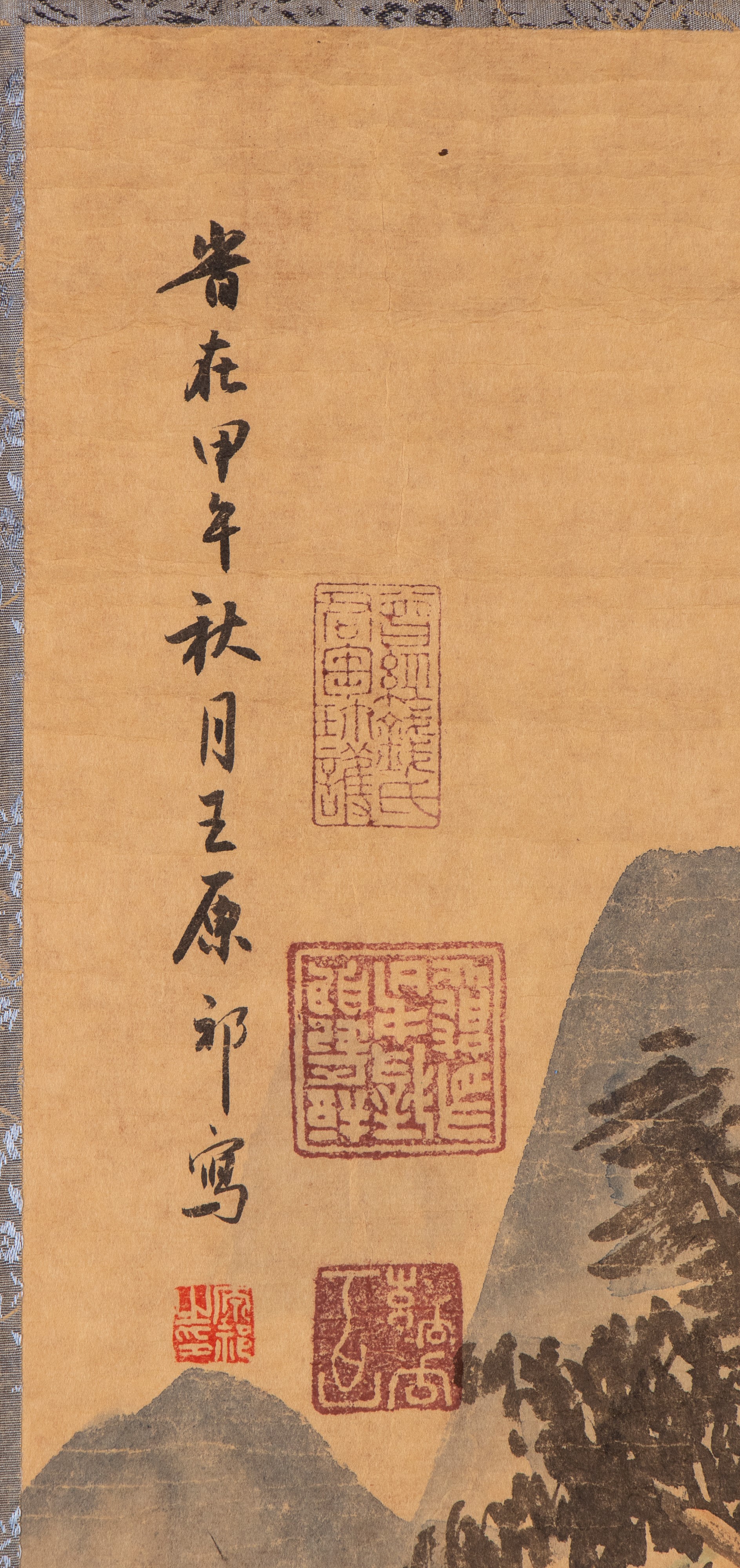 Painting on Shan Shui paper depicting a natural landscape with mountains, river and waterfalls.