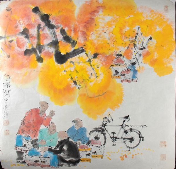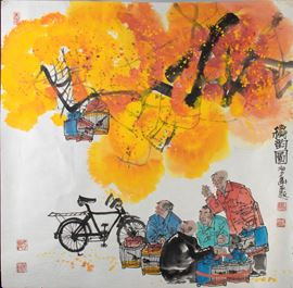 The artist is the leading artist painting traditional Beijing scenes. Ma Haifang employed a classic style of traditional Chinese painting, called "Boneless Painting." However, he broke away from that convention with his use of color. His works pulsate with reds, oranges, yellows, and greens.