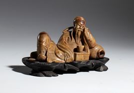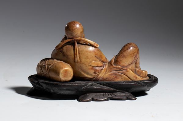 Stone figure depicting the sage Shou Shan lying down and drinking a cup of tea.