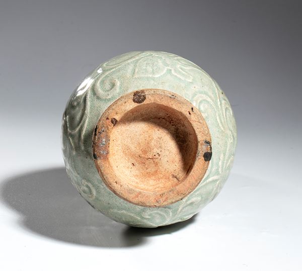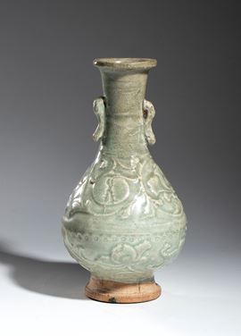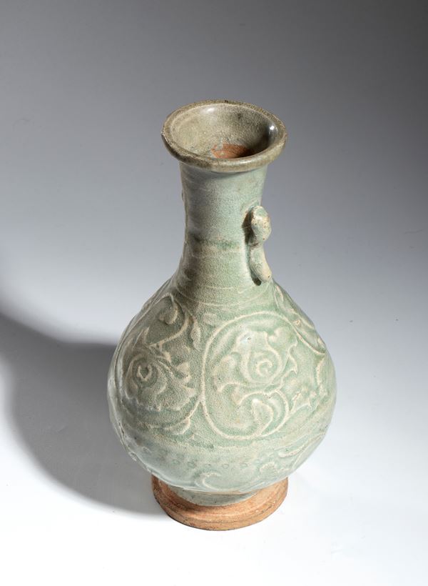 Resting on a disc-shaped base, the pear-shaped body, narrow cylindrical neck and thickened upper rim; the body features a beautiful floral-motif printed decoration and two zoomorphic handles, the whole covered with a thick green glaze.