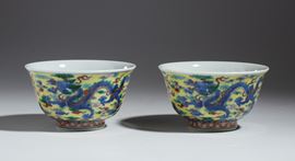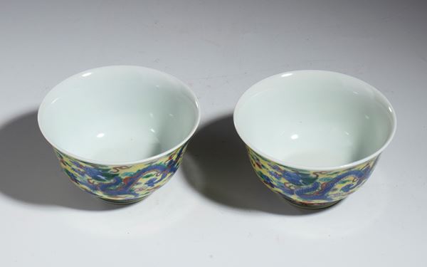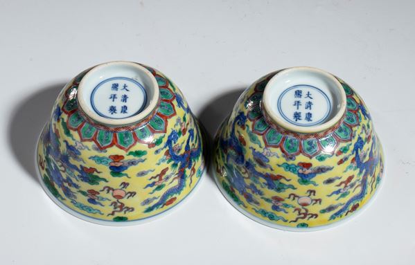 Two yellow porcelain bowls of the Qianlong period, decorated with dragons and clouds, with a six-character mark.