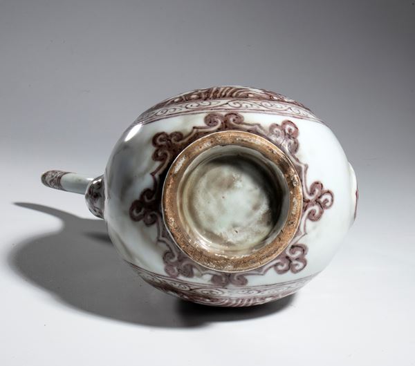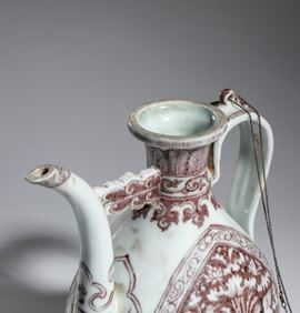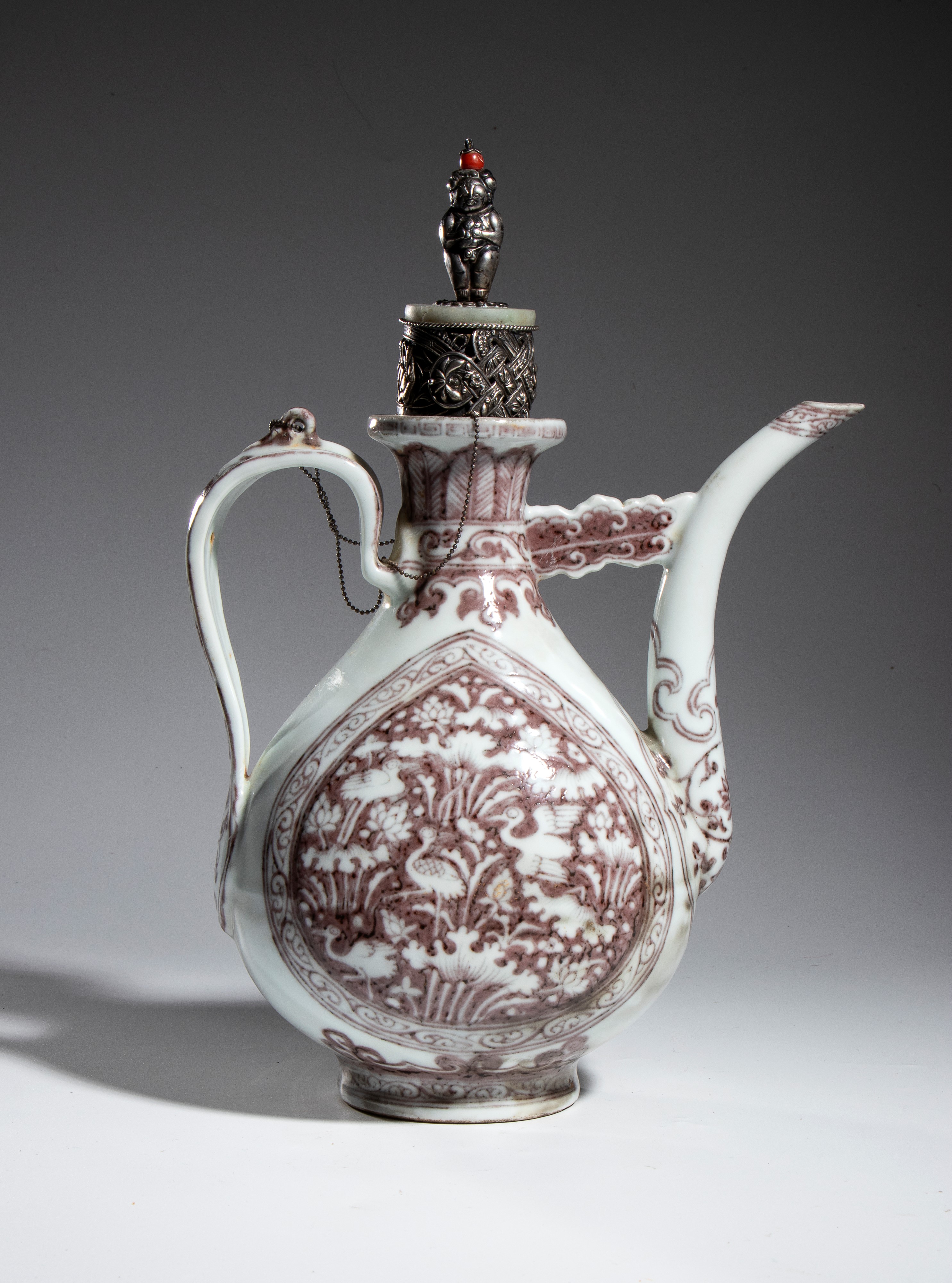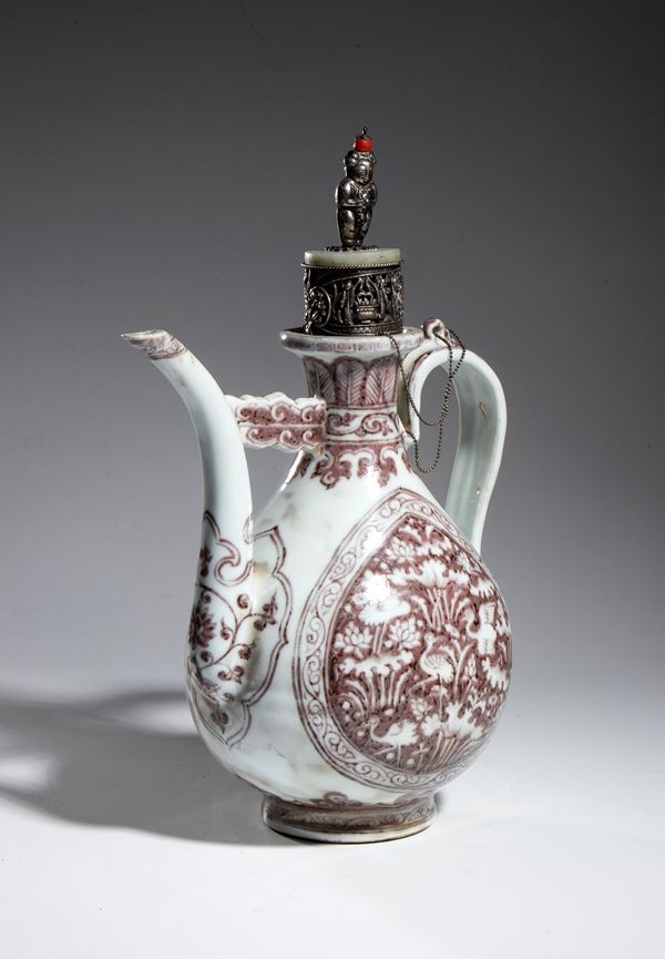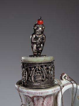 White and red ceramic vase with silver lid mounted with a jade pendant and a coral bead.