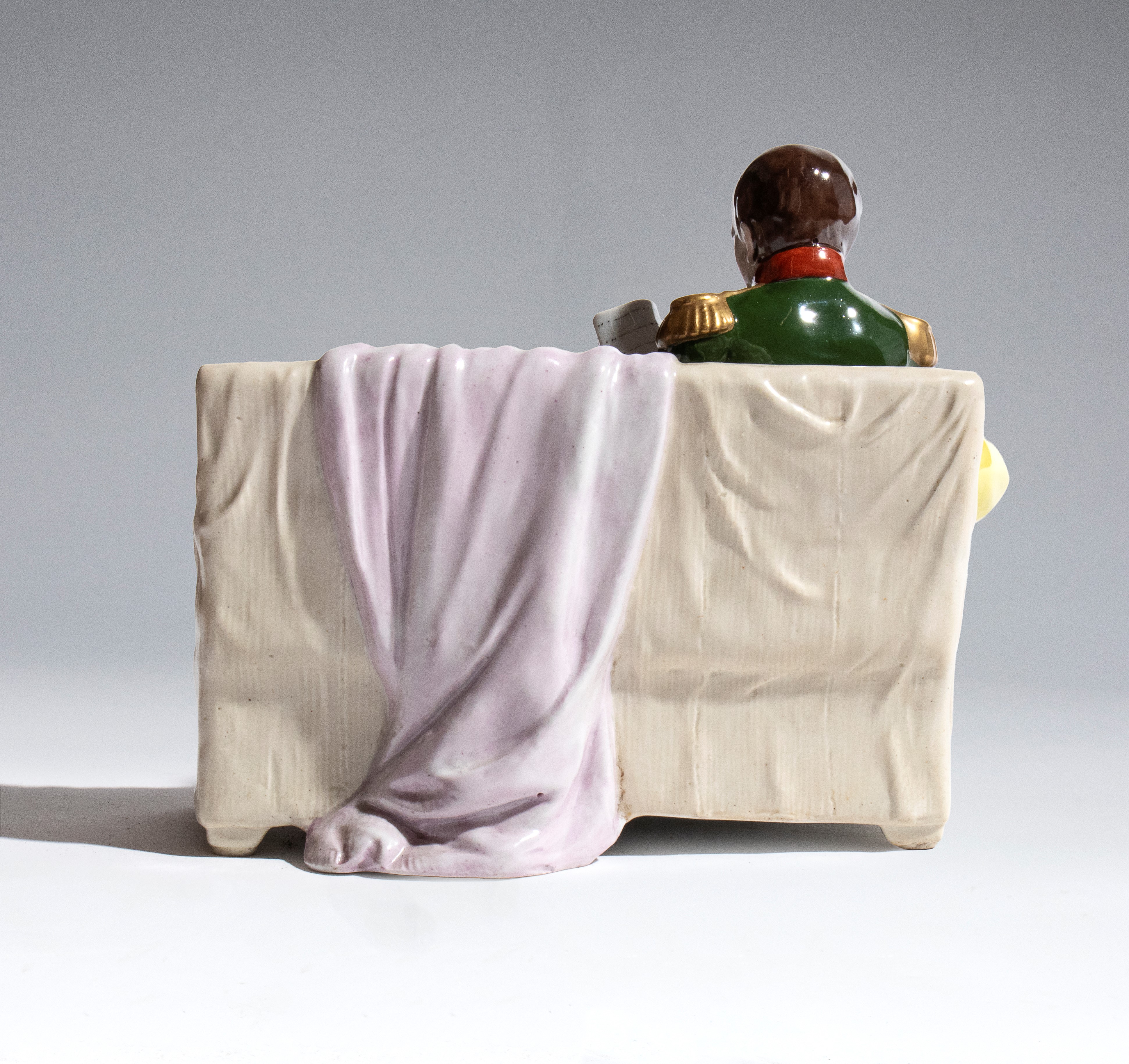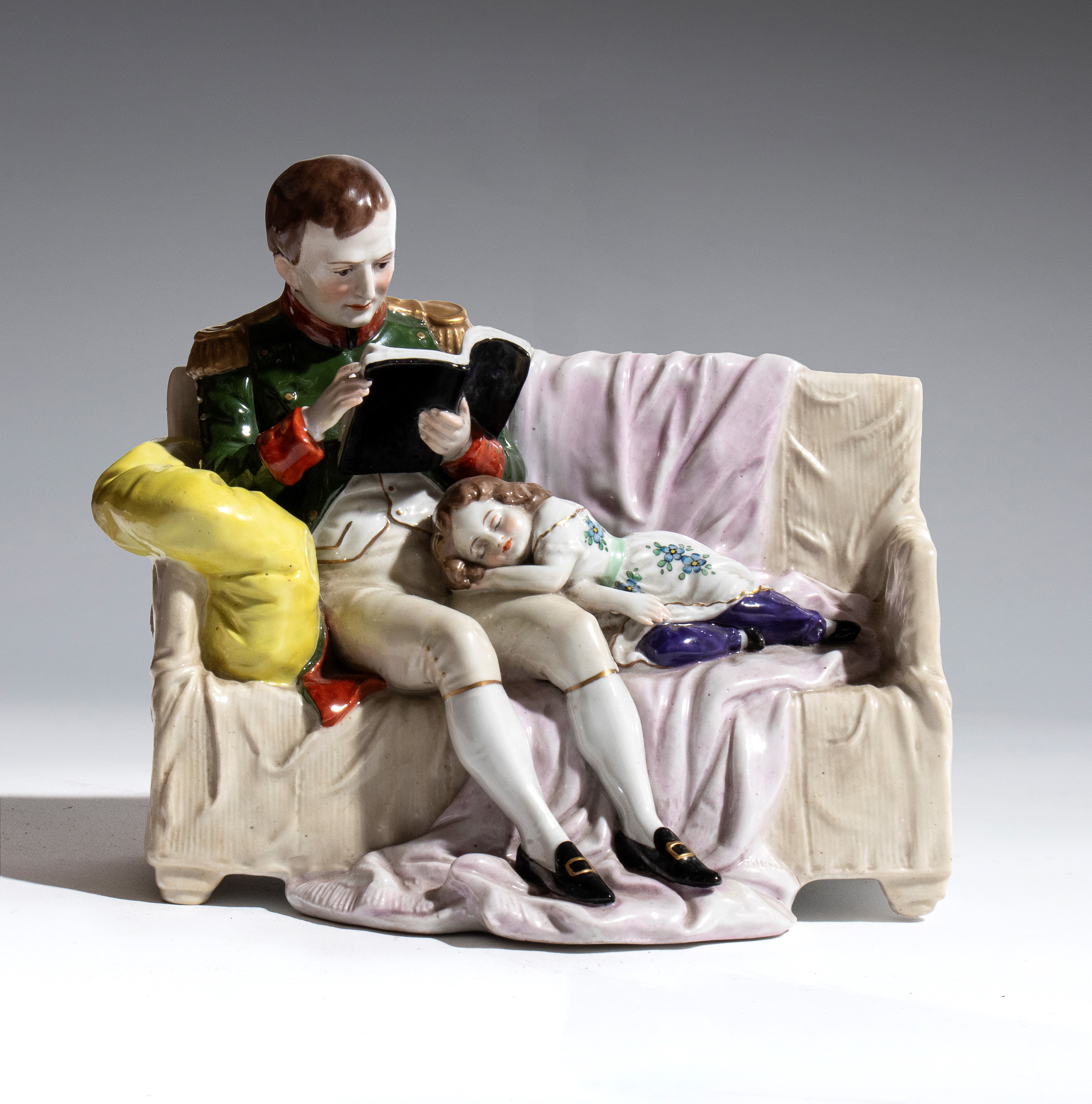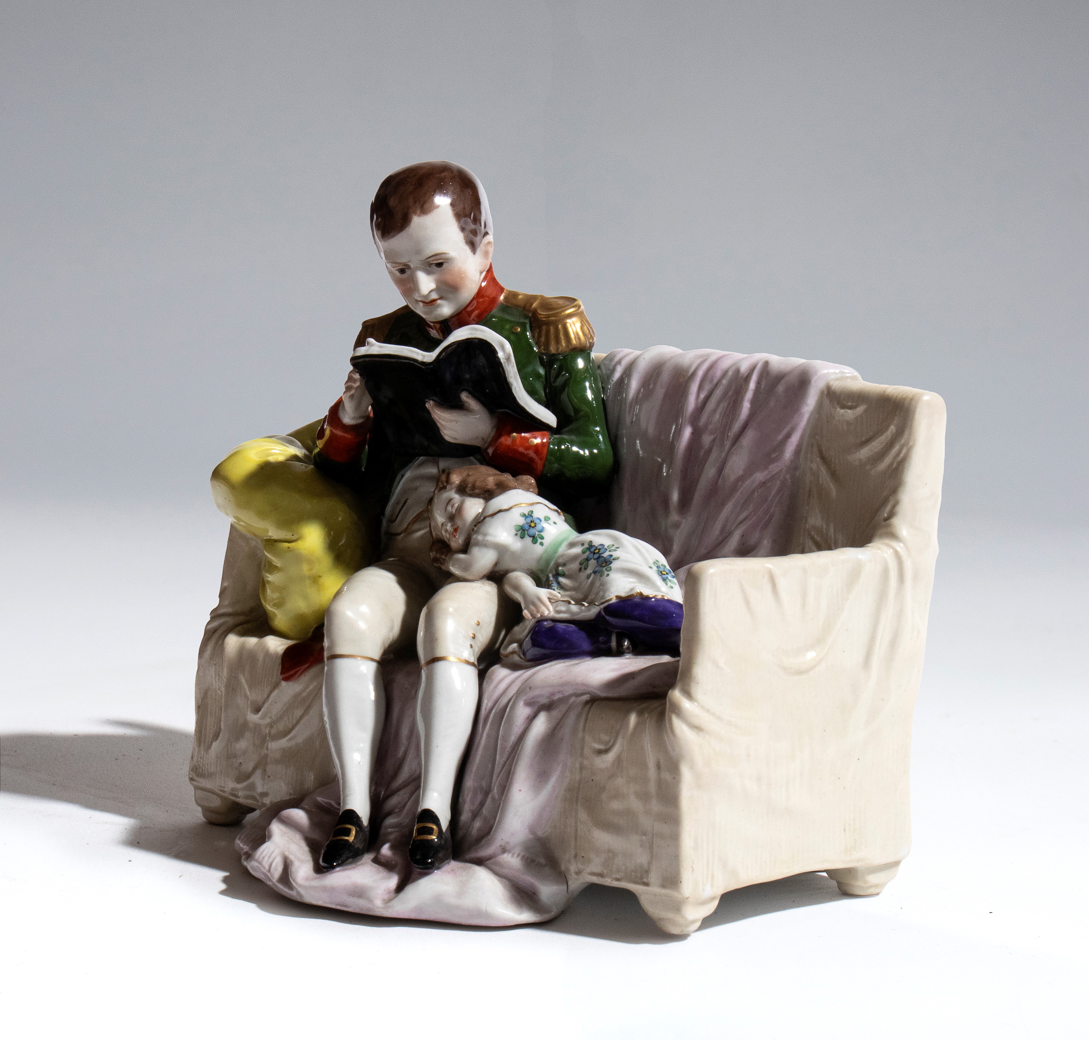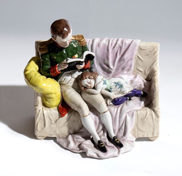 Hand-modeled and hand-painted porcelain, depicting Napoleon Bonaparte seated on a sofa, engrossed in reading, while a child rests beside him with his head resting on Napoleon’s lap. The scene is rendered in vivid polychrome. The composition stands out for its attention to decorative details, such as the folds of the fabric, the furnishings, and the facial expressions, which lend the whole an intimate and domestic character.