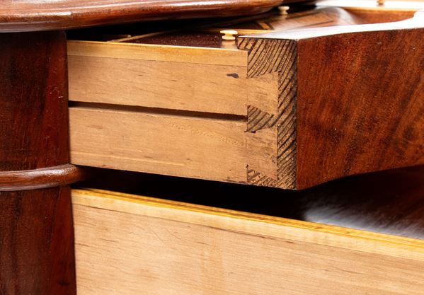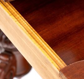 made of mahogany, with a folding top; interior in maple and mahogany with fruitwood inlays. Finely carved central tripod base.