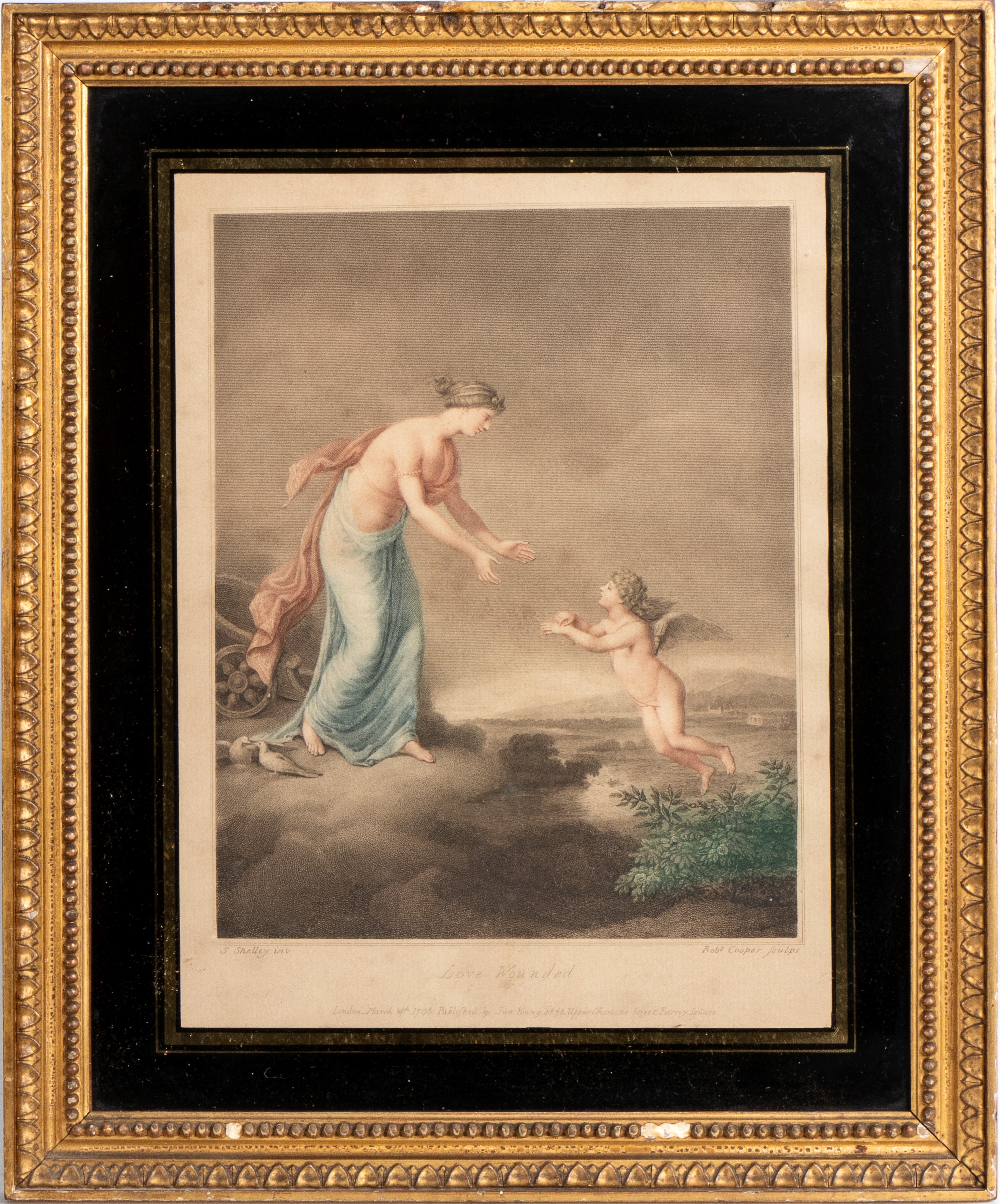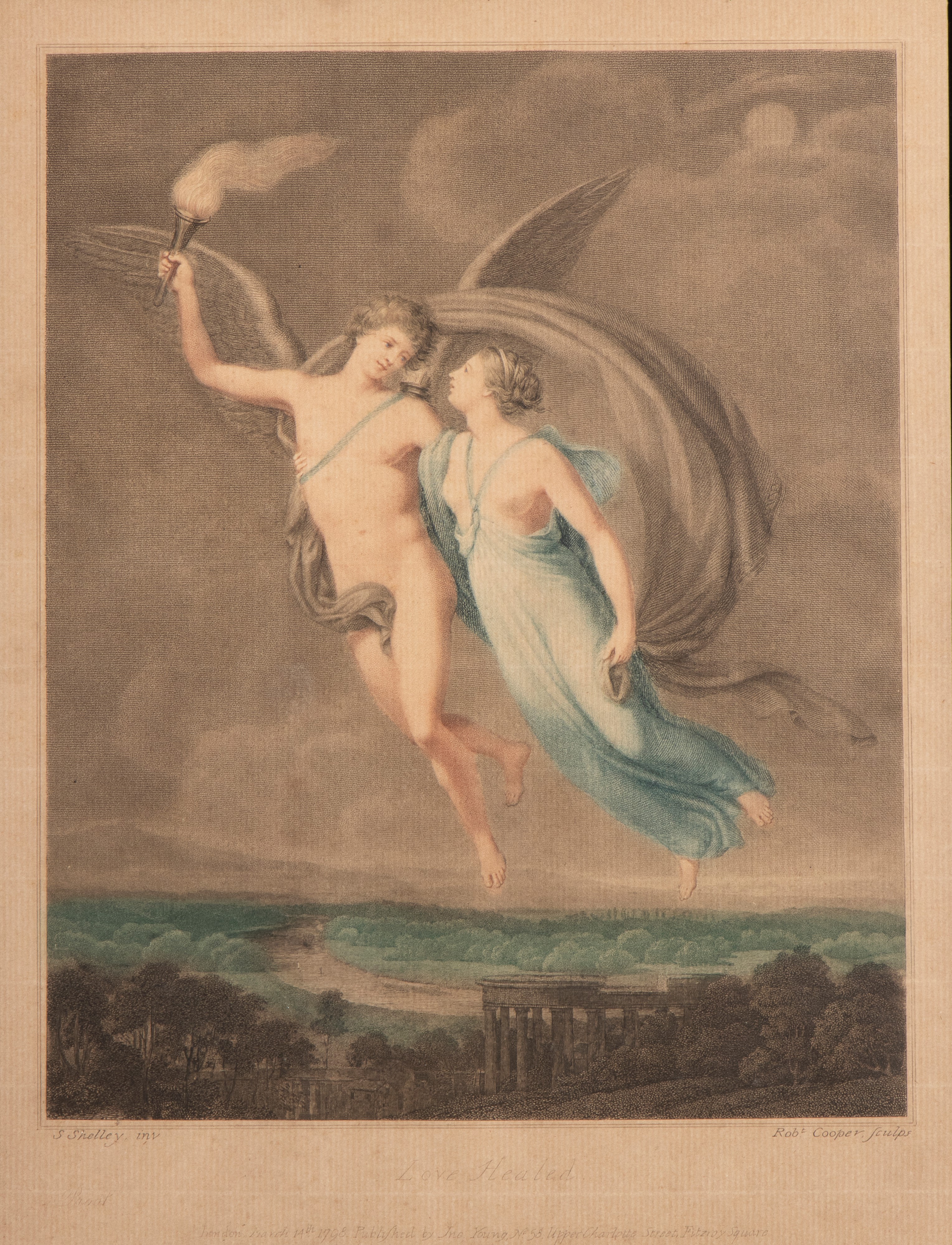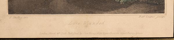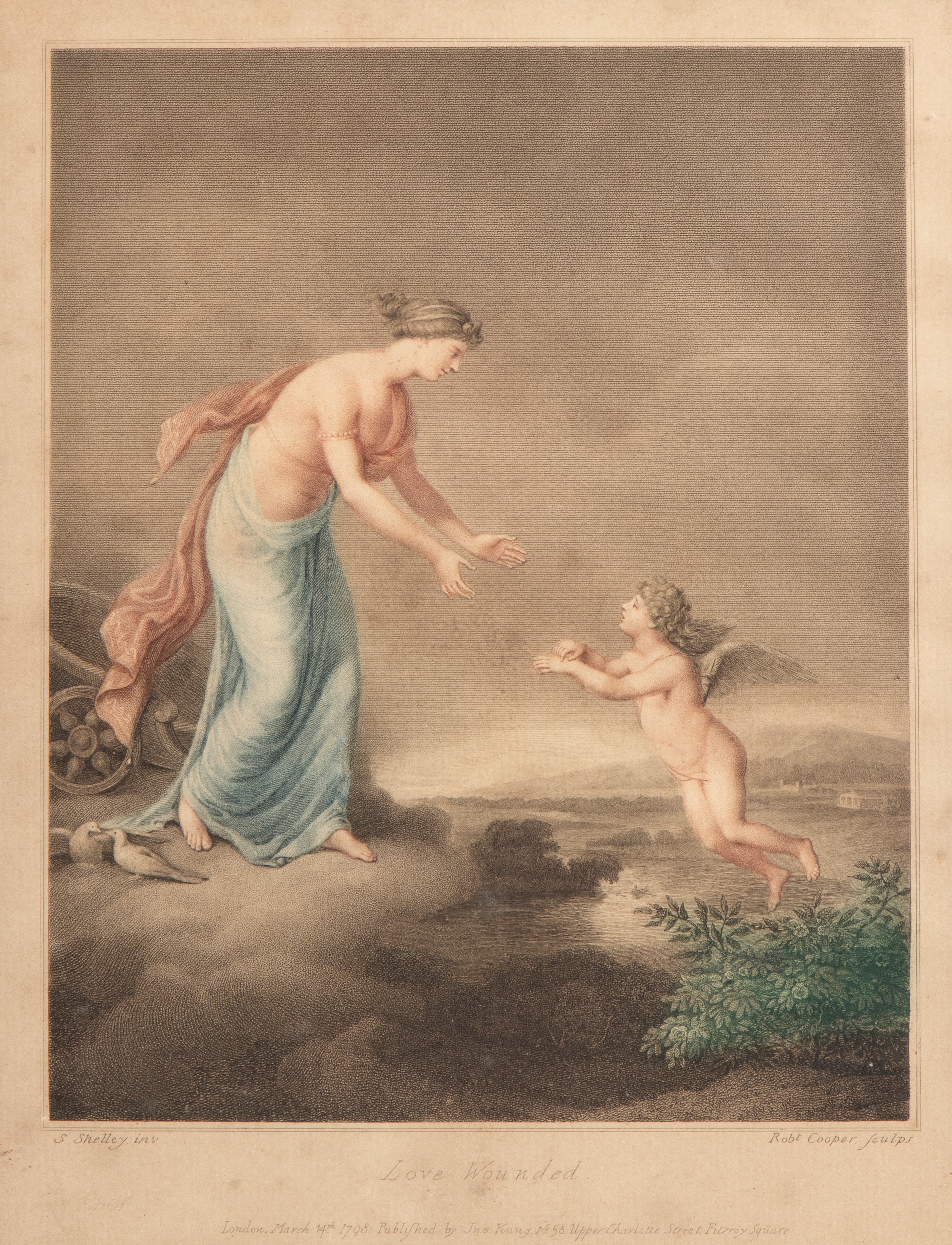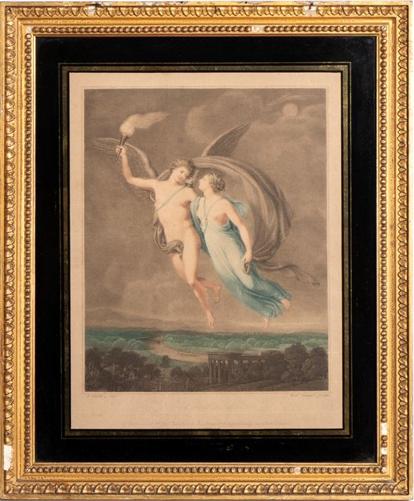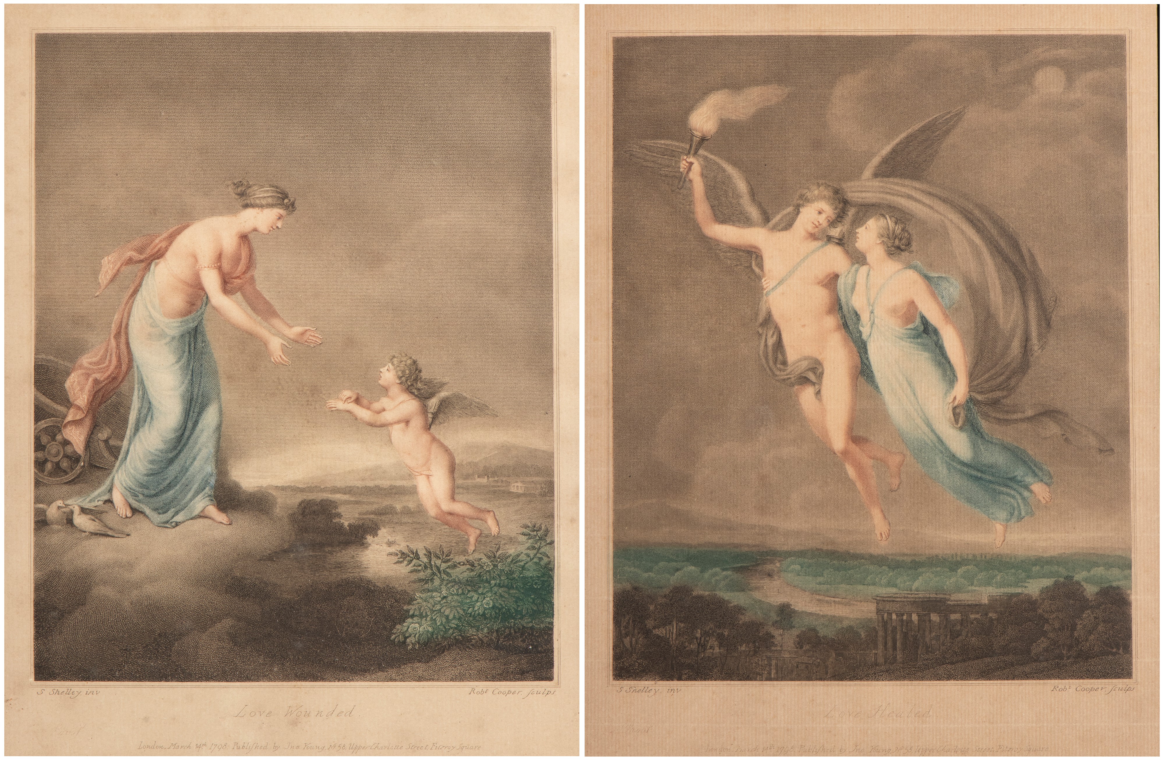 based on works by Samuel Shelley. The two compositions, conceived as a pair, unfold an allegorical narrative on the theme of love. In Love Wounded, Venus, draped in soft folds of fabric, leans with a sympathetic gesture toward a small winged Cupid, captured in the act of moving toward her: the scene, suspended on a cloud, conveys a sense of vulnerability and protection, underscored by the serene landscape in the background. In Love Healed, the atmosphere becomes more dynamic and luminous: two winged figures soar through the sky, while a smoking torch, a symbol of rekindled and purified love, introduces the theme of emotional rebirth.