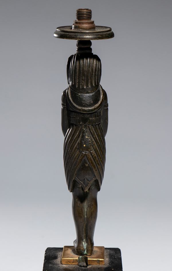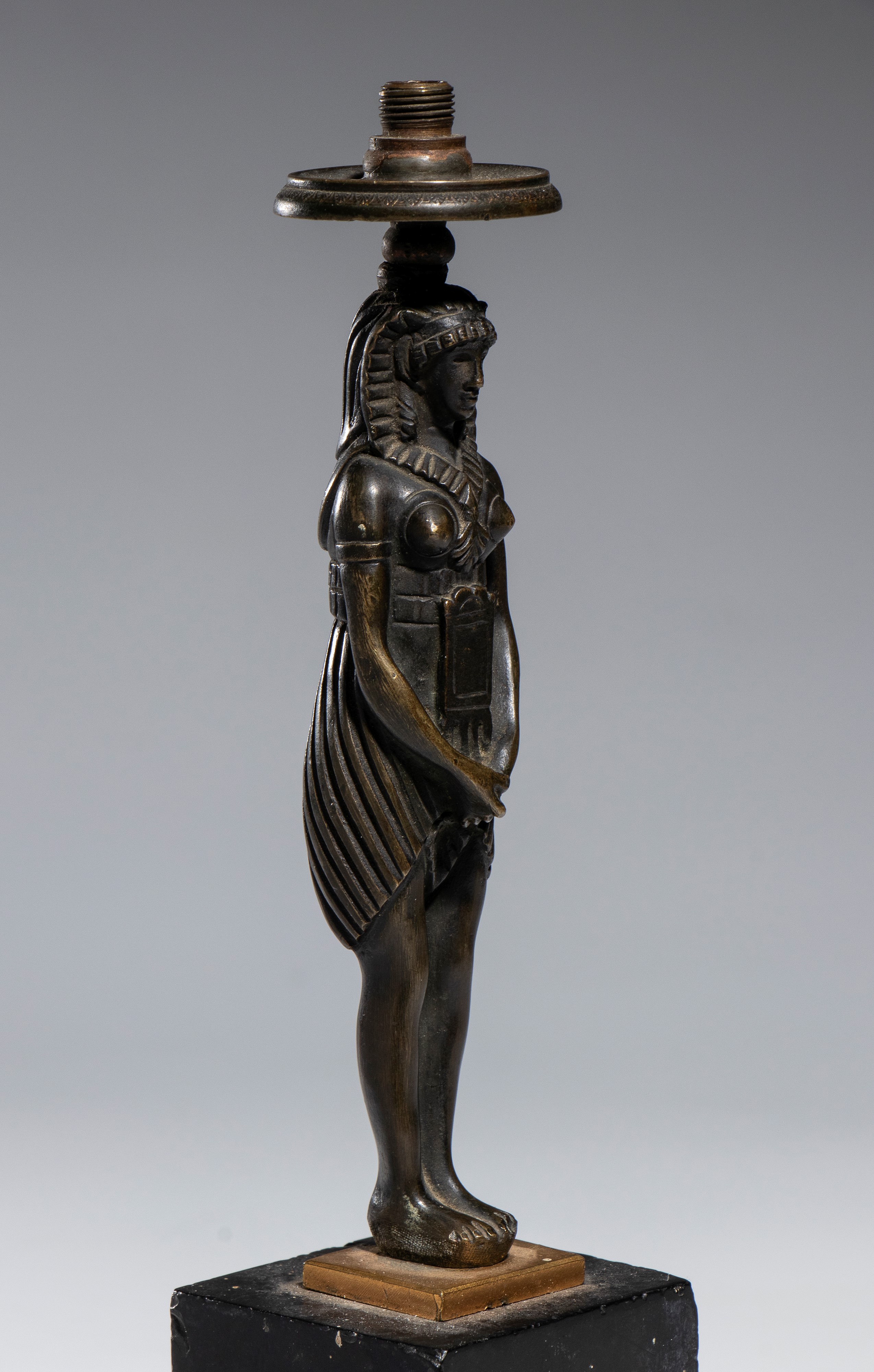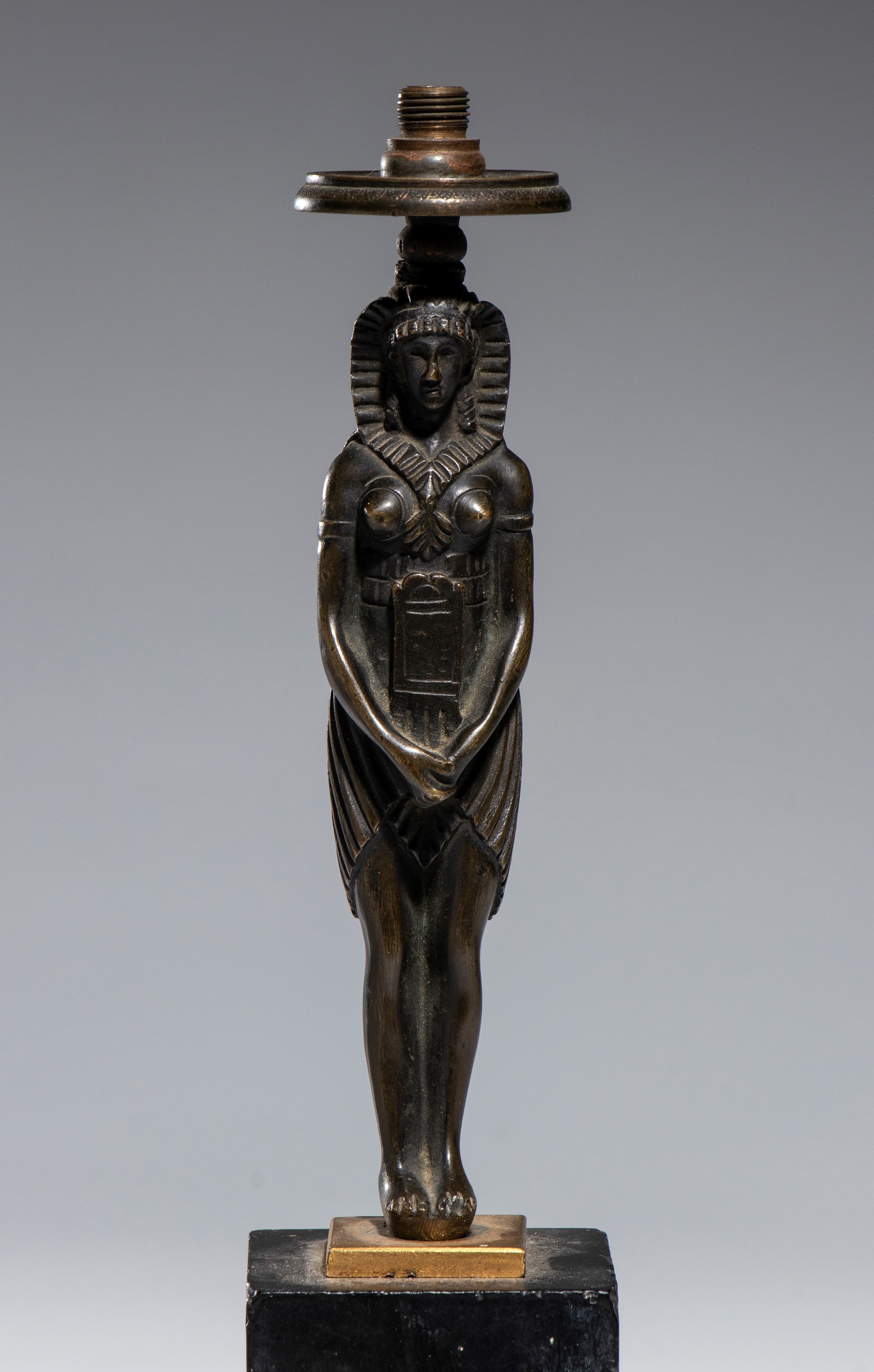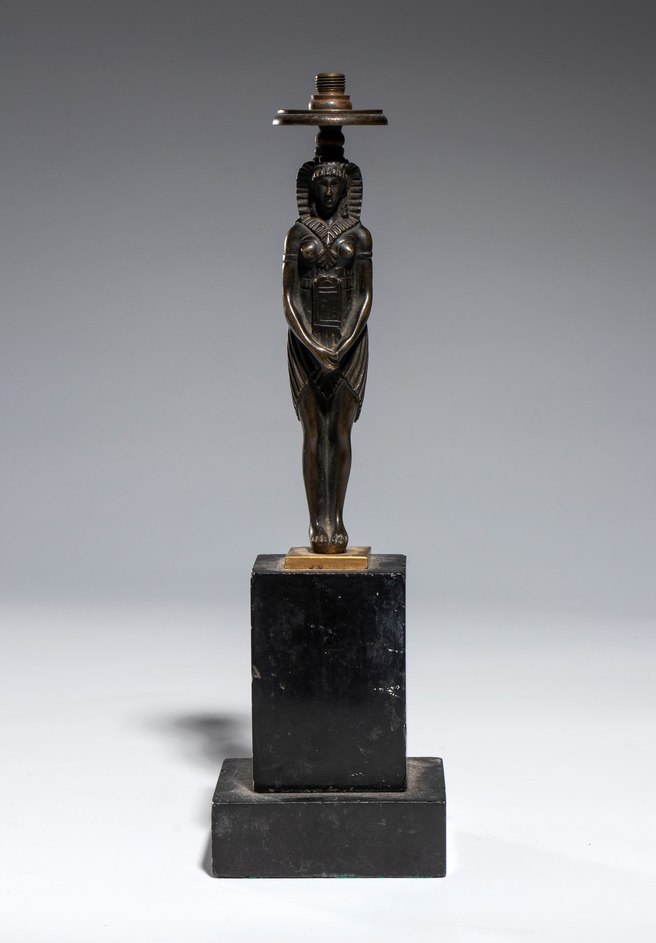 depicting a female figure standing in a hieratic pose. The bronze sculpture wears a ceremonial headdress and garments typical of the idealized Egyptian iconography of the Neoclassical period. The figure holds the socket for the lamp or mouthpiece atop her head. The statue rests on a black marble base.