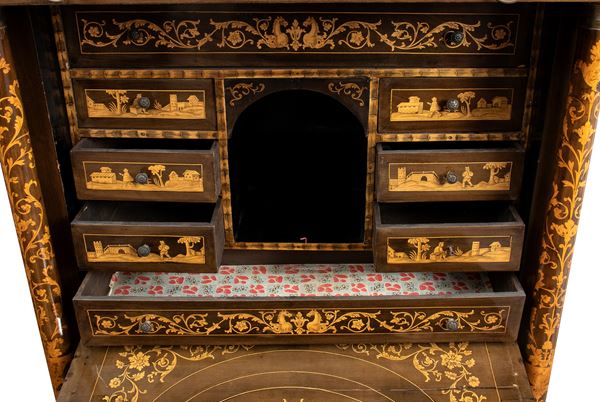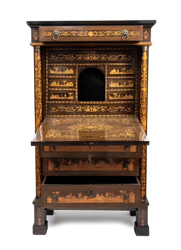 An elegant, finely inlaid secretary desk of Lombard origin, featuring rich decoration with floral, architectural, and figurative motifs in light woods against a dark background. The front is divided into three drawers, plus an upper drawer beneath the top, and a central flap decorated with a classical scene within an oval medallion.