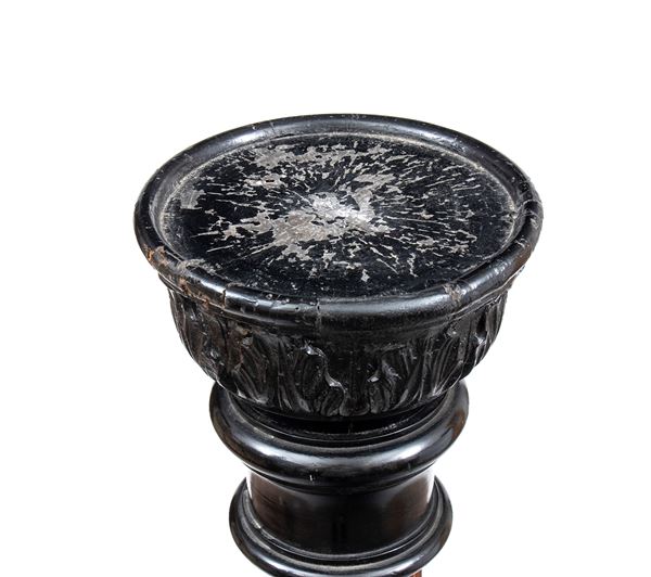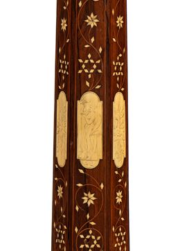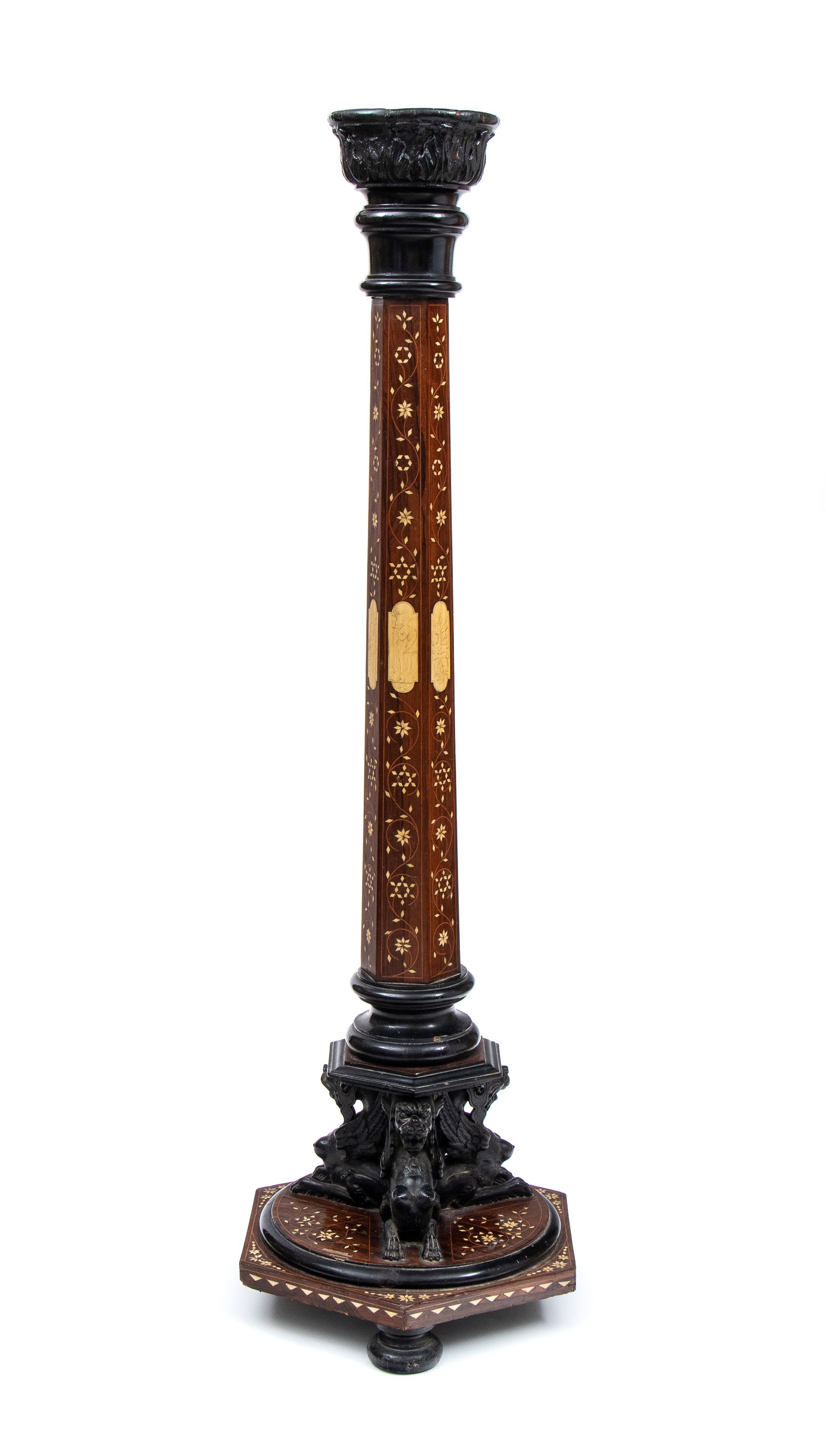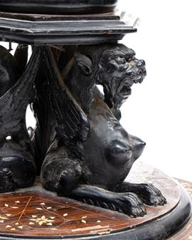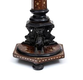 made of rosewood and ebonized wood, richly decorated with floral and geometric bone inlays. The polygonal body is embellished with panels featuring engraved figures. The base is adorned with carved elements depicting fantastical zoomorphic figures, typical of the eclectic style of the late 19th century. The upper surface is shaped like a bowl to hold a vase or decorative object.