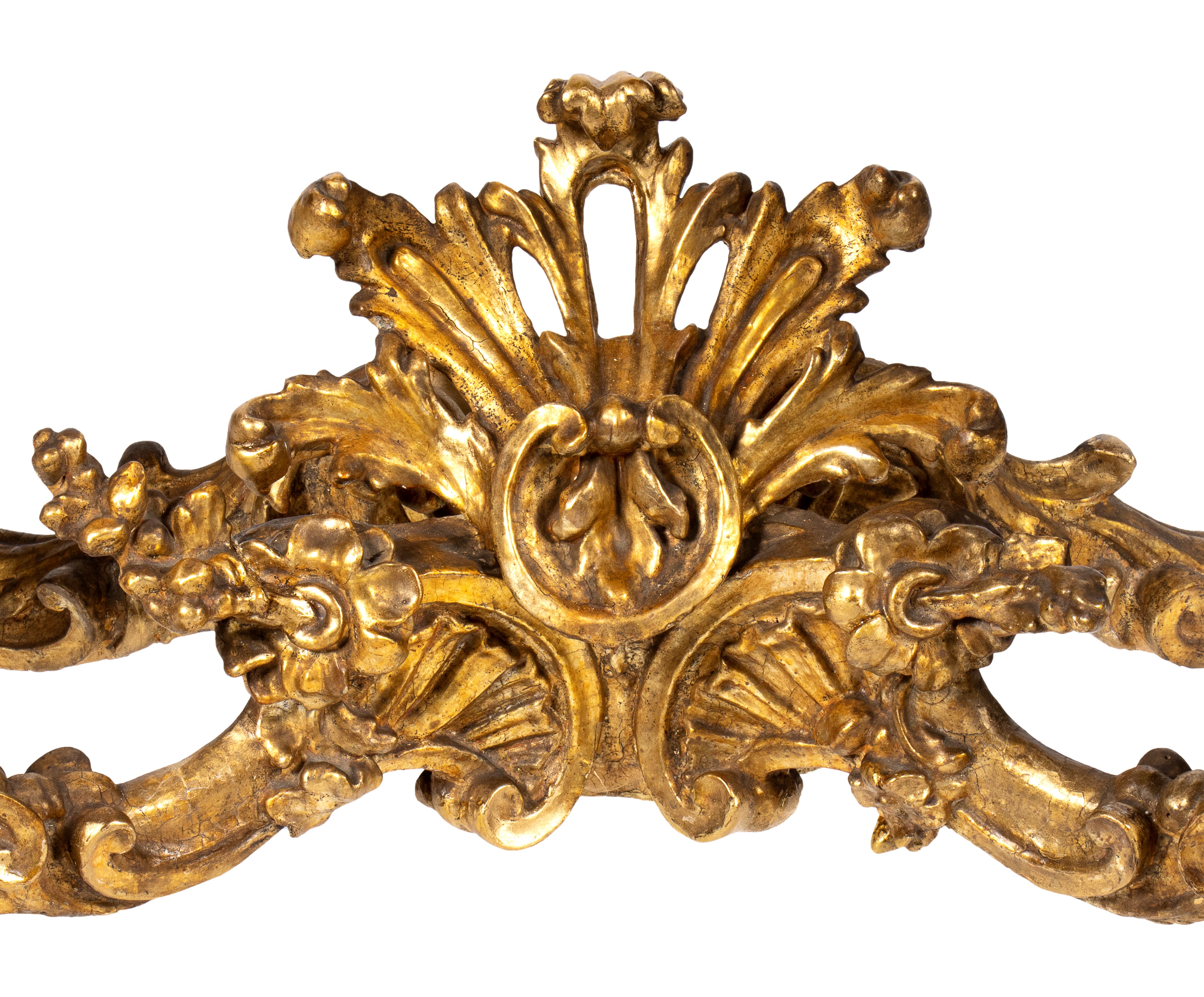 carved and sculpted wood with floral and geometric motifs, gilded with gold leaf with gray painted wood top.
