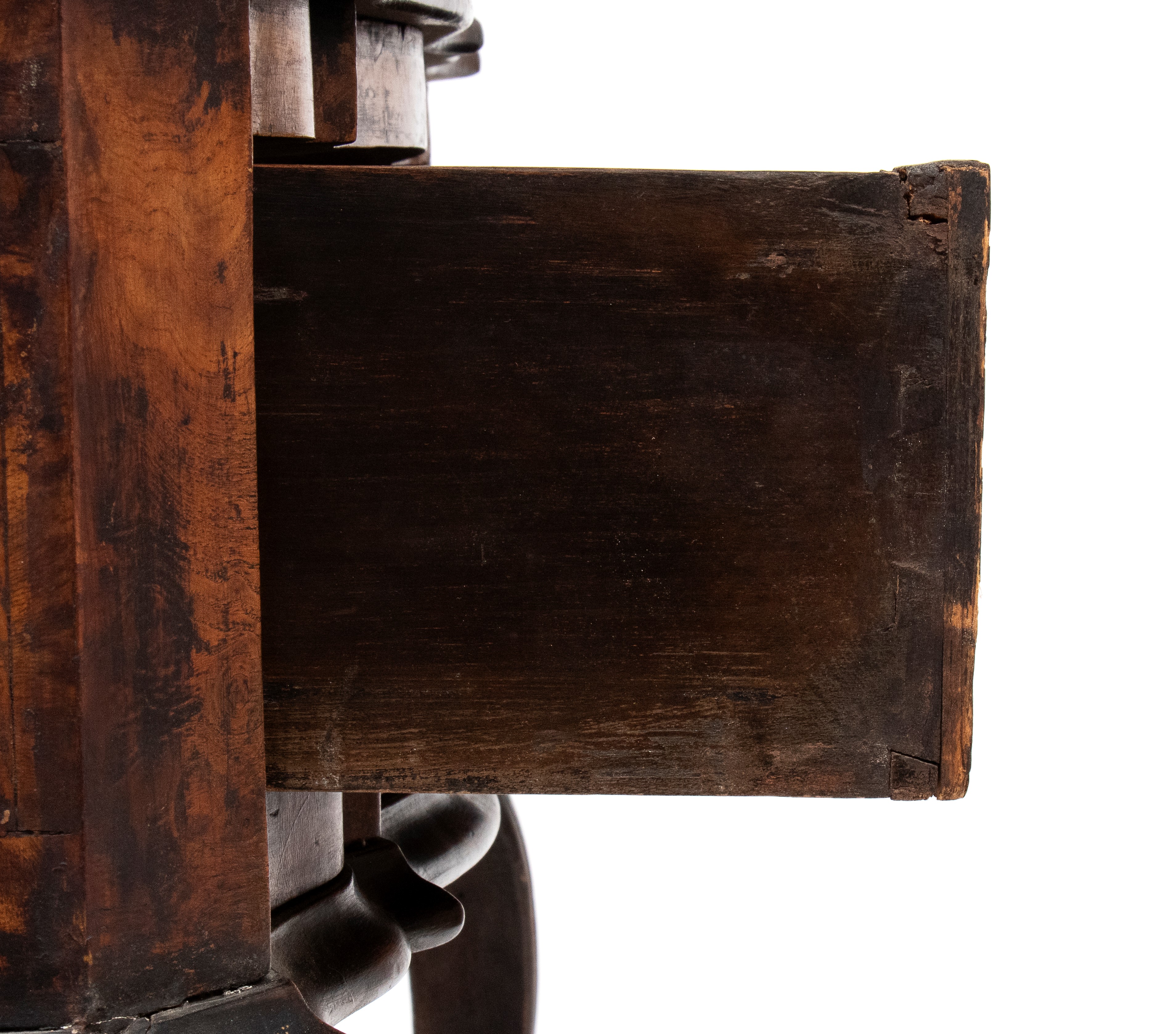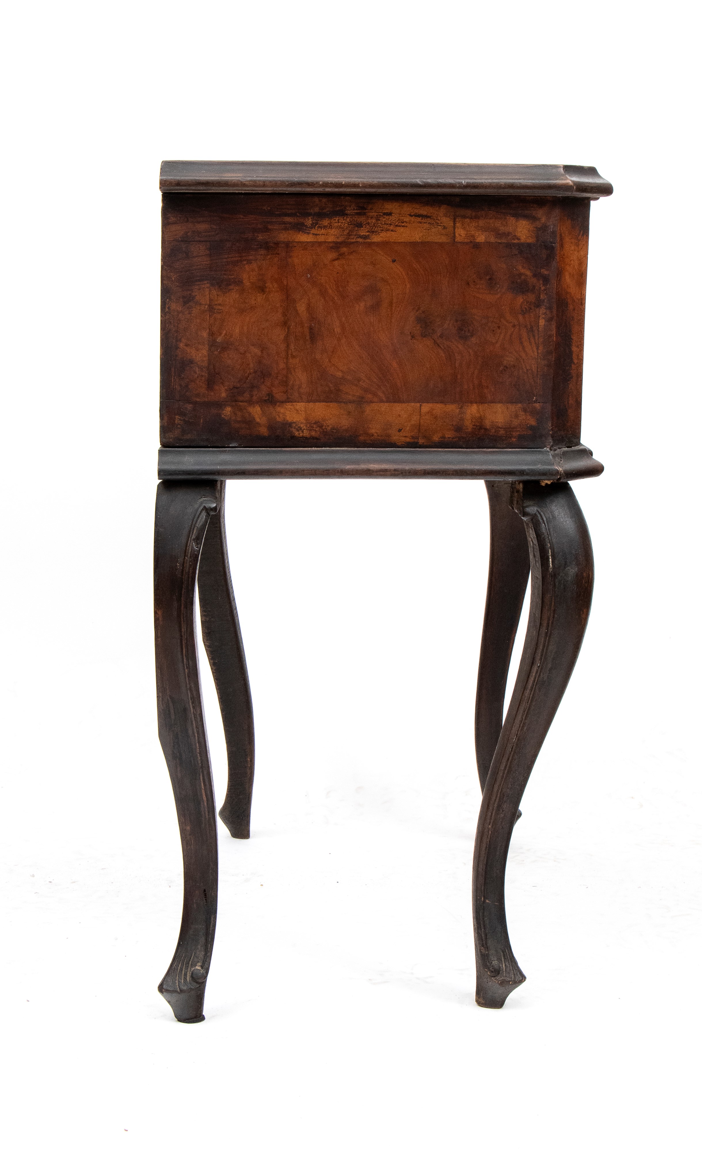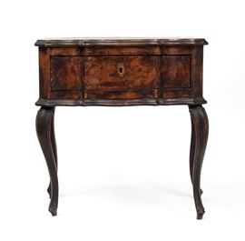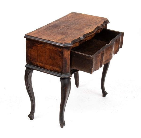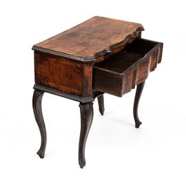 walnut veneer, contoured top and front drawer, curved legs.