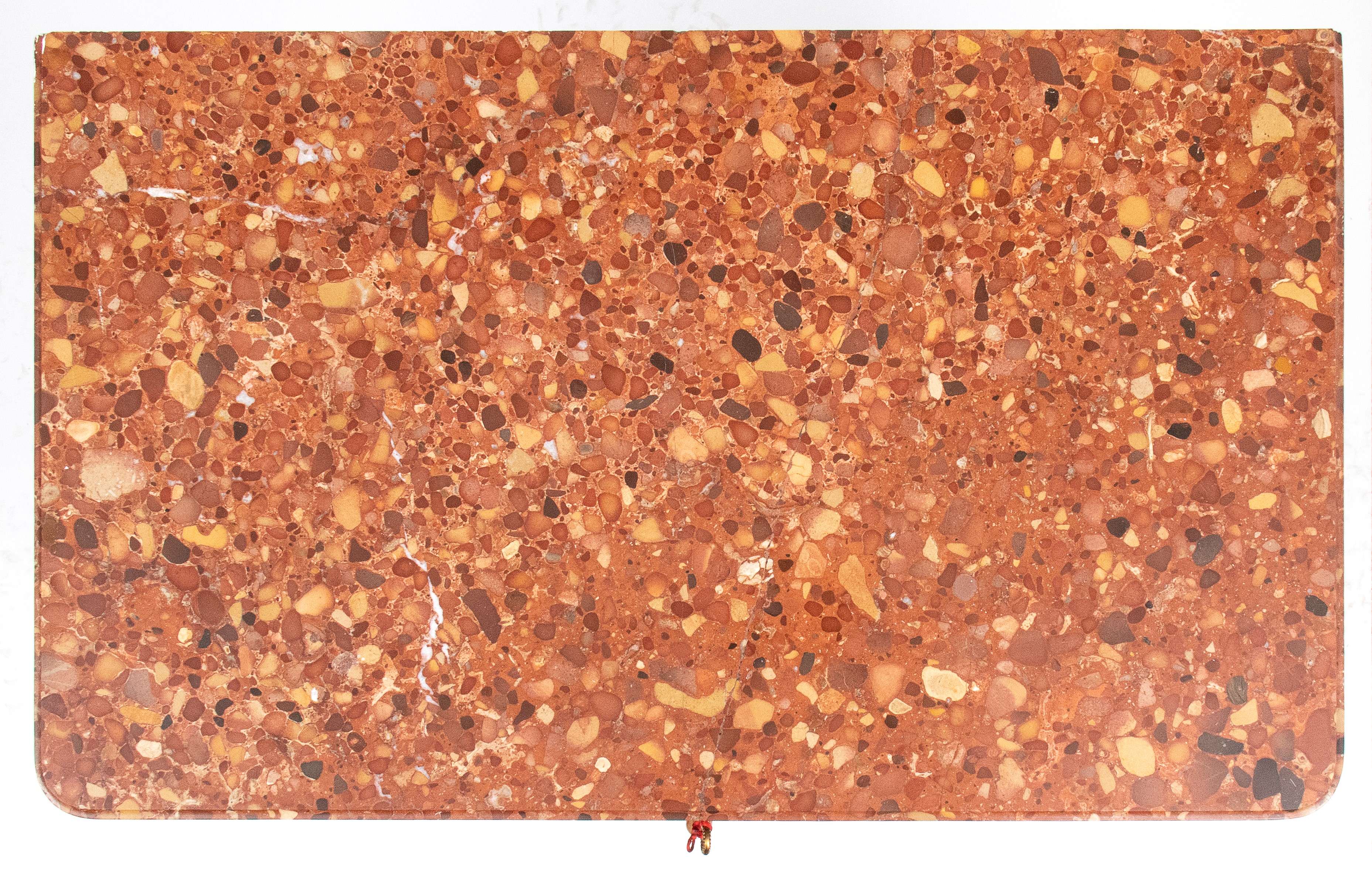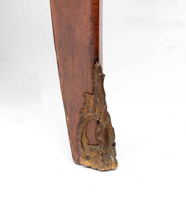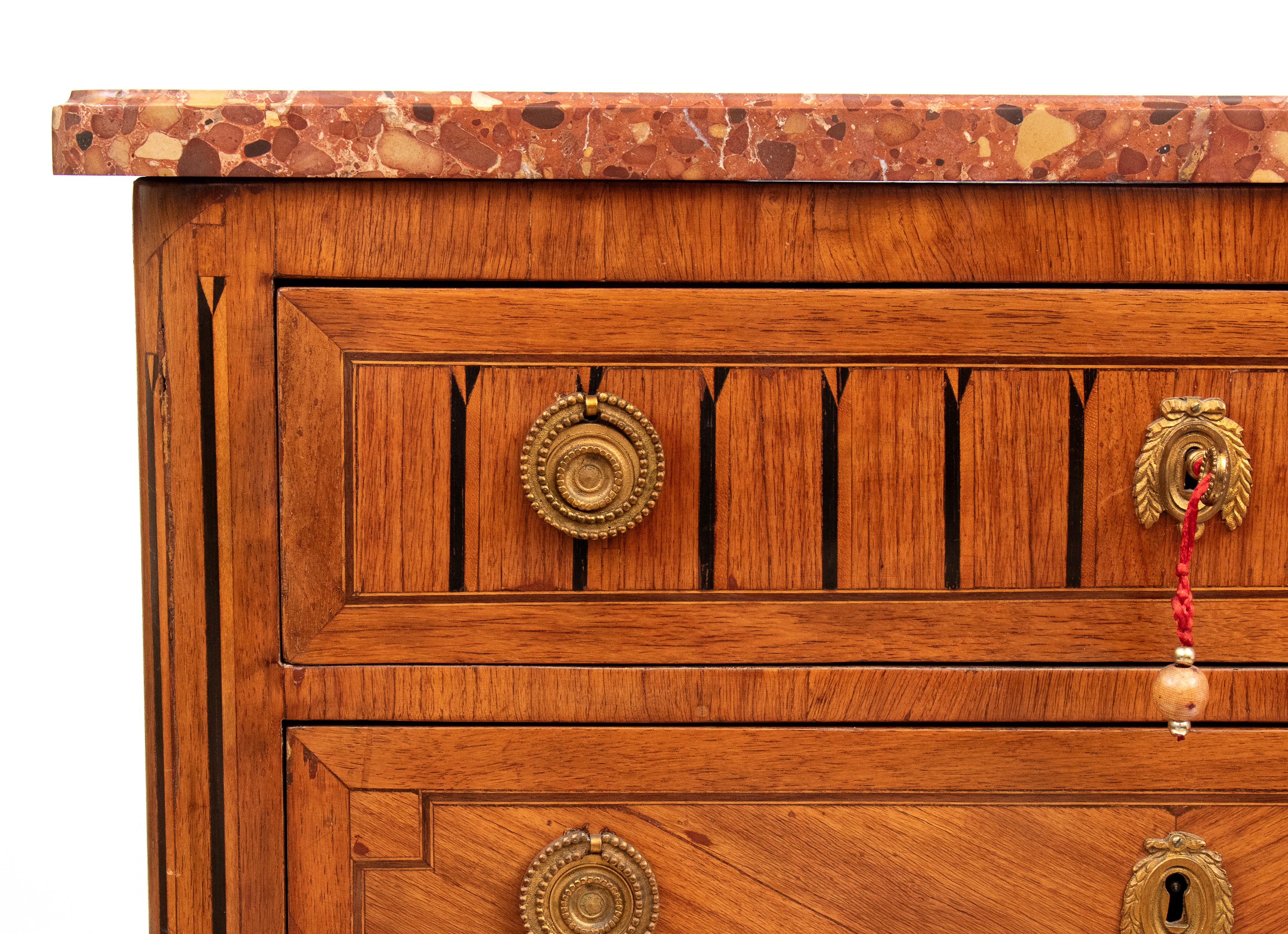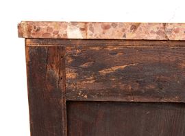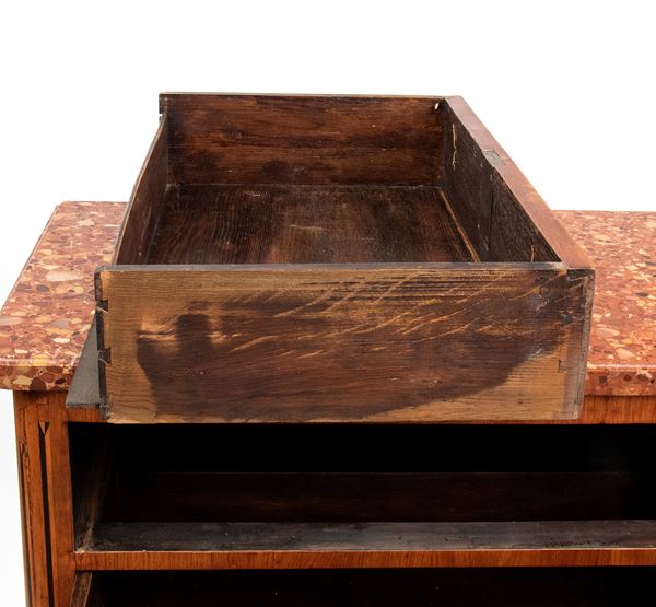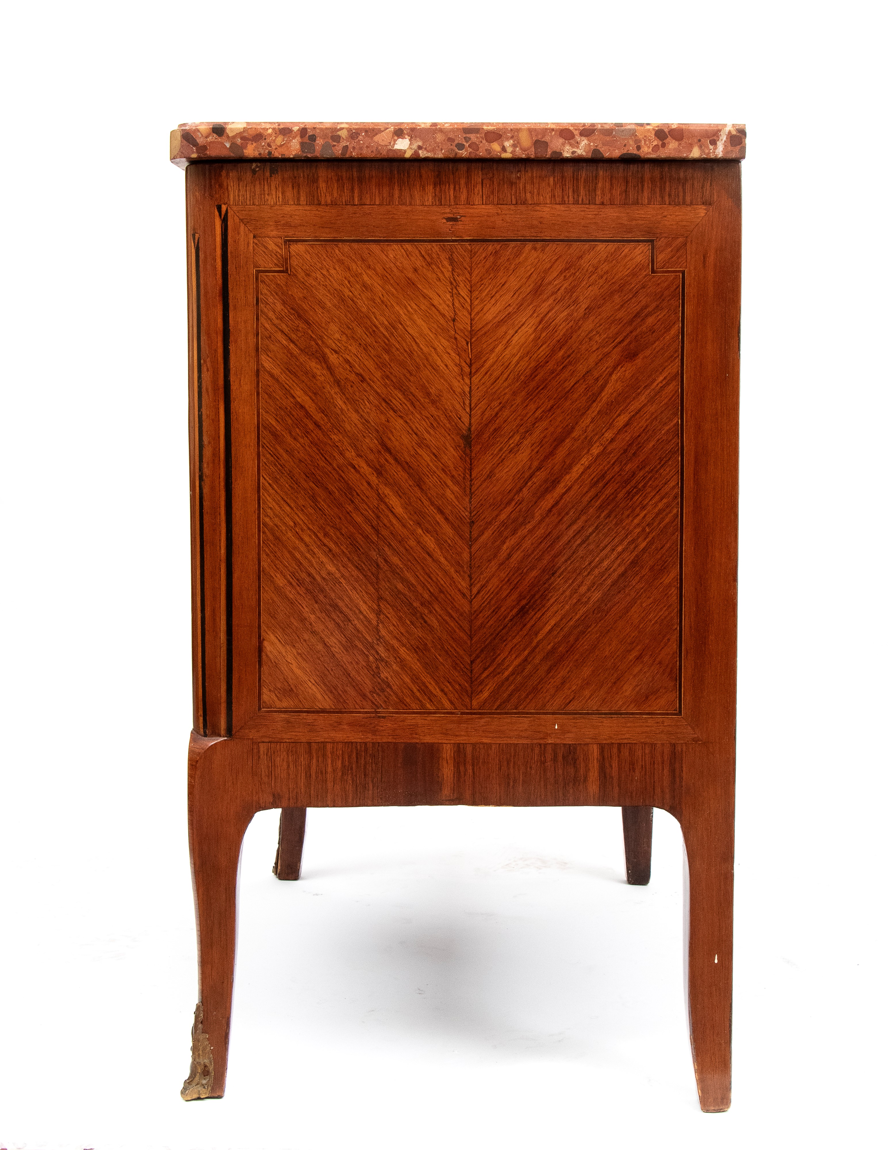 top in red-orange-hued breccia marble, with a front panel decorated with a pattern of vertical grooves and geometric motifs. Slightly cabriolet-style legs with gilded bronze accents.
