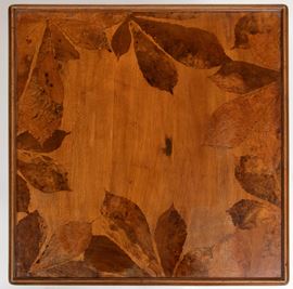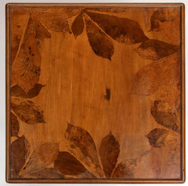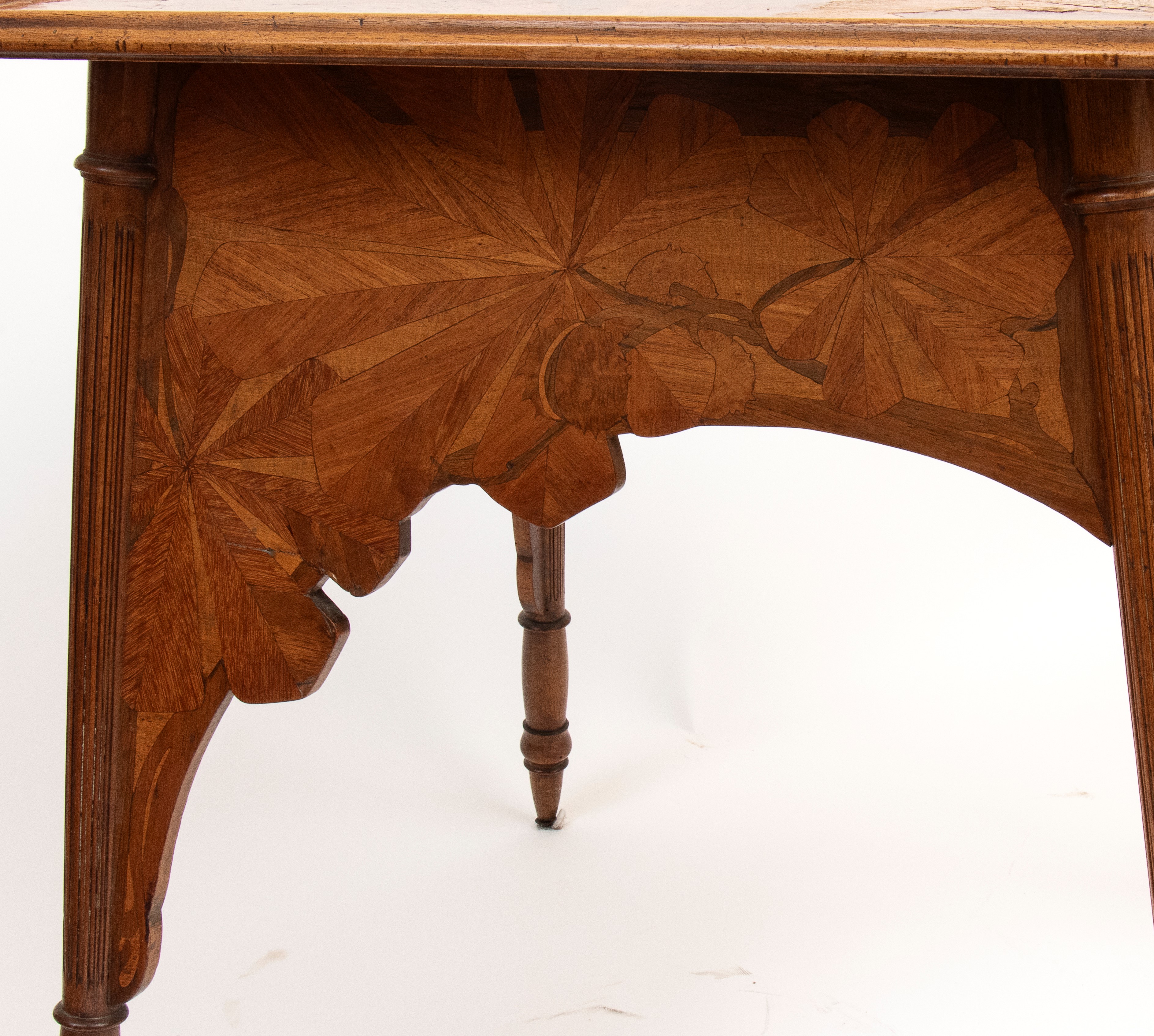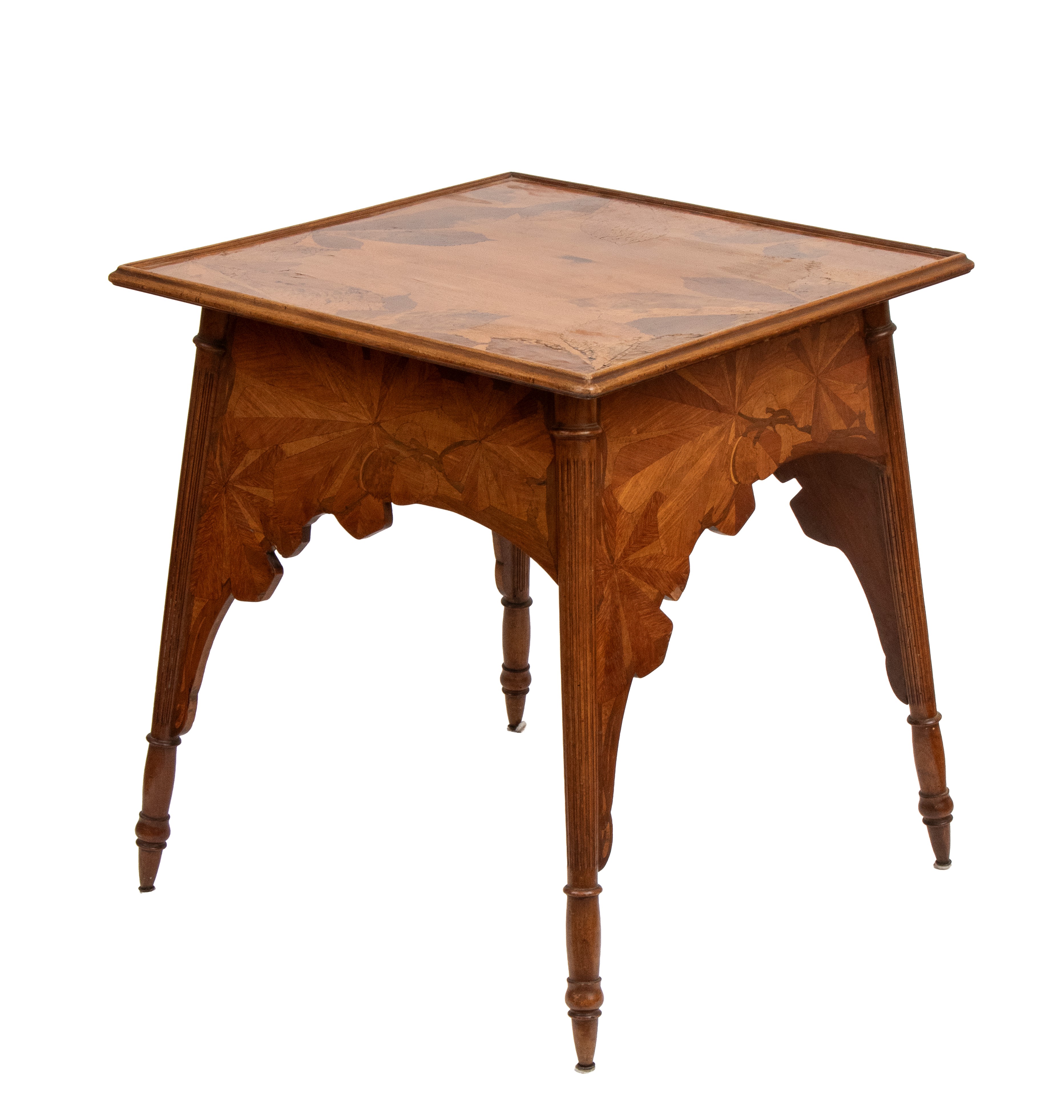 Made of walnut and fruitwood, this square-shaped piece is decorated and inlaid with naturalistic leaf motifs; the band beneath the top is adorned with a radiating floral composition, and the apron features a contoured design with undulating edges. The construction and quality of the inlay are reminiscent of the work of the Nancy school and the designs of Louis Majorelle (1859โ€“1926).