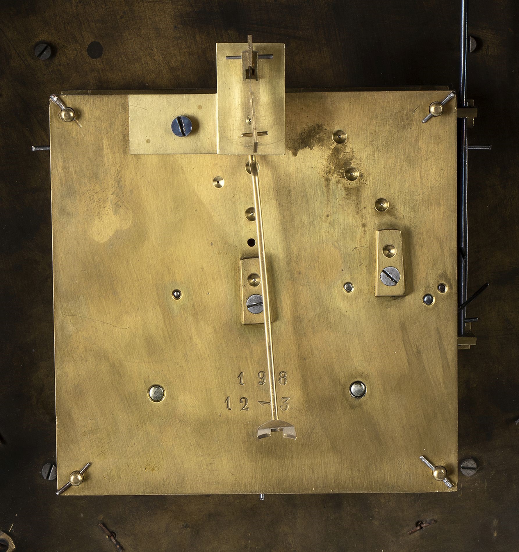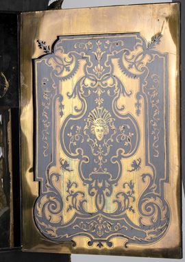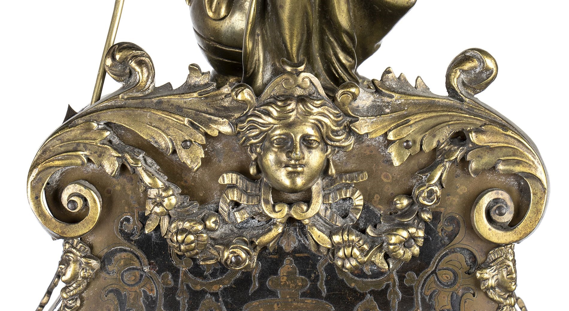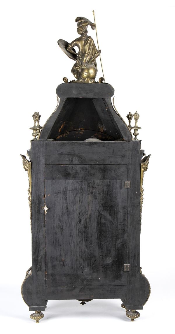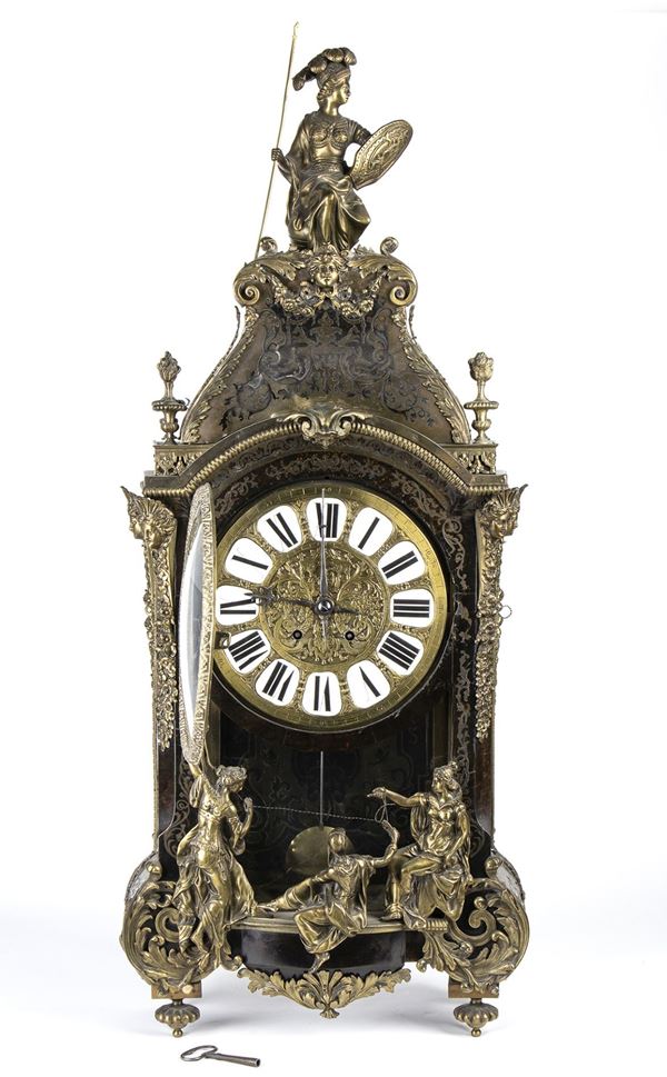 A shaped case resting on spinning top feet, adorned with bronze statuettes representing the 'Moire', the personification of ineluctable destiny also called Fatae, i.e. those who preside over fate, placed on the front door. The statue at the top represents Minerva on a throne. Circular gilded dial with Roman numerals on white enamel, pendulum regulator and hour and half-hour chime on bell. The key and pendulum are still present.