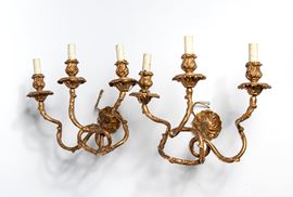 Three-armed, branching from a central molded panel, typical of the Louis XV style. Characterized by a flowing design and rocaille decoration featuring foliage and scrolls.