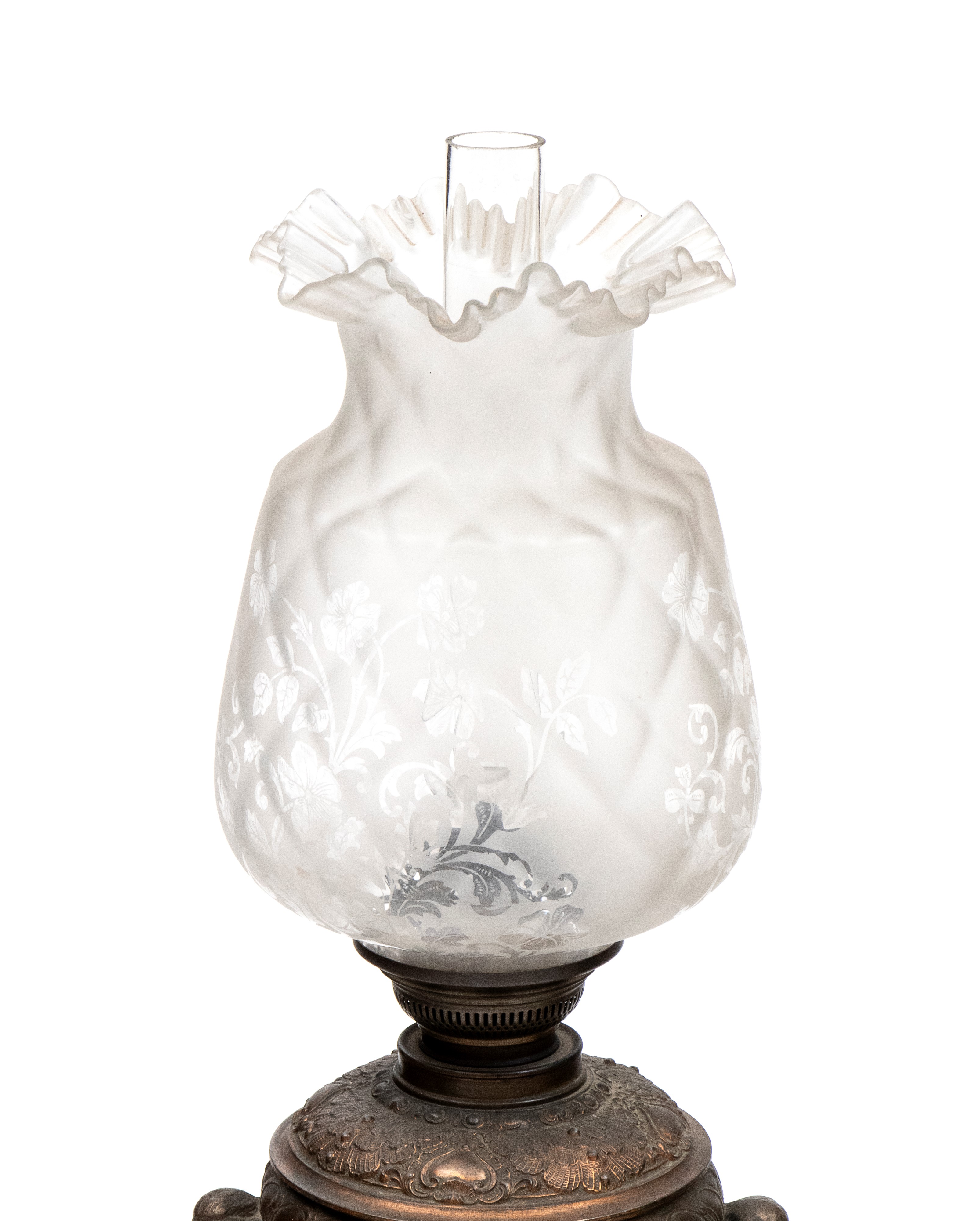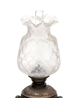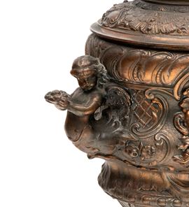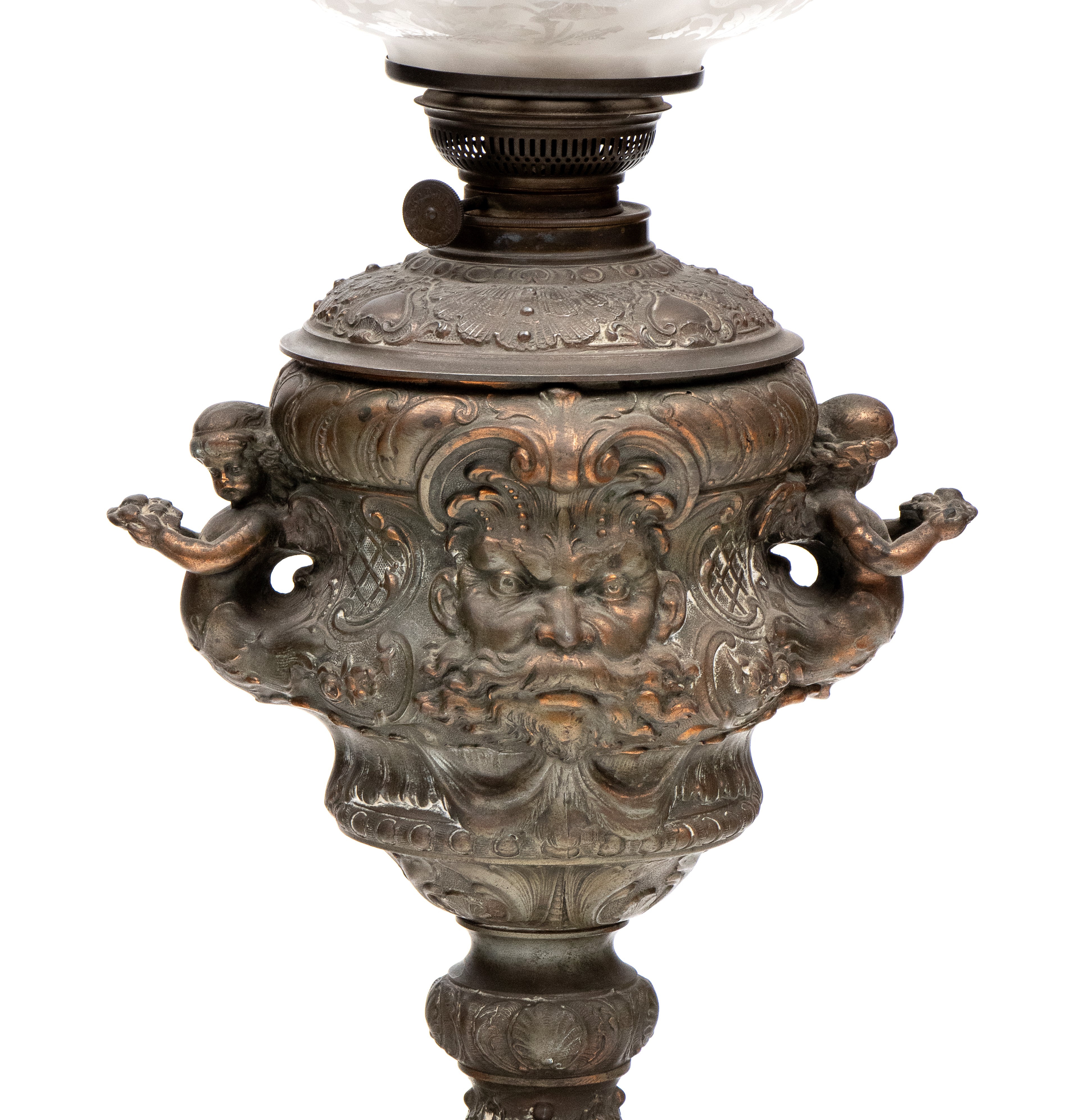 richly decorated with eclectic motifs, including masks, scrollwork, and winged figures on the sides. Light fixtures complete with frosted glass globes.
