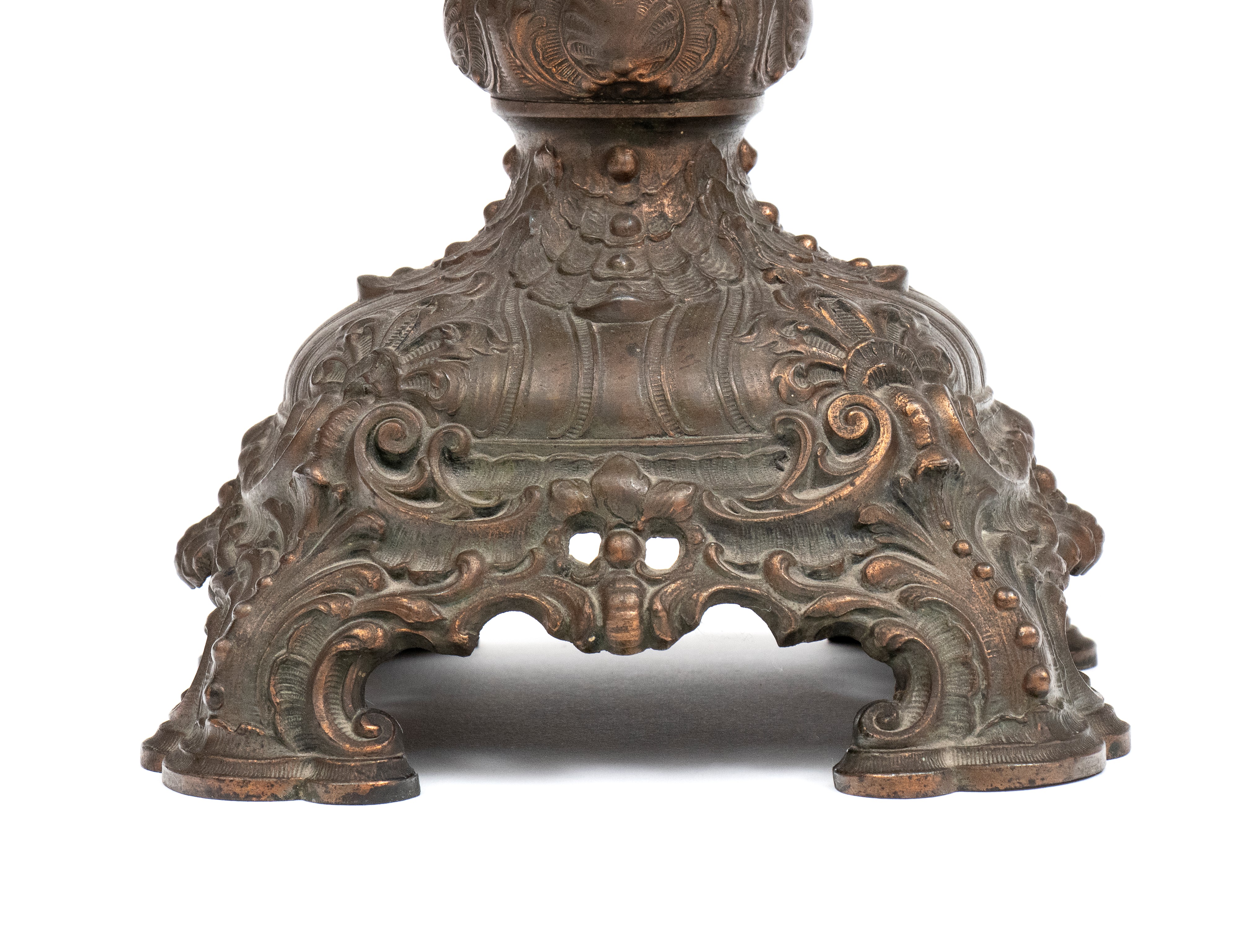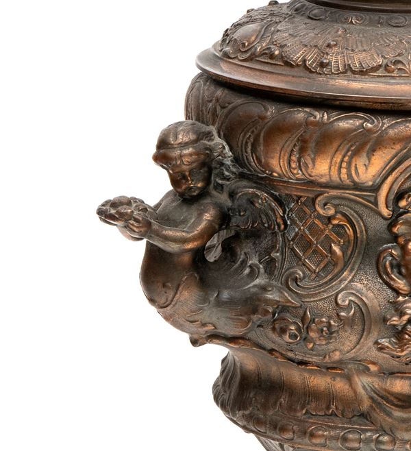 Pair of embossed metal oil lamps, 20th century