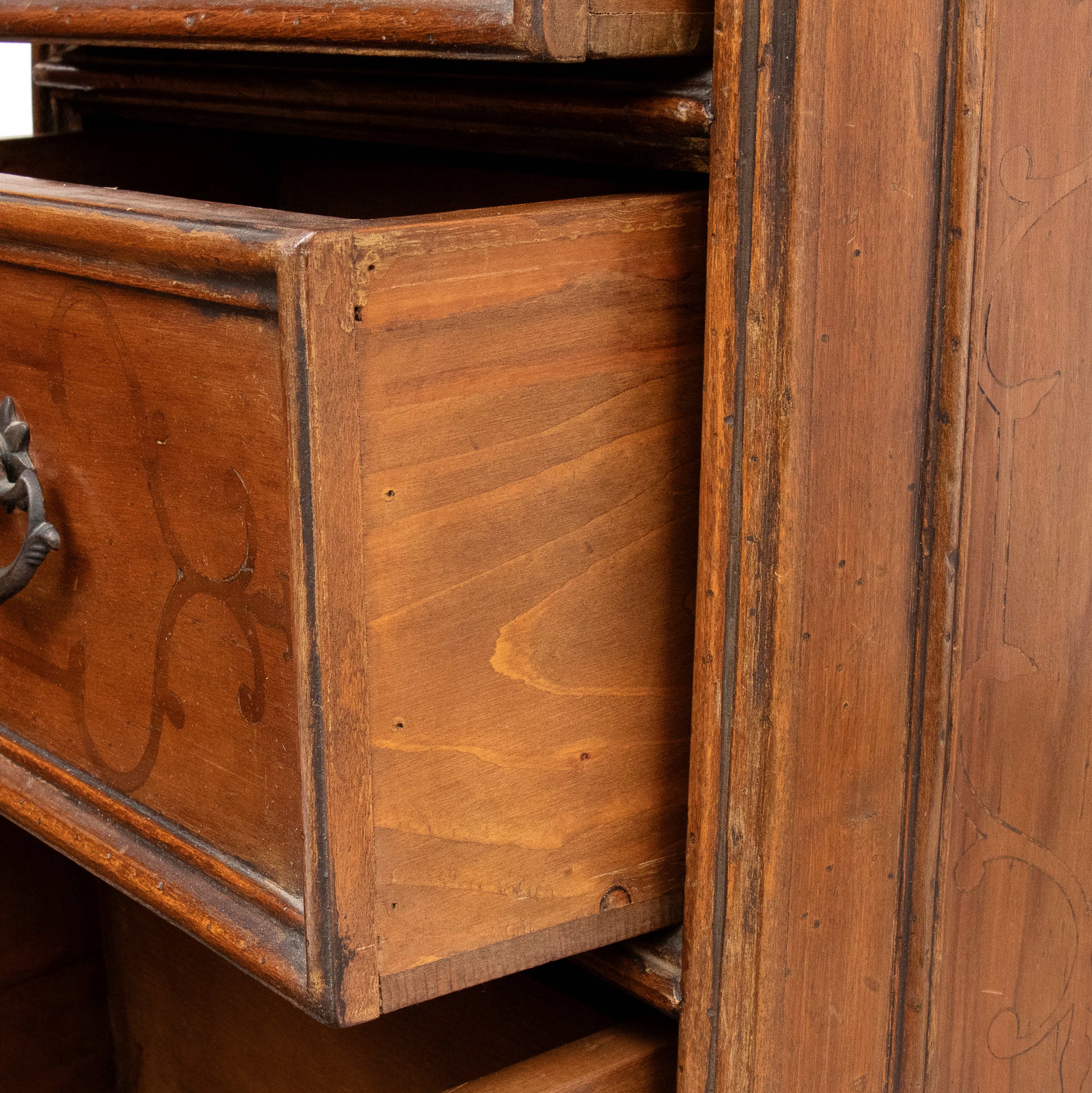 with three inlaid drawers and fluted sides; the linings were replaced in the late 19th century.