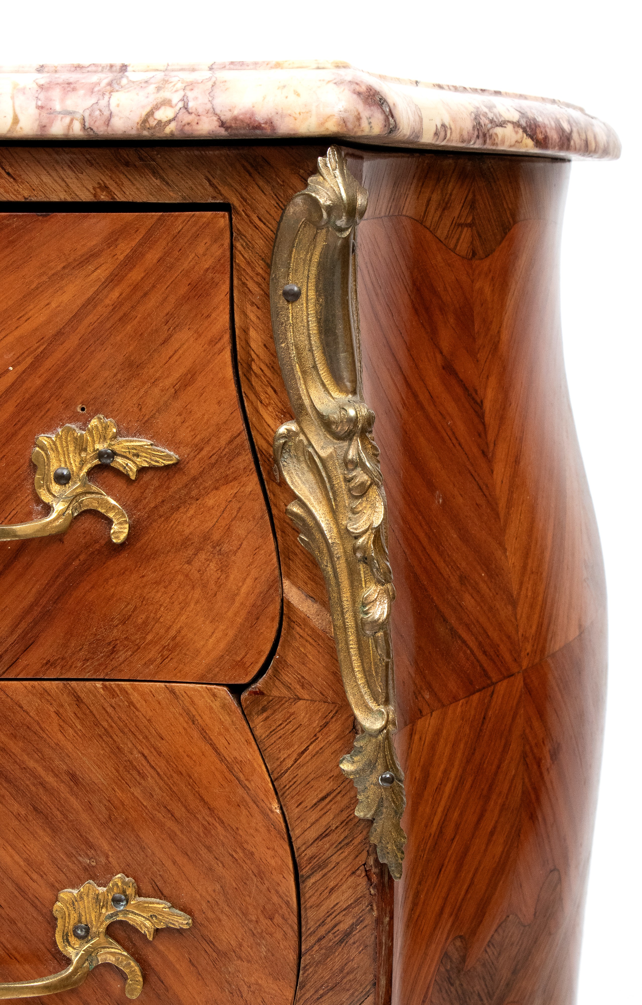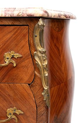 made of purple ebony with a wavy grain on the front and sides, featuring two contoured drawers on the front, embellished with finely chiseled gilded bronze handles and grilles; rounded legs with bronze accents and arched feet ending in sabots. Top in peach blossom marble.