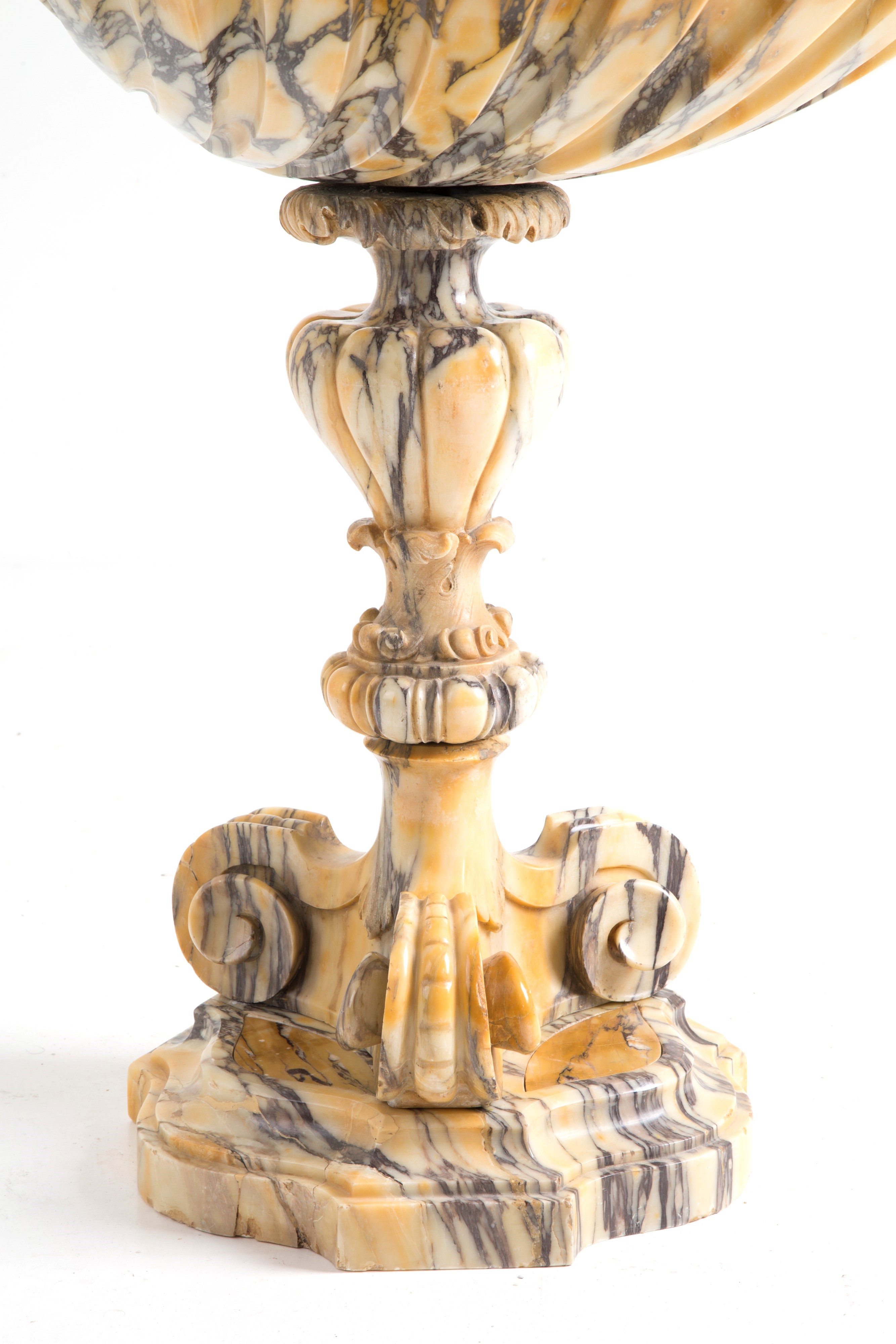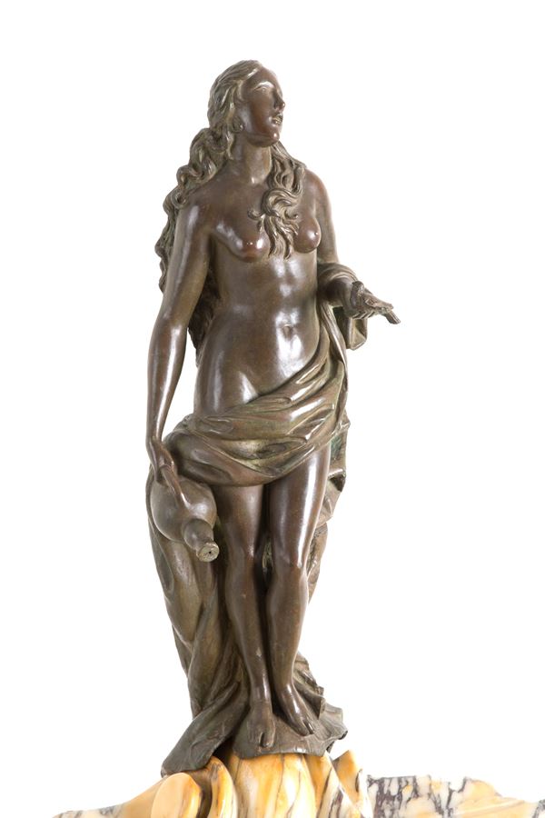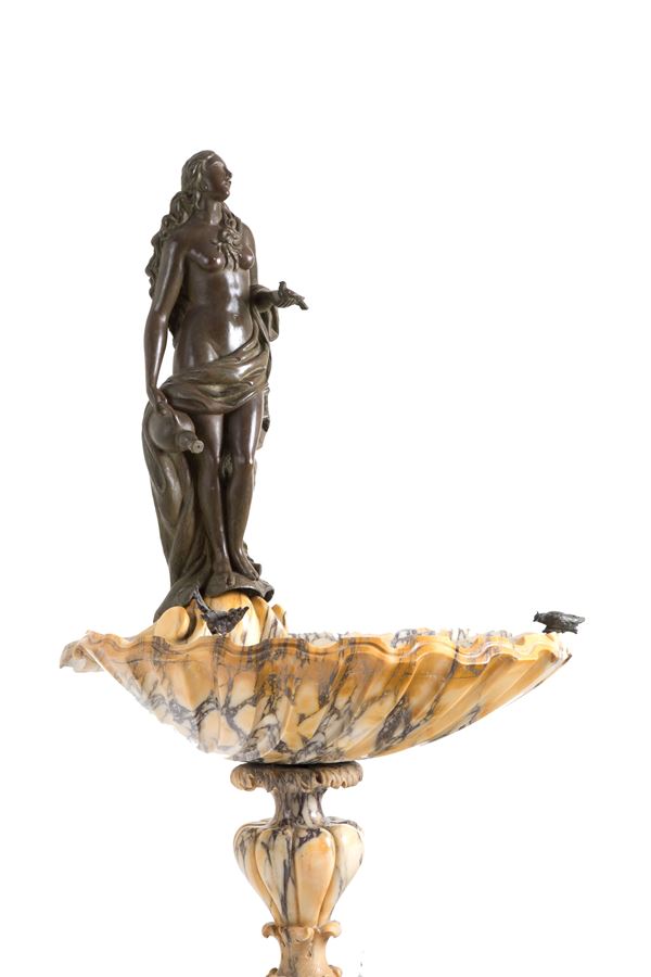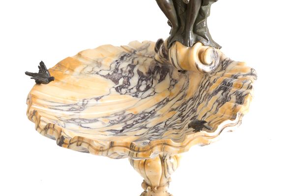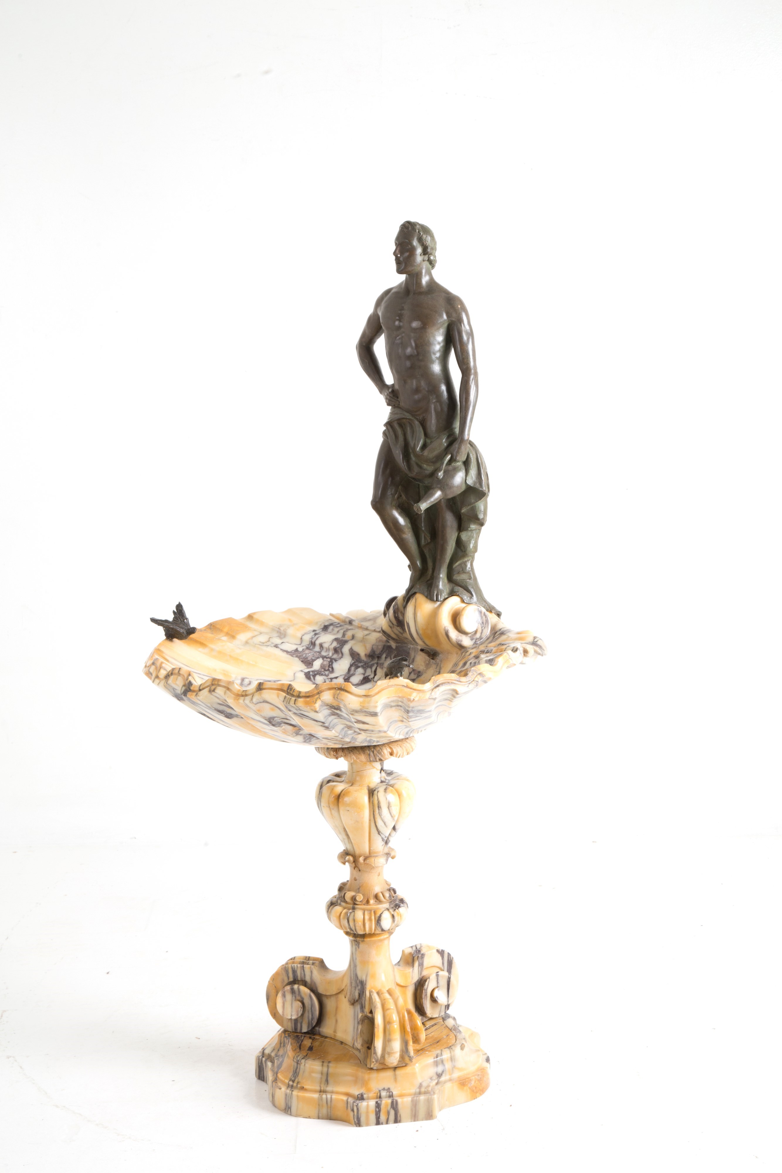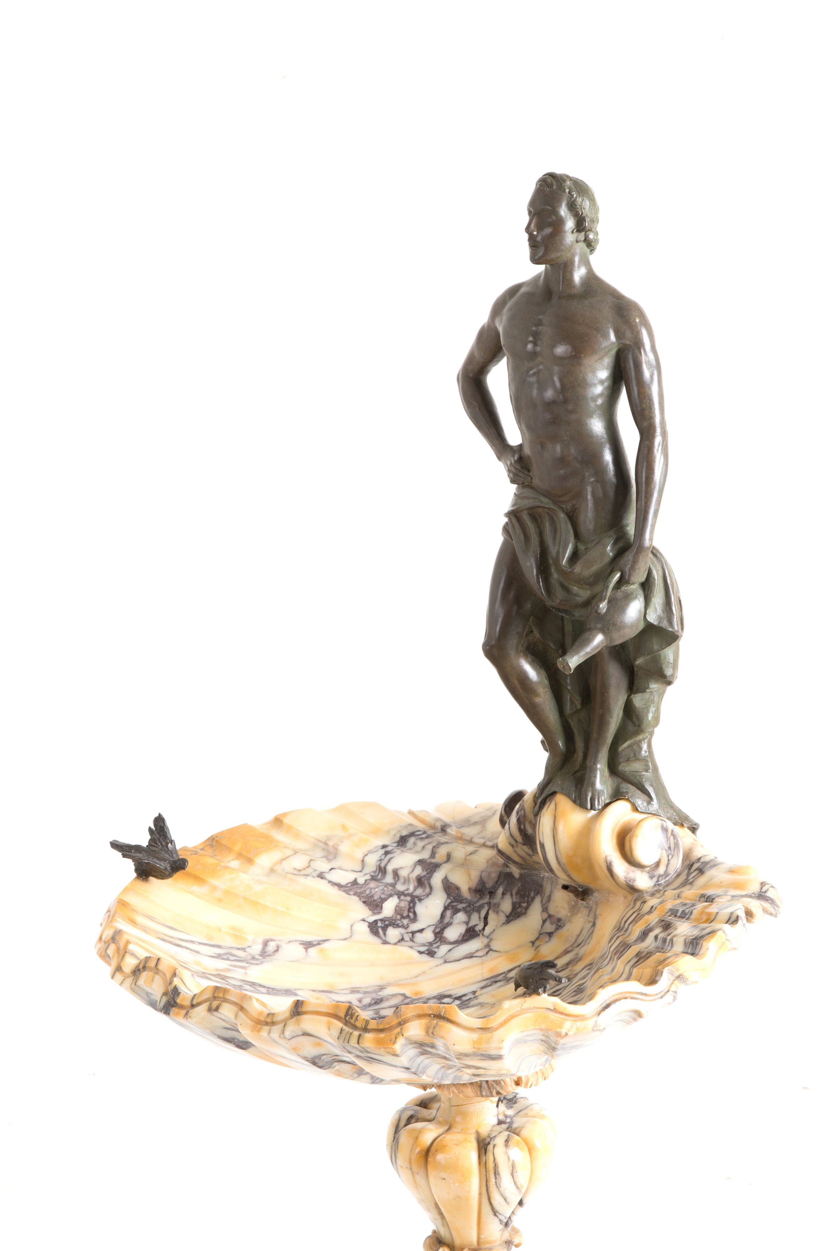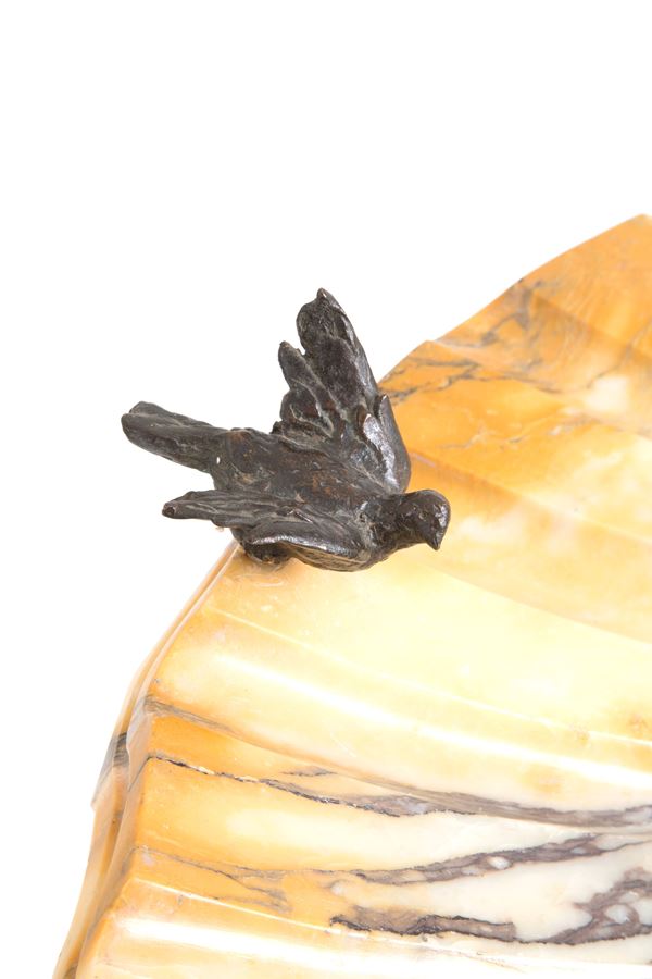 made of veined yellow marble in the shape of a seashell, with patinated bronze sculptures depicting a male figure, a female figure, and two birds.