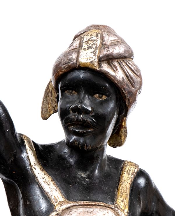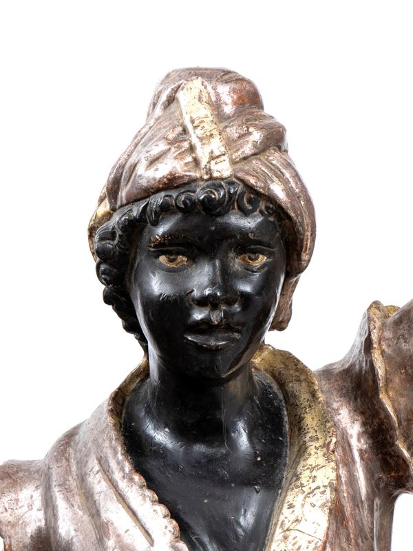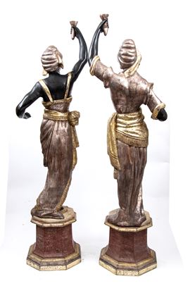 Northern Italy, depicting a man and a woman in exotic attire, carved from wood and painted with a polychrome and gilded finish. The figures rest on sculpted bases made of lacquered wood with a marbled effect.