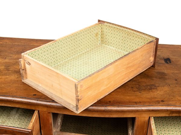three-door cabinet with a curved top, featuring delicate carvings on the fronts of the drawers and doors.