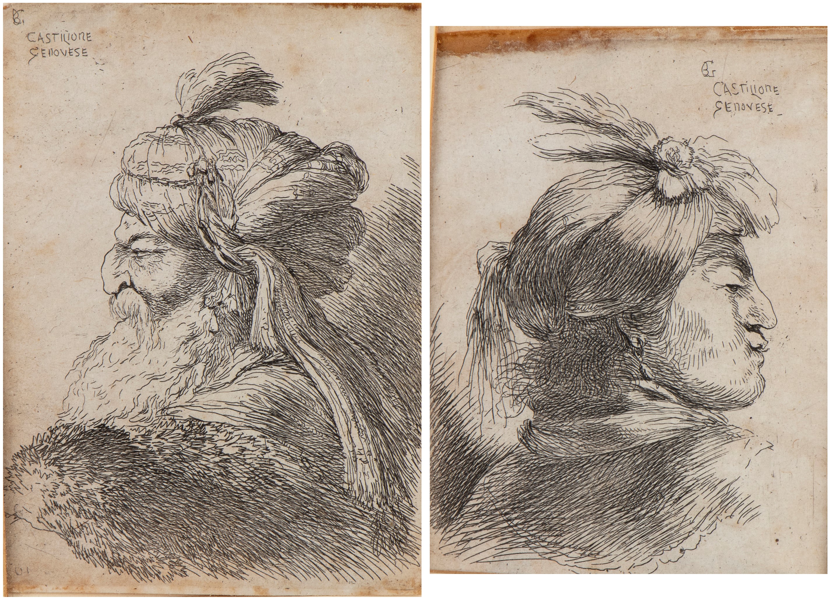 Tirature tarde stampate su carta non vergata. Esemplari rifilati. Entrambi restaurati con carta vergata. Residui di nastro cartaceo al verso. Entrambe con cornici, passe-partout e vetro (27 x 24 x 2 cm cad.)