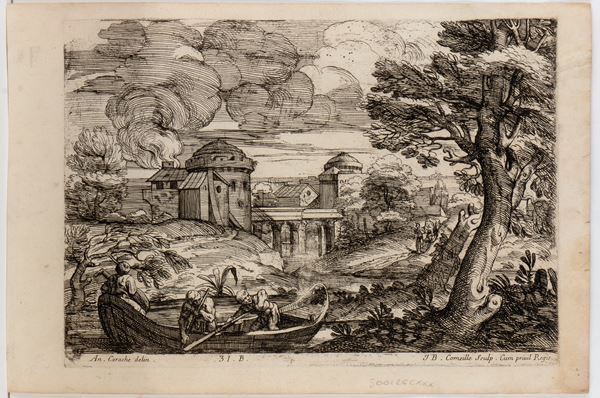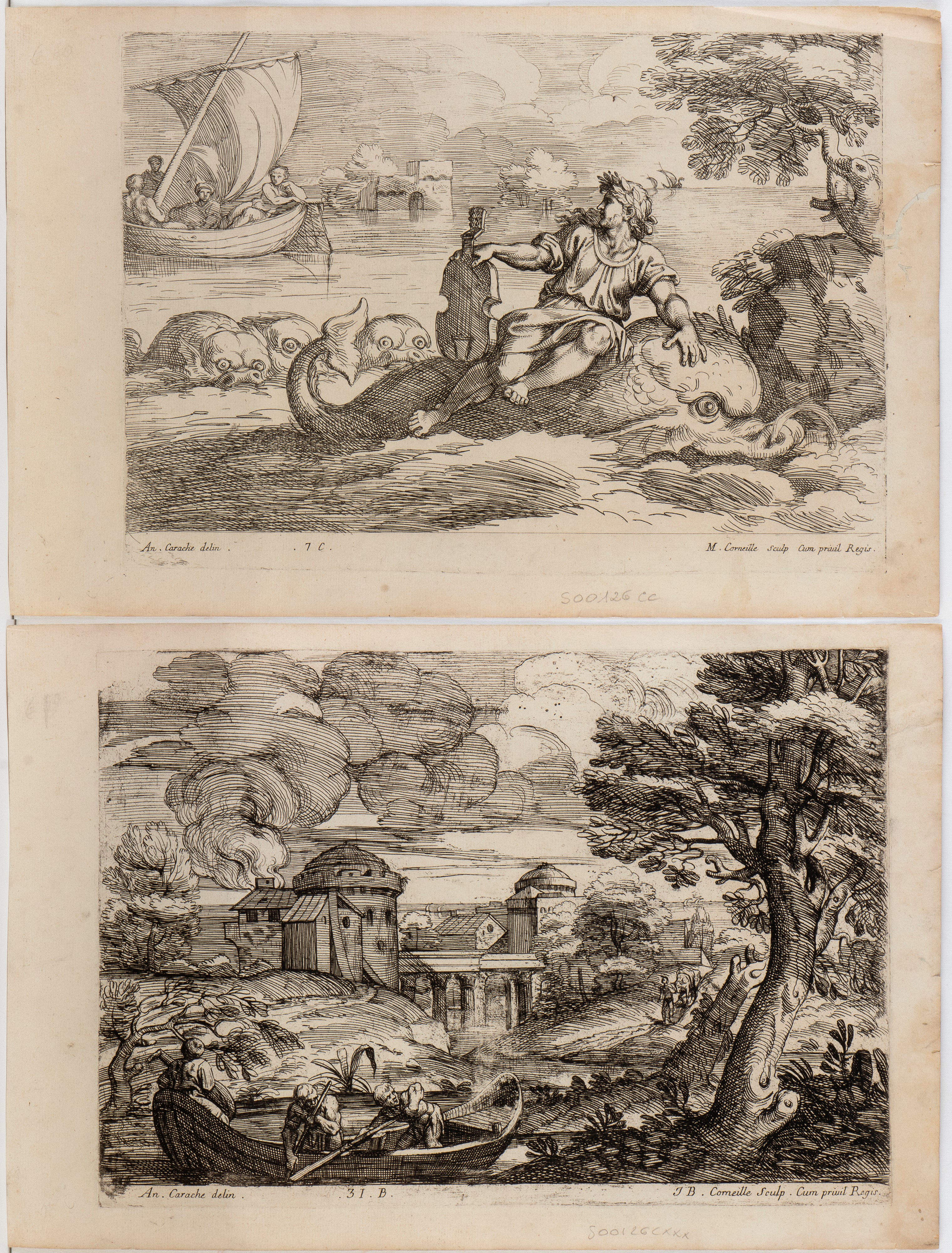 Lotto di due incisioni dalla serie "Recueil de 283 estampes gravées à l'eau forte d'après les dessins originaux... que Mons. Evrard Jabach de Cologne... possédait". Acquaforte. 320 x 482 mm (cad. foglio). IFF 71 e 78.
