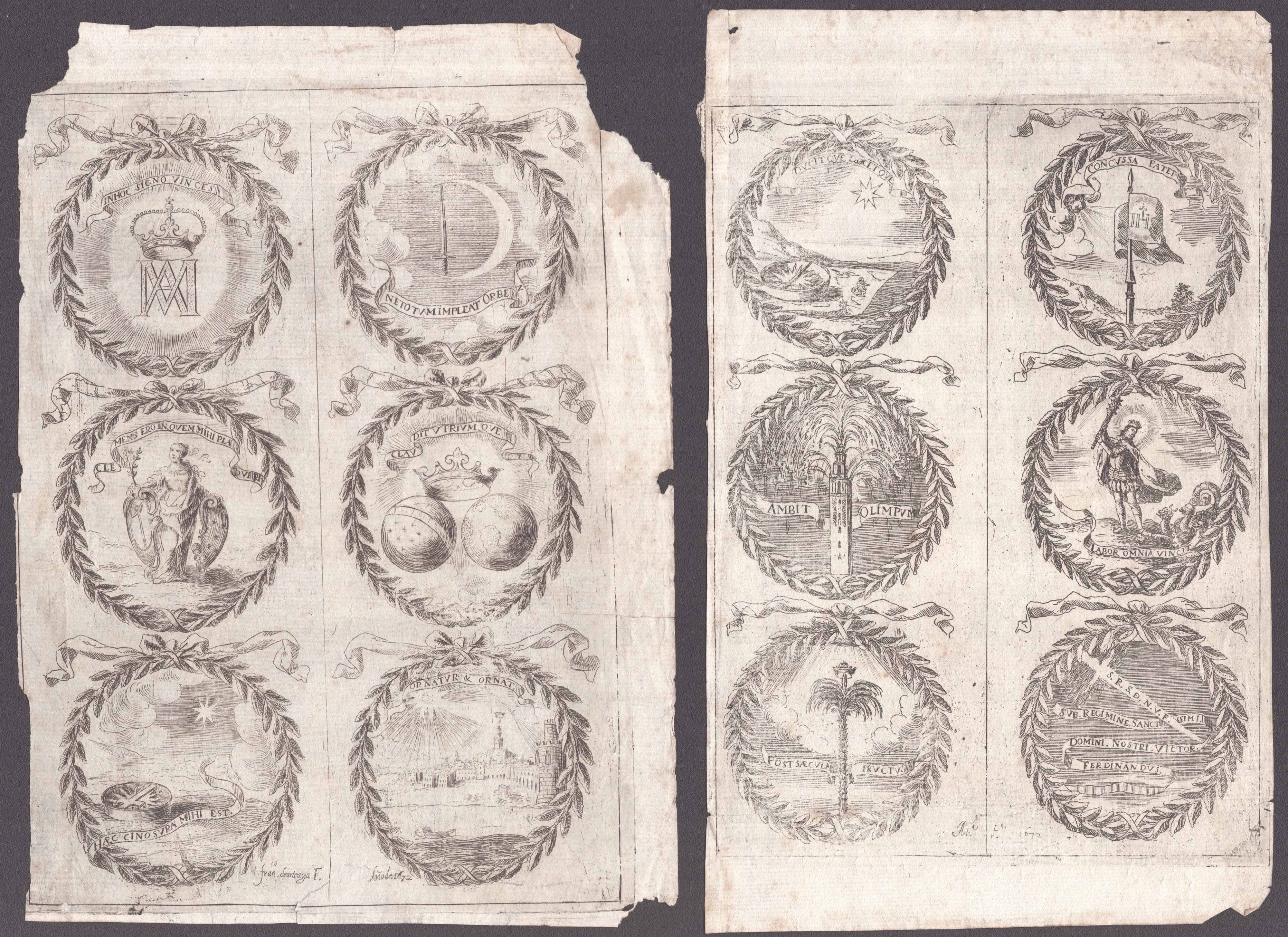 Lotto di due tavole tratte da "Fiestas de la Santa Iglesia de Sevilla", pubblicate a Sevilla nel 1672 in occasione di canonizzazione di Ferdinando III, re di Castiglia (1217-1252).