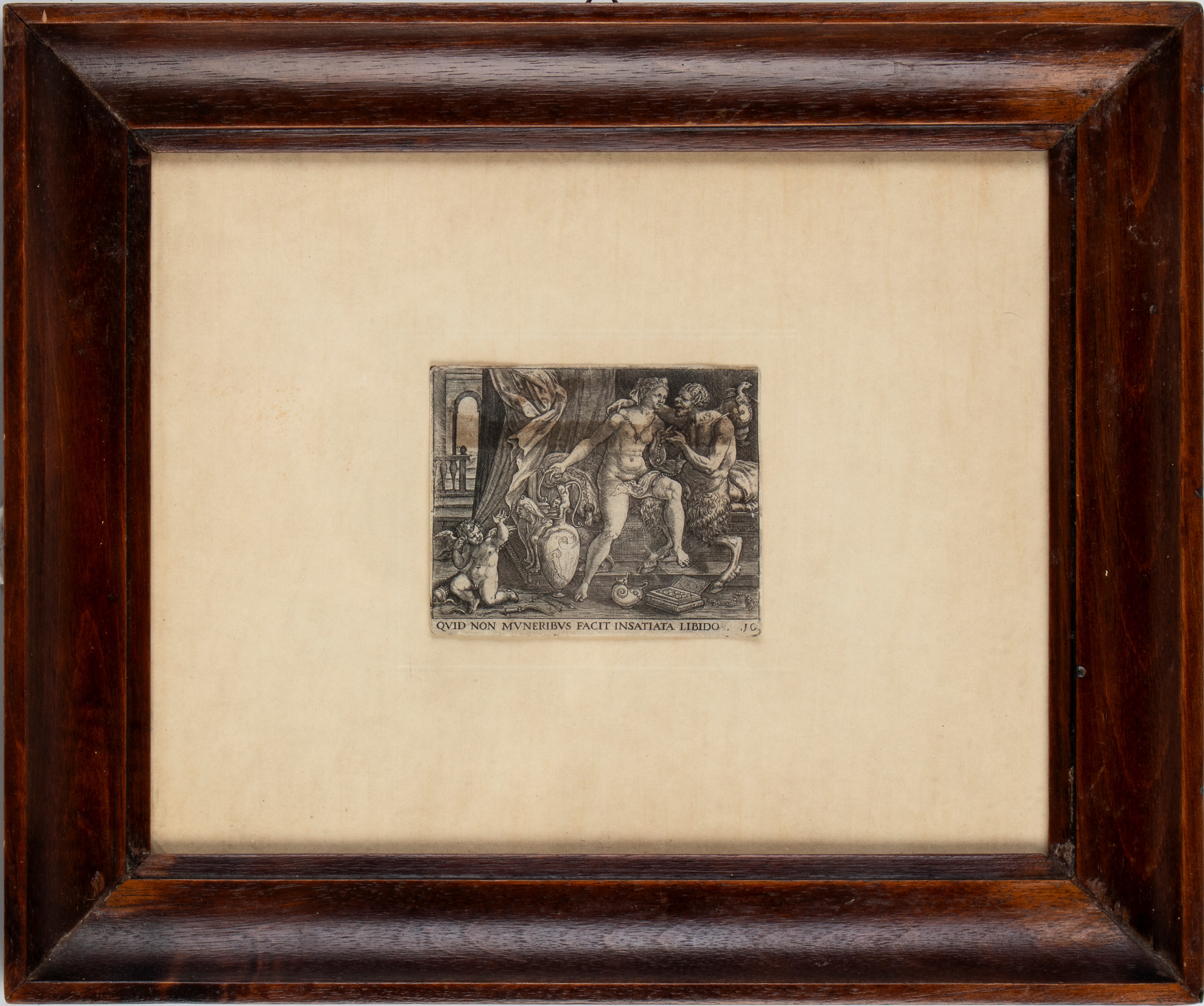 Bulino, 67 x 82 mm. Incisione tratta dal libro di "Emblemata nobilitati", pubblicata da De Bry per la prima volta a Francoforte nel 1552. Hollstein 240-287.