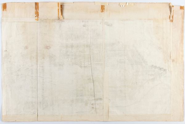 Impressione con leggero plate-tone, stampata su carta vergata con piccoli margini di circa 1 mm su tre lati ed un margine 17 mm sul lato destro. Altri margini ricostruiti con una carta vergata. Tracce di due consuete pieghe verticali ed un altra piega. Strappo lungo una della pieghe. Due leggere macchie ed alcune abrasioni alla impressione, ma nel complesso in stato di conservazione molto buono. Difetti ai margini ricostruiti. Rara.