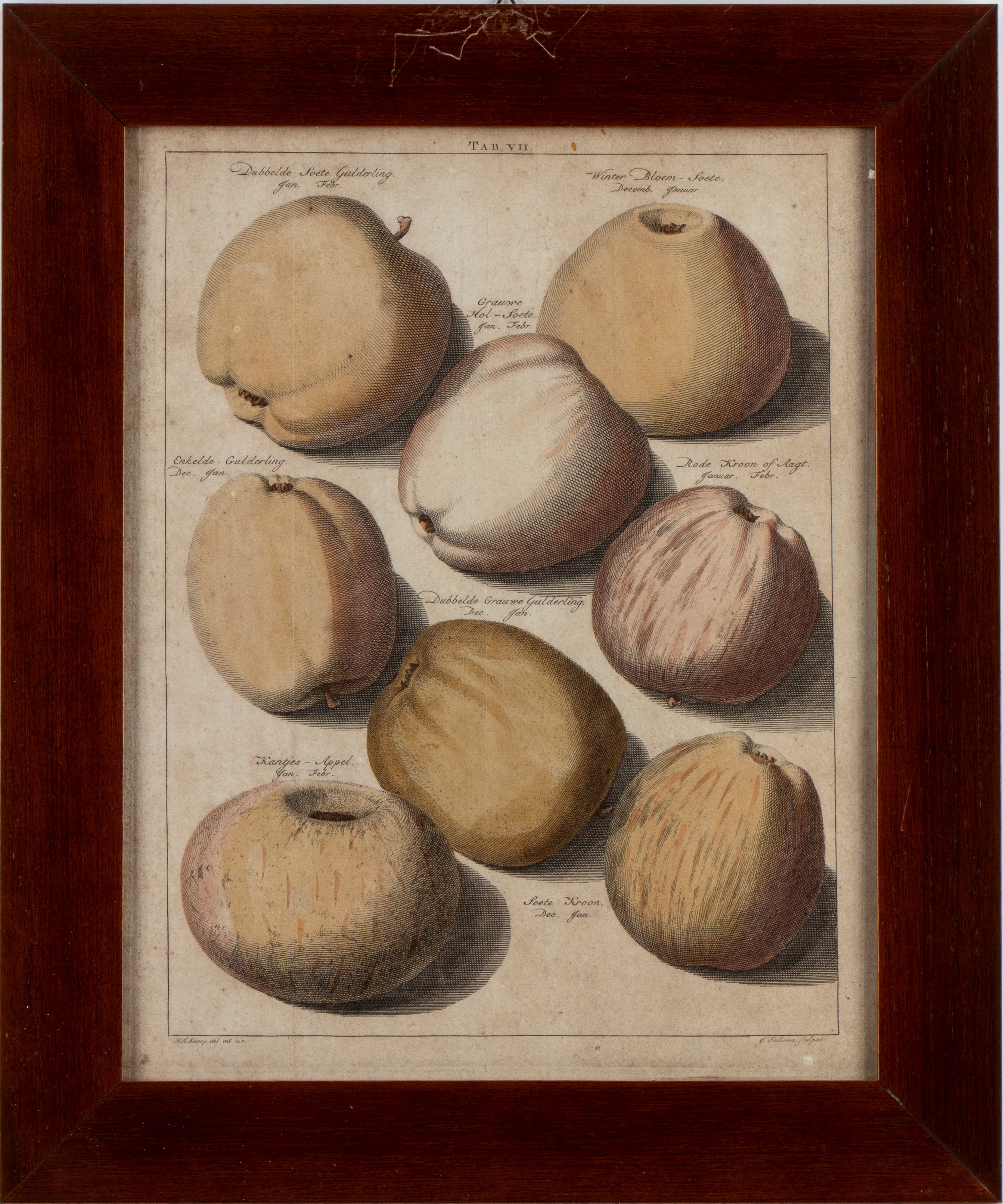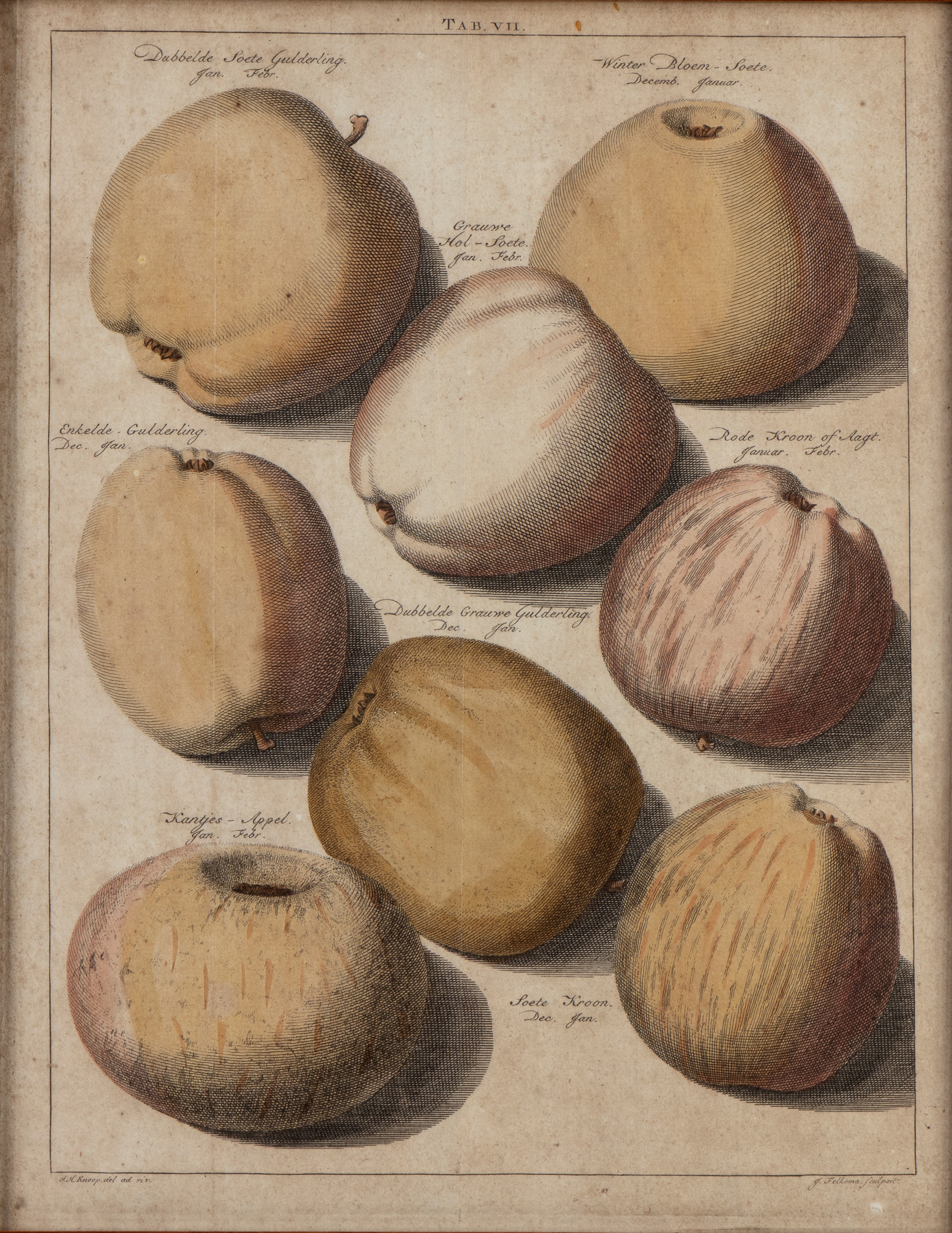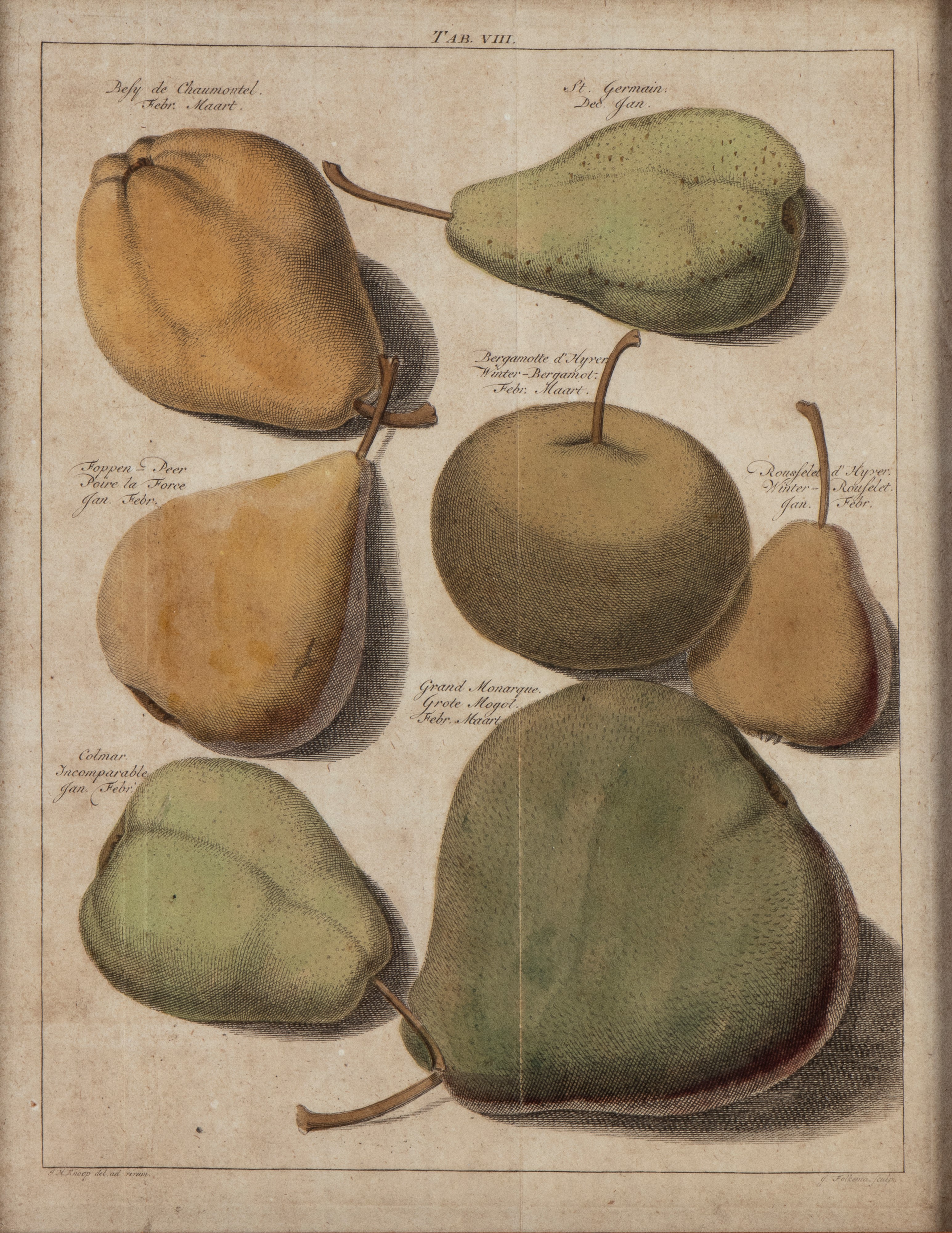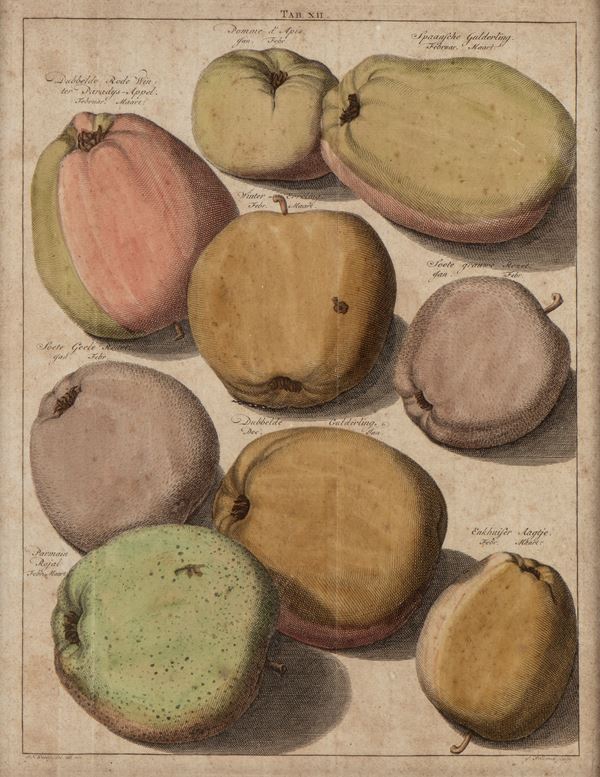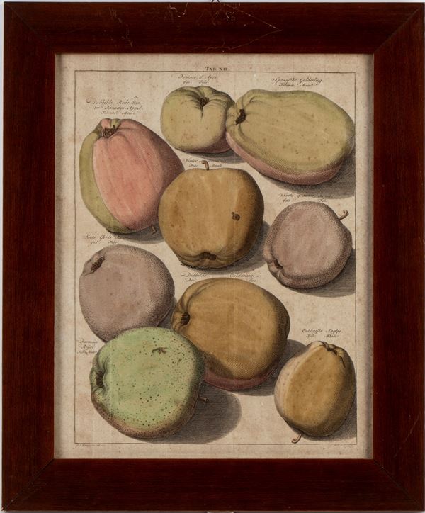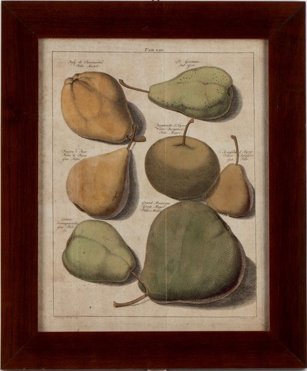 Lotto ti tre tavole (VII, VIII, XII) raffiguranti diversi tipi di pere e di mele, tratte da "'Pomologia" di Johann Hermann Knoop.
