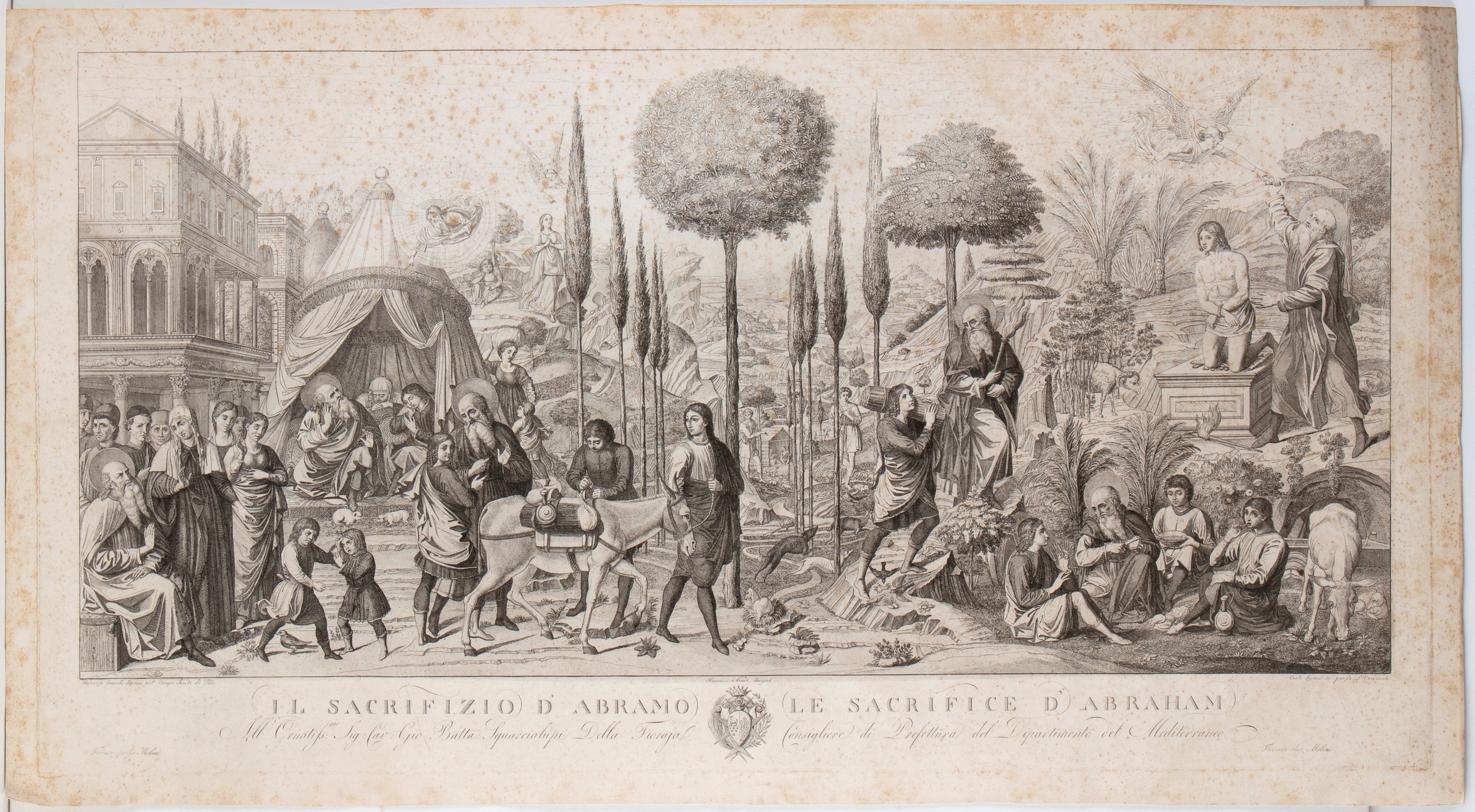 Bella impressione su carta non vergata. Foglio con margini di circa 2 cm su ogni lato. Fioritura sparsa e traccia du una piega centrale verticale. Per il resto in buono stato di conservazione.
