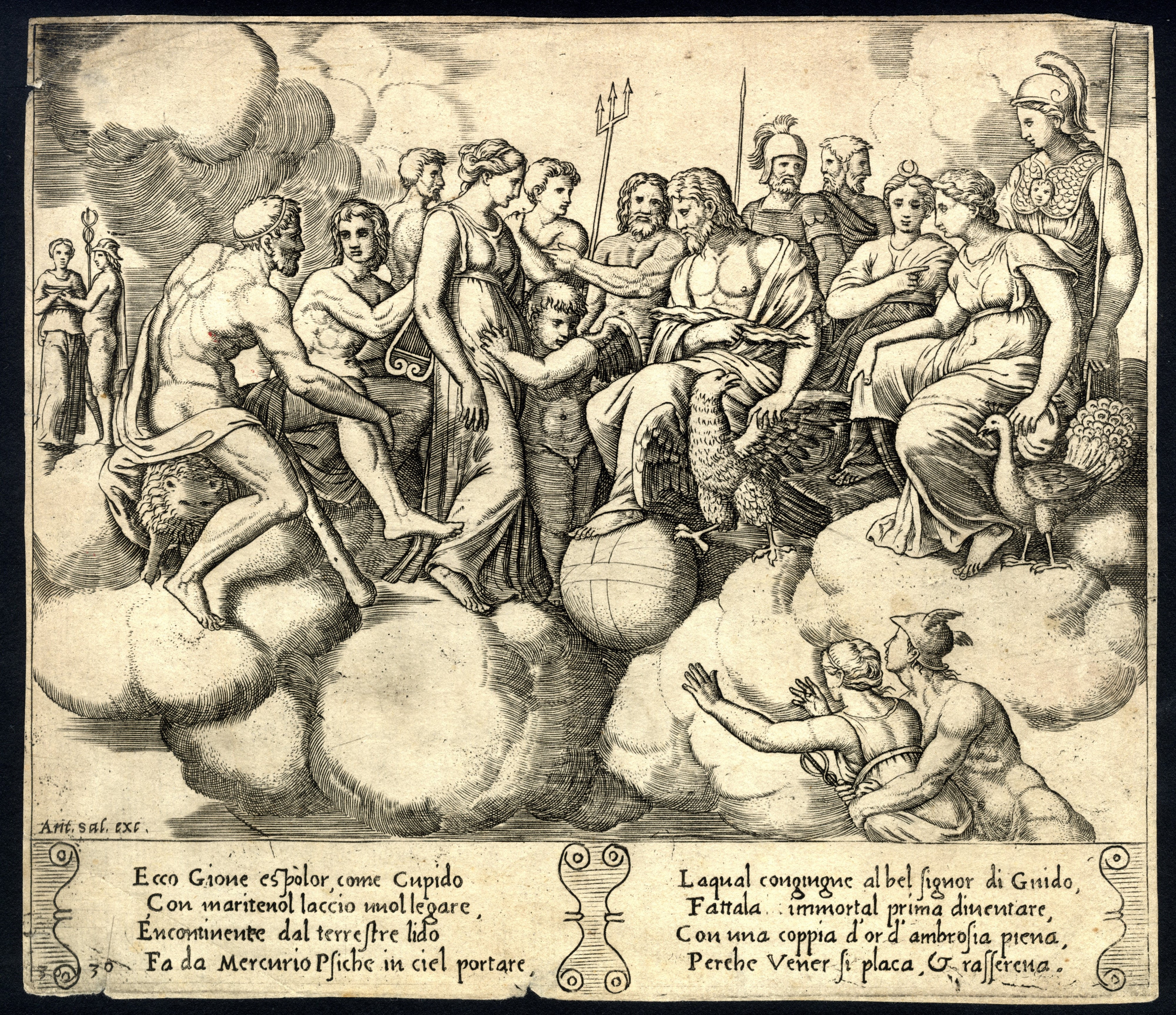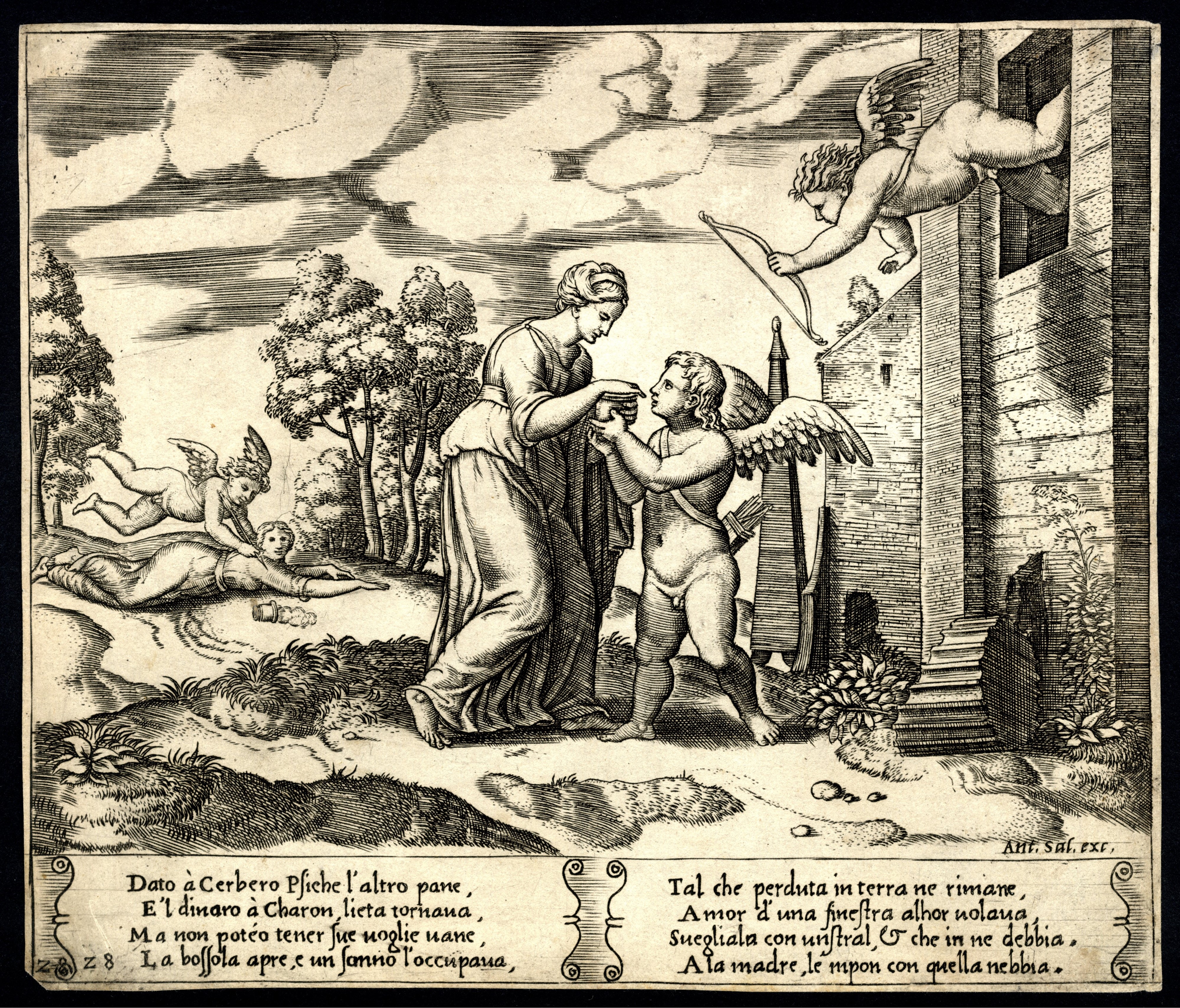 Lotto di due incisioni dalla serie con la storia di Amore e Psiche. Bulino, 195 x 230 mm ca. cad. 2. Stato II su 2, con l'indirizzo di Antonio Salamanca, ritoccate da Francesco Villamena Bartsch XV.222.66 e 68.