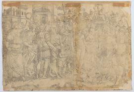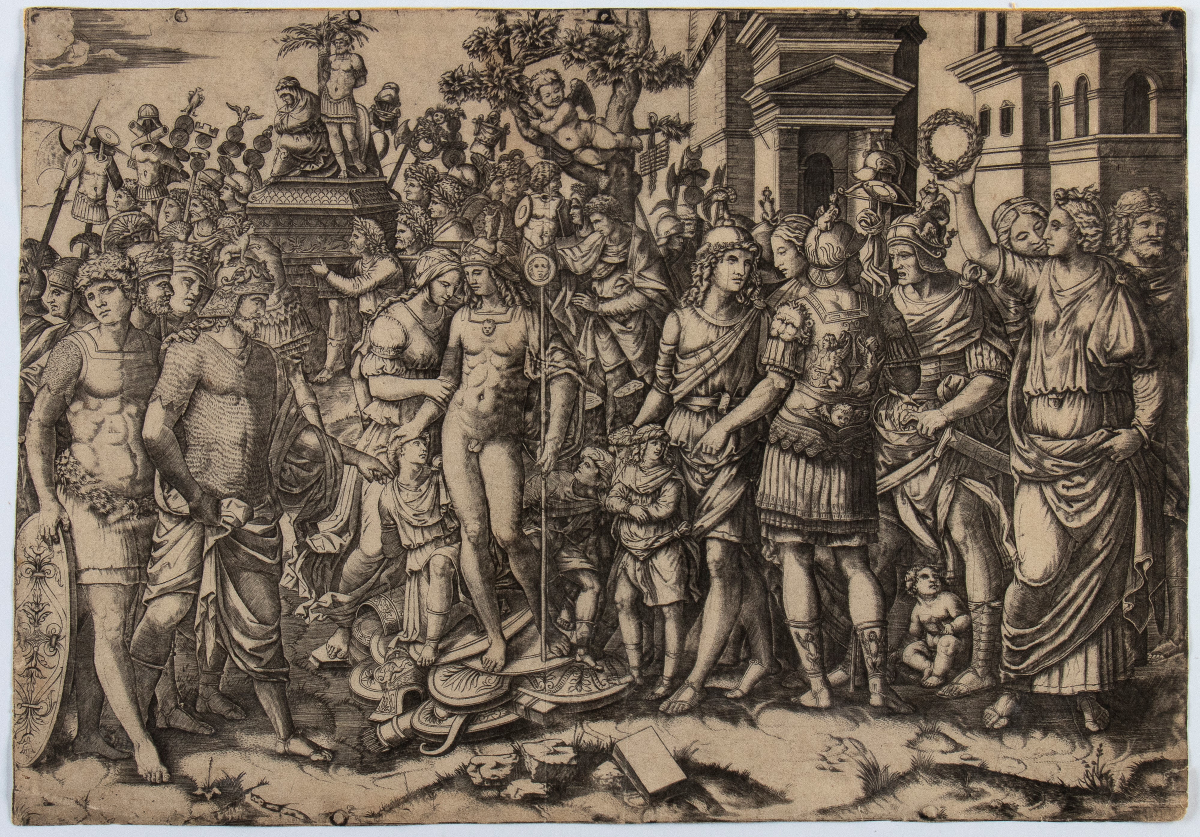 Questa è una copia della stampa di Raimondi, descritta da Bartsch, e spesso confusa con l’originale. La copia è stata successivamente ritoccata da un artista anonimo. Le prove ritoccate possono essere identificate dai fori presenti lungo i quattro bordi della lastra: sette in alto, sei in basso, tre a sinistra e due a destra. Questi fori suggeriscono che la tavola fosse stata dorata e inchiodata a un mobile d’arredo.