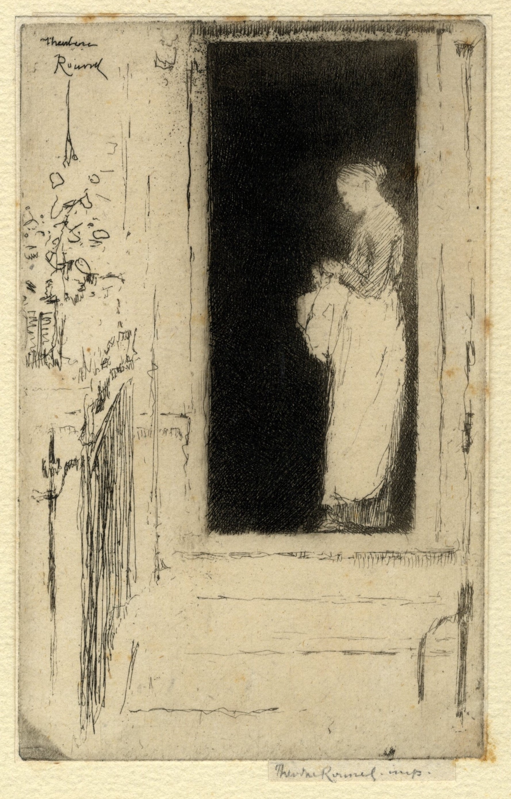 Molto bella impressione con surface tone stampata su carta vergata. Sottilissimi margini oltre alla battuta della lastra. Firmato e iscritto in basso: Théodore Roussel imp. Foglio applicato lungo il bordo inferiore e il bordo superiore su un compensato.