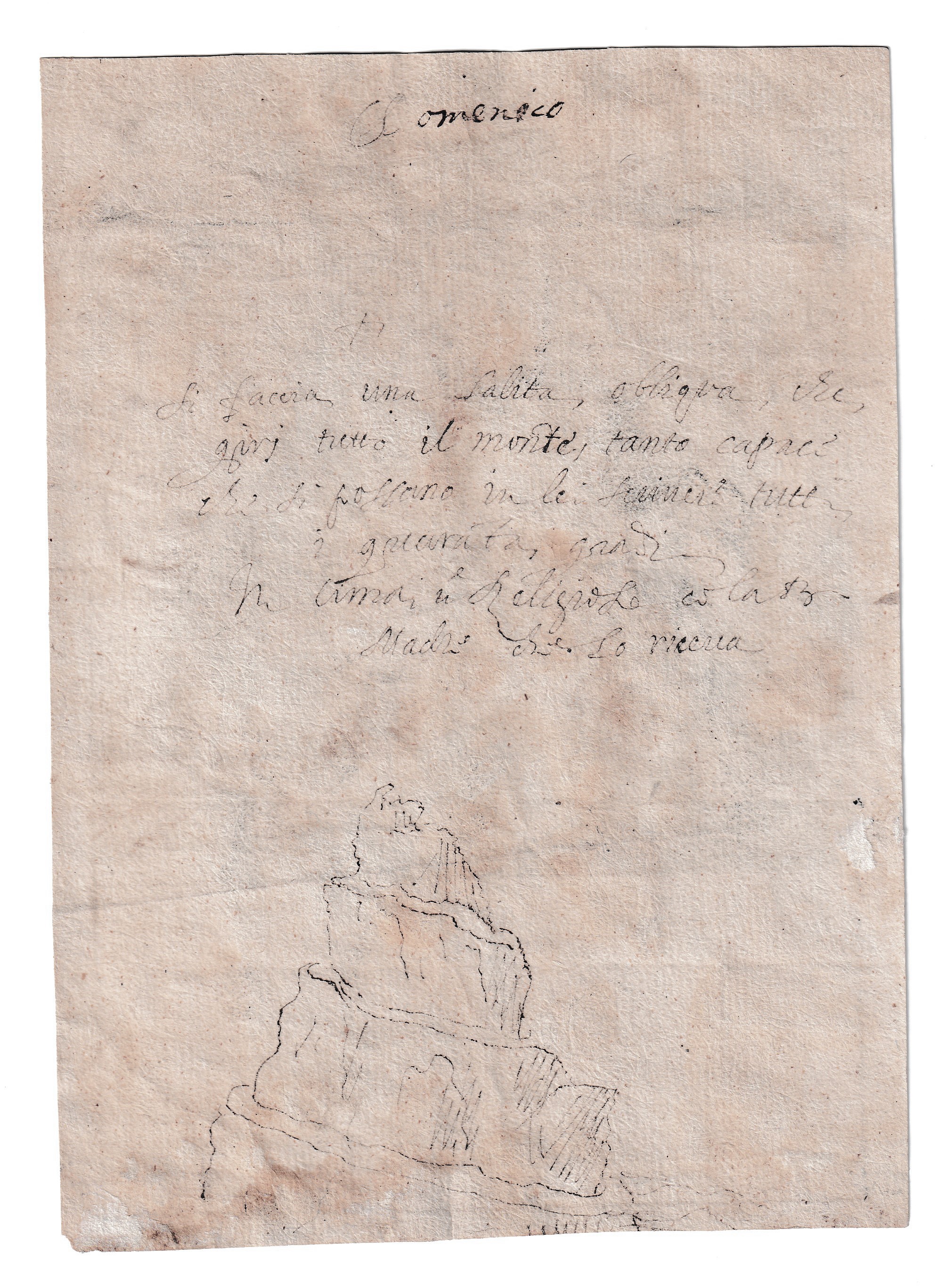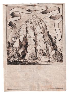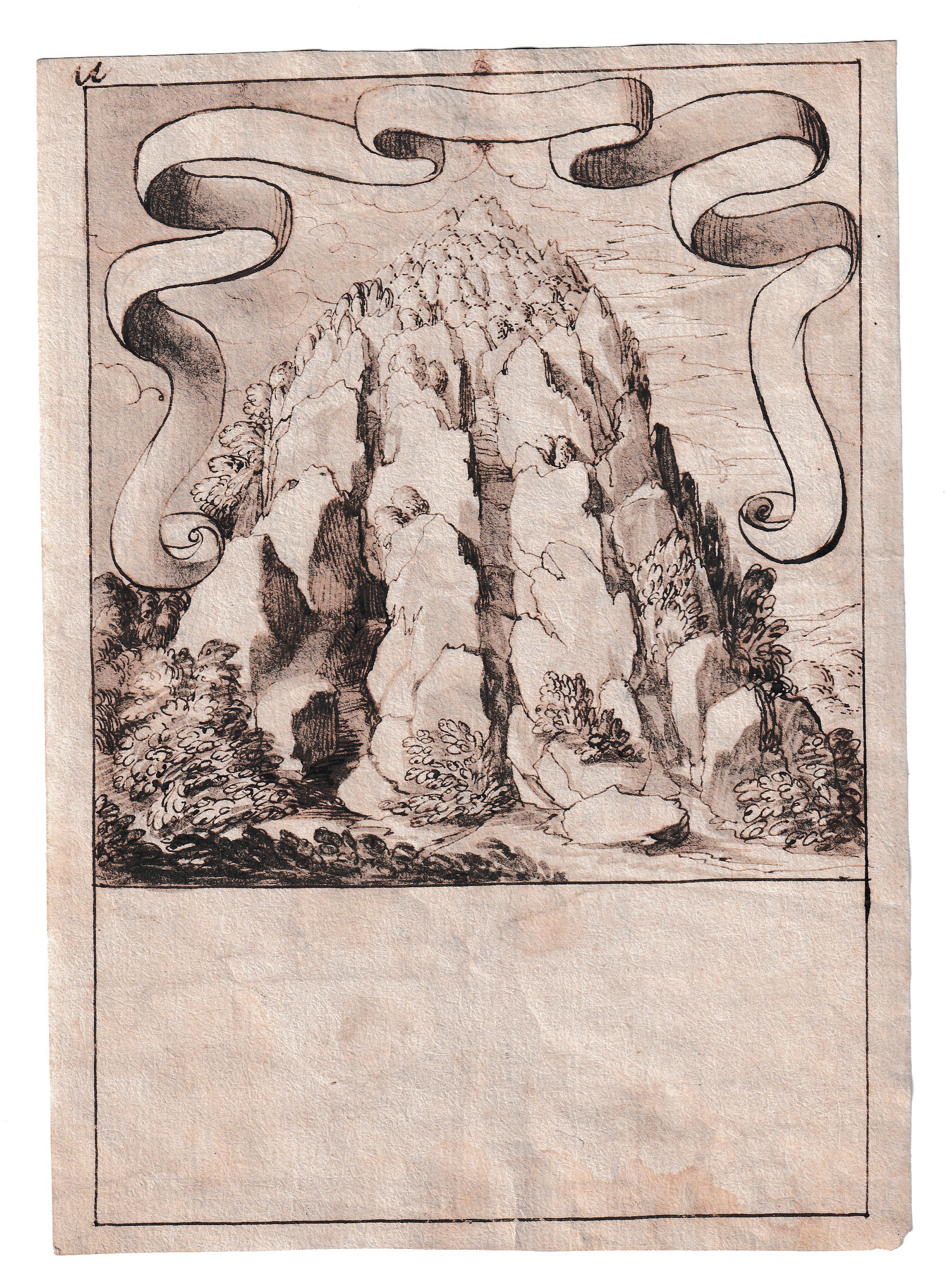Penna, inchiostro bruno e acquarello su carta vergata priva di filigrana, 212 x 154 mm. Al verso iscrizione coeve ad inchiostro e una altro disegno di una montagna.