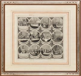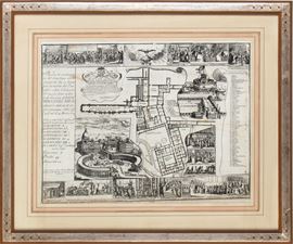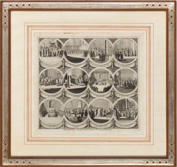 Molto bella impressione su carta vergata. Foglio con traccia di pieghe verticali e orizzontali. Alcune usure, piccoli strappi e lacune lungo le pieghe, ma per il resto in buono stato. Con passe-partout, vetro e cornice (59 x 72 x 3 cm). La stampa non รจ stata esaminata fuori dalla cornice. Rara.