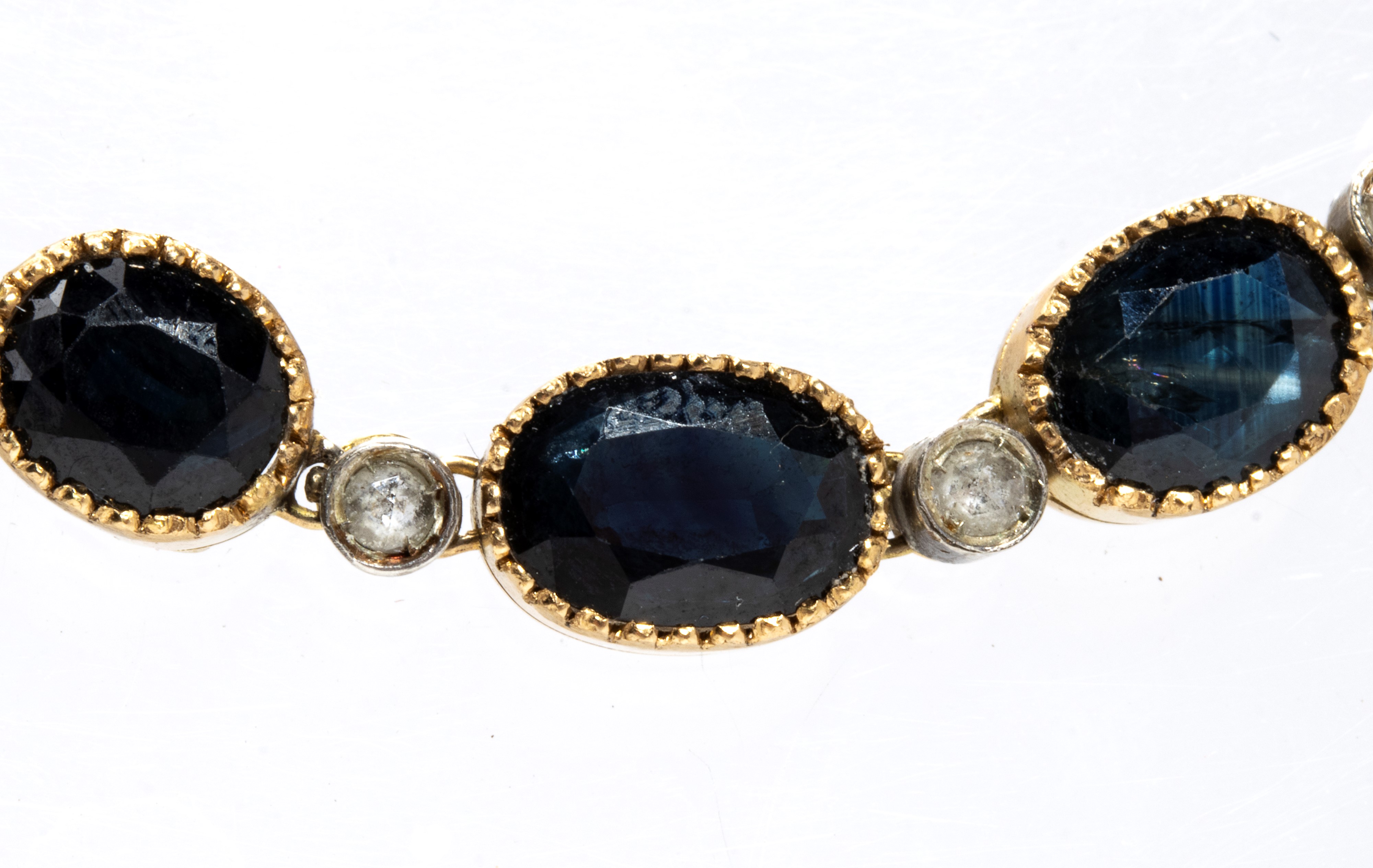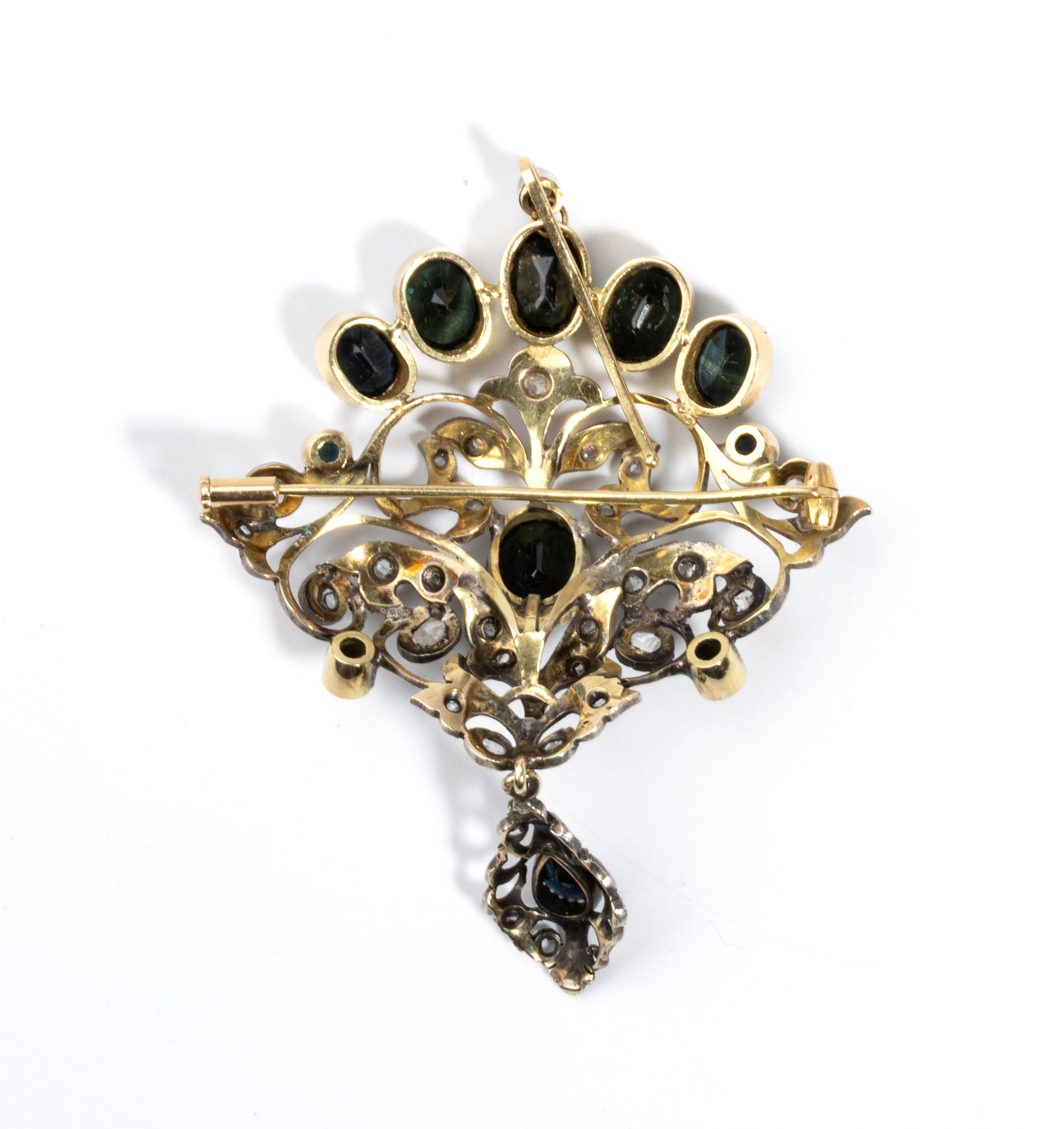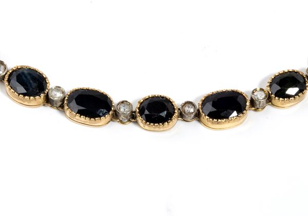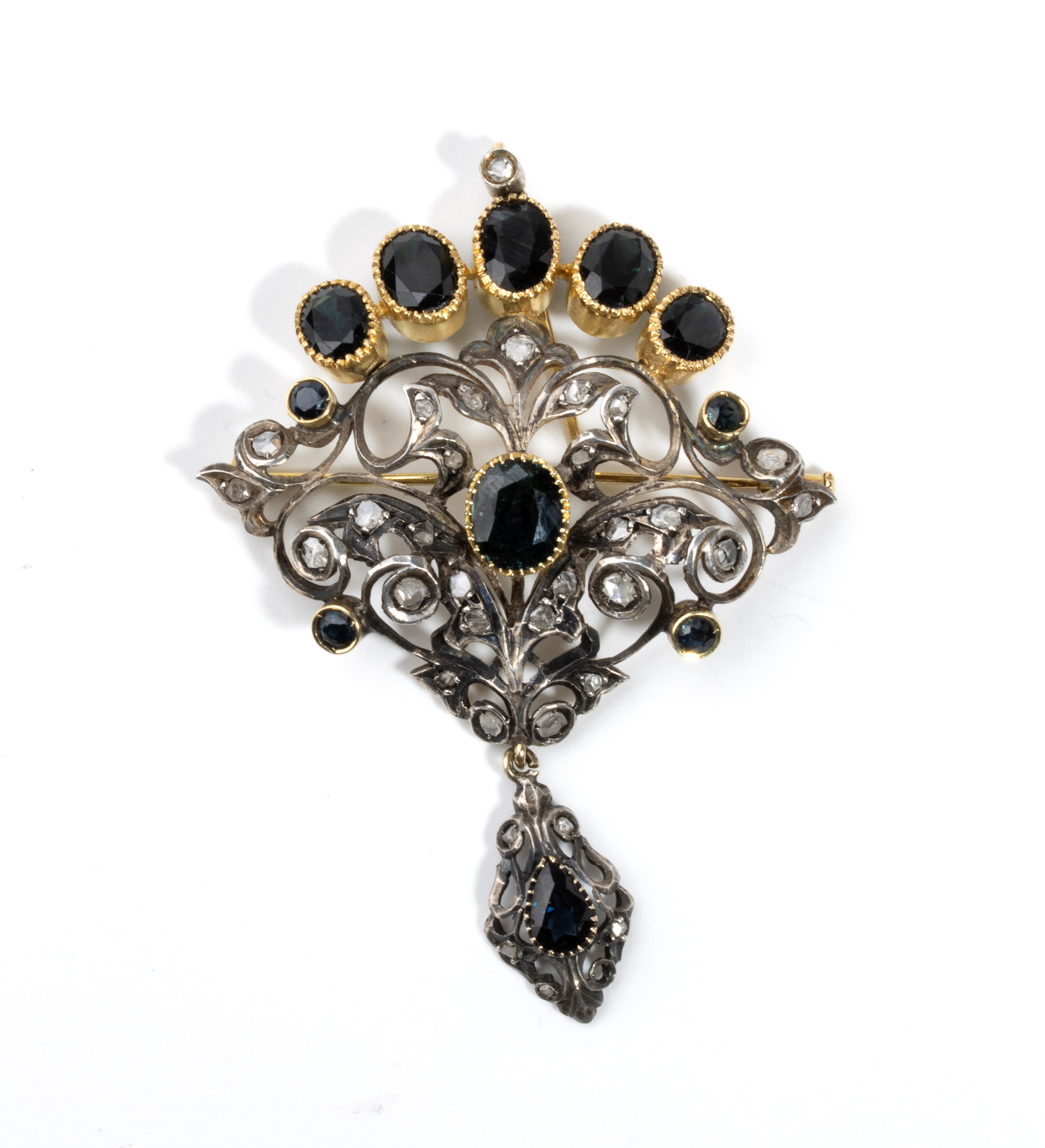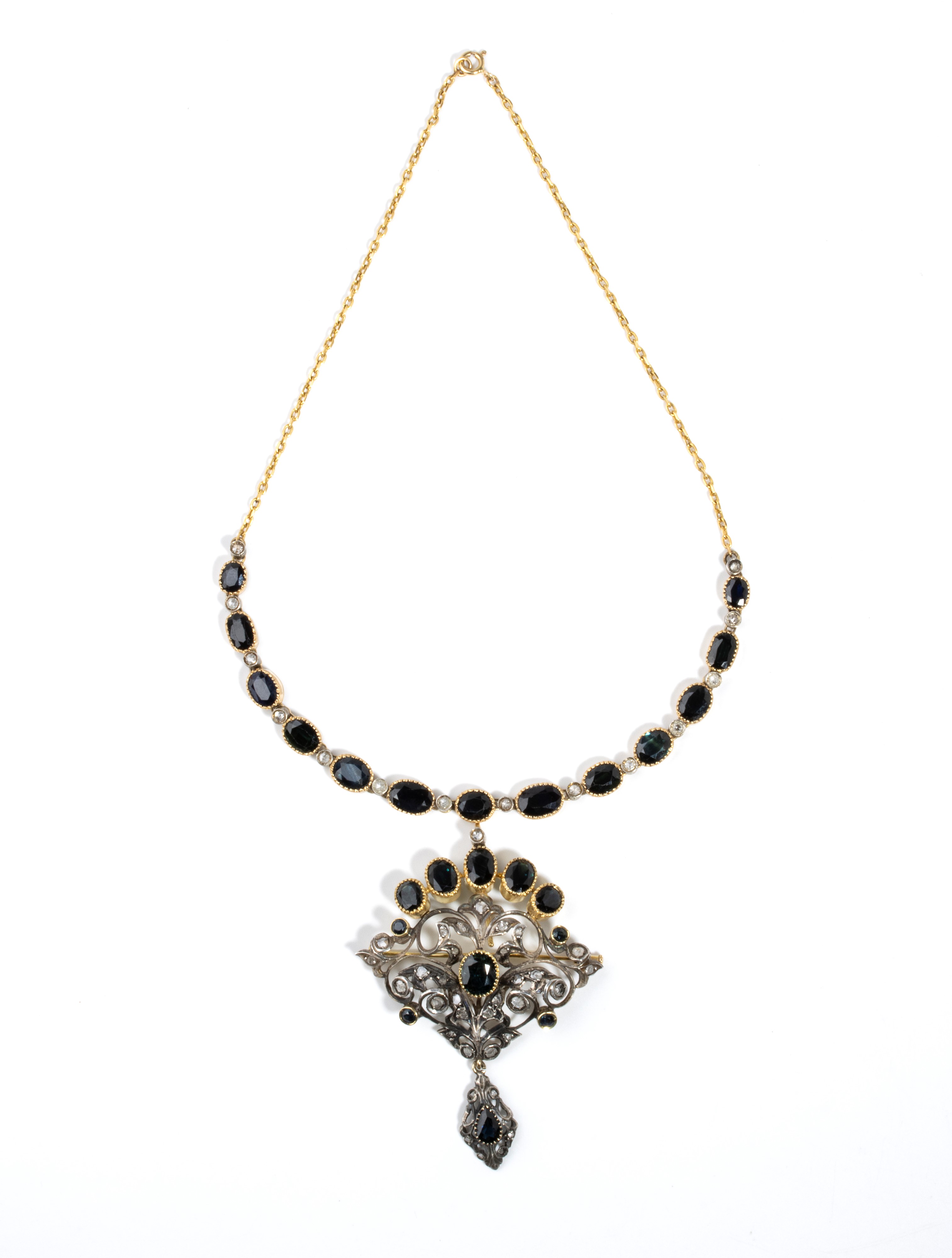 yellow gold and silver, a chain link choker set with line of blue sapphires and rose cut diamonds; an openwork brooch-pendant with plant motifs embellished with sapphires and rose cut diamonds.