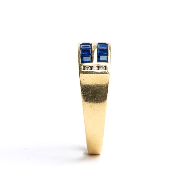 18k yellow gold, set with two rows of sapphires flanked by diamonds.