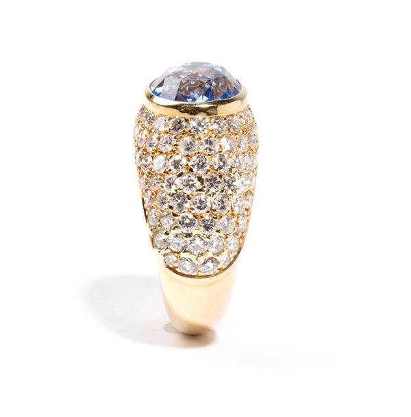 yellow gold, set with oval shaped blue sapphire surrounded by pave set diamonds.