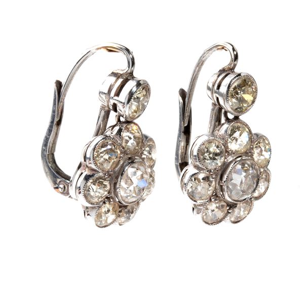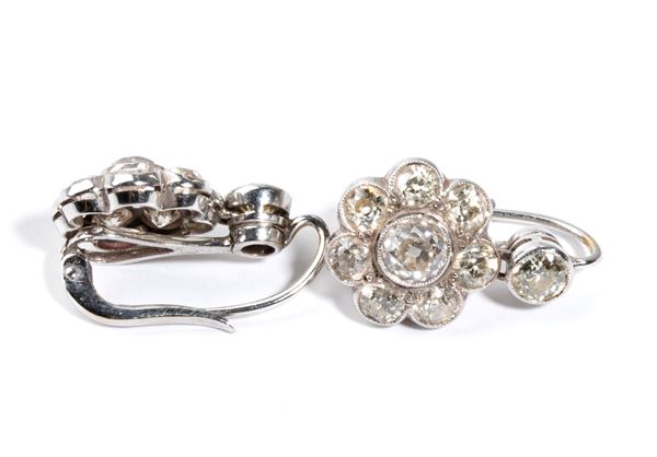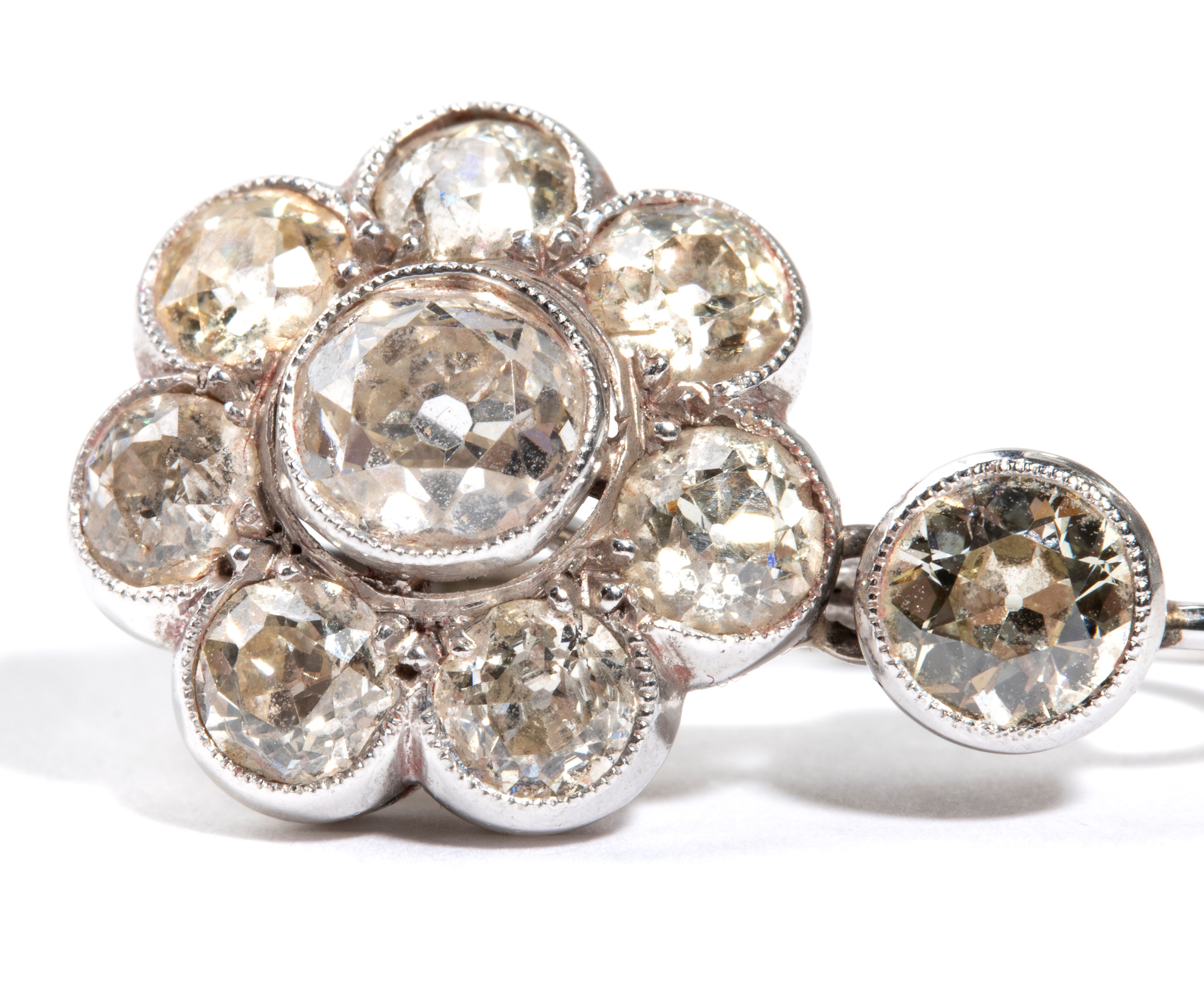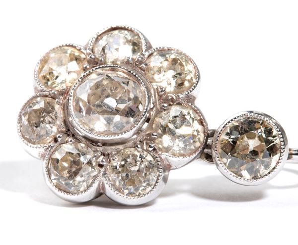 white gold flower-shaped, set with old mine cut diamonds, estimated to weigh a total of approx. 4.50 carats, as measured and graded in the mount.