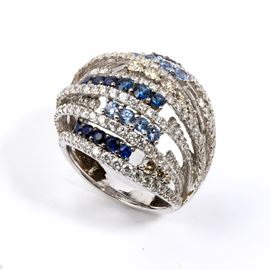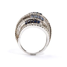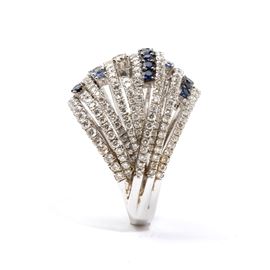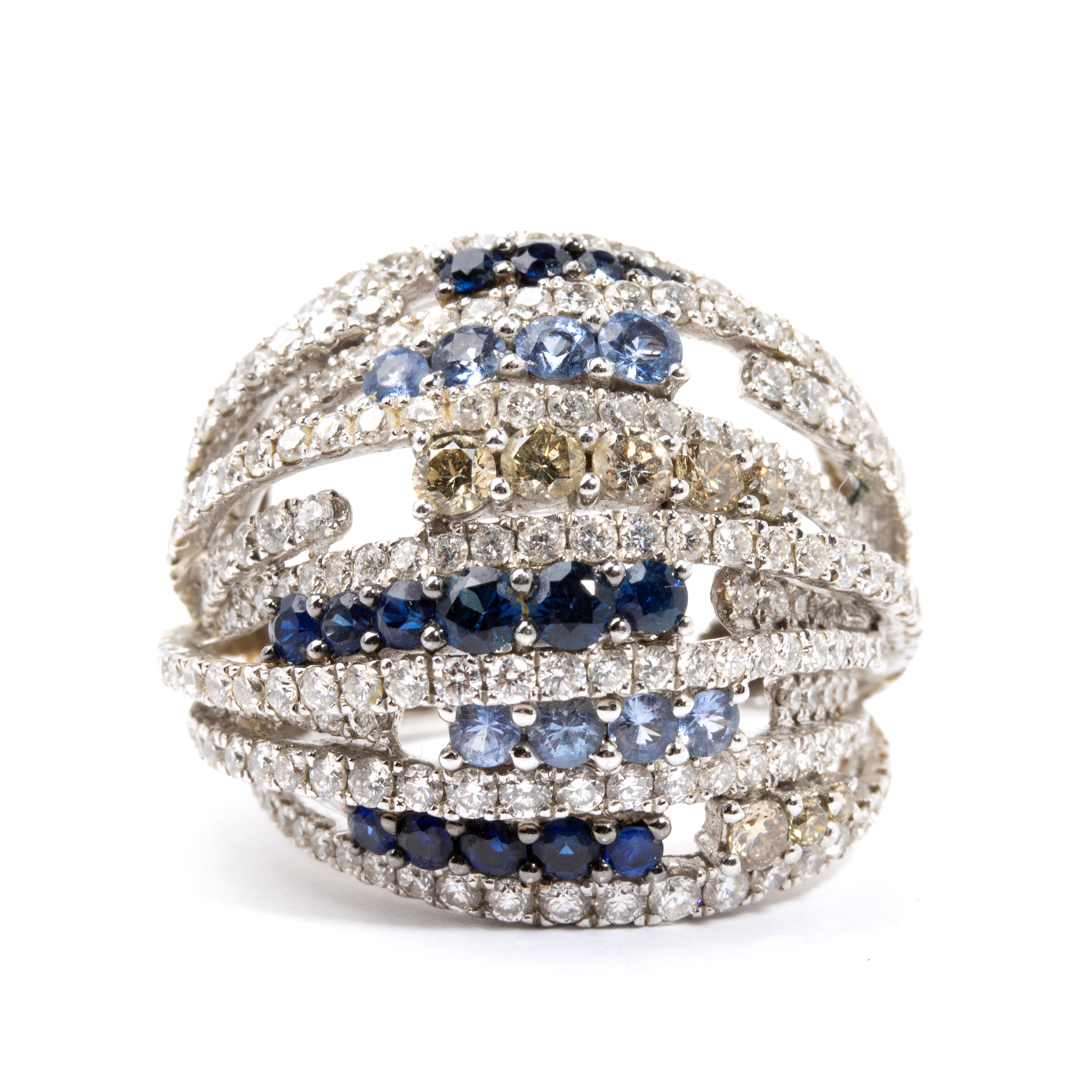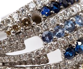 white gold, wopenwork band set with rows of colourless diamonds, fancy-coloured brown diamonds and sapphires.