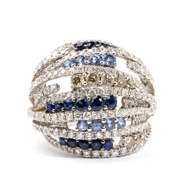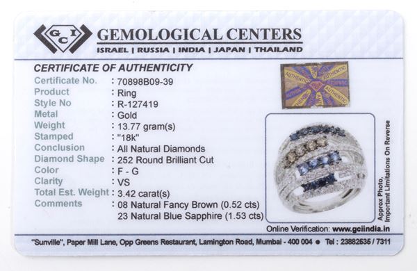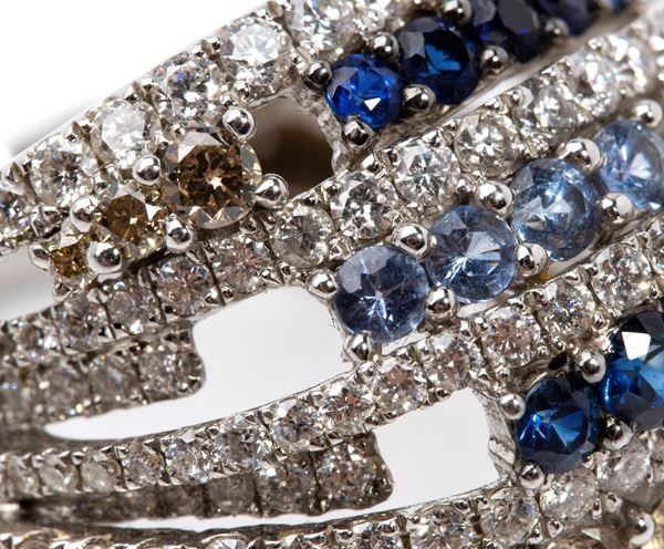 N. 252 round brilliant-cut diamonds, estimated to weight a total of approximately 3.42 ct, colour F-G, clarity VS, n. 8 fancy brown diamonds, estimated to weight a total of approximately 0.52 ct, and n. 23 round composite-cut sapphires, estimated to weigh a total of approximately 1.53 ct, as measured and graded in the mount.