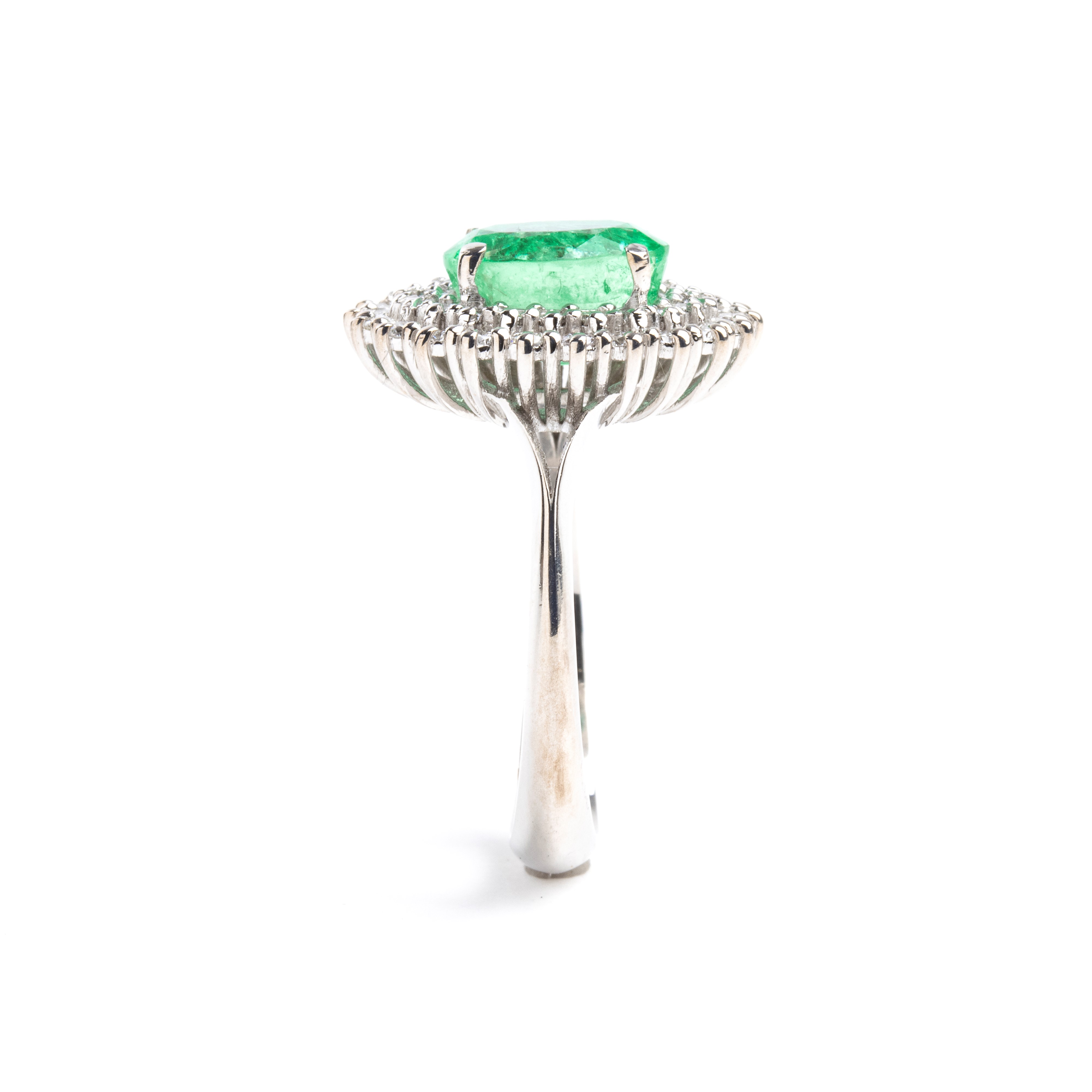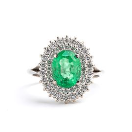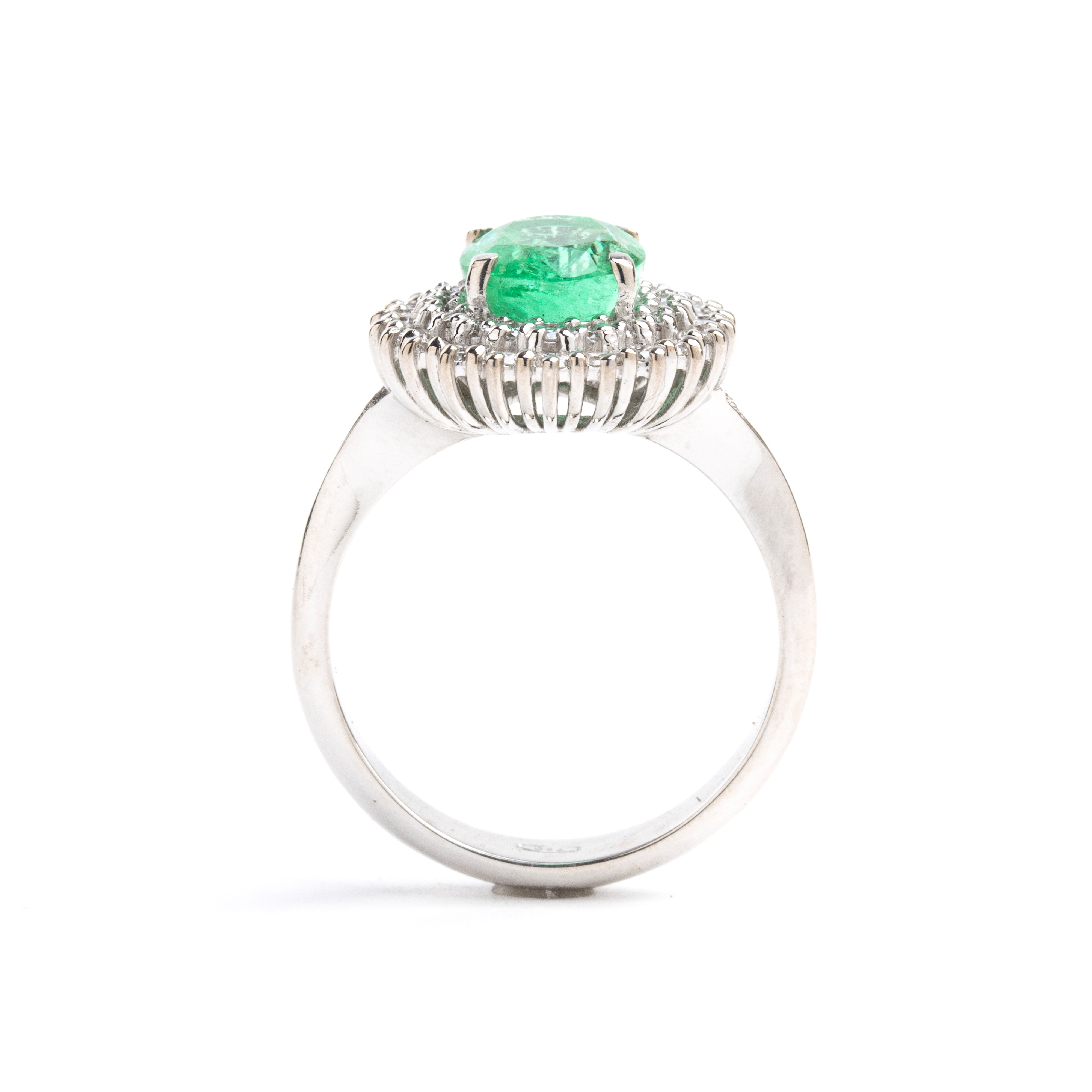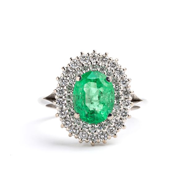 18k white gold ring, set with an oval emerald framed by a double row of diamonds.