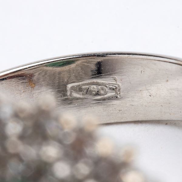 N. 42 round-shaped, brilliant cut diamonds, estimated total weight approx. 0.80 ct, colour G-H, clarity VS-SI, and n. 01 oval emerald, composite cut, weighing approx. 2.00 ct, as measured and graded in the setting.